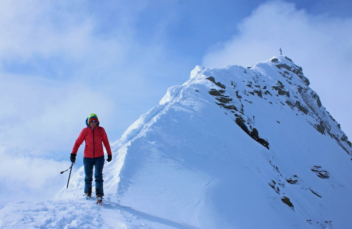 Der Gletscher ist gut eingeschneit und kann wie üblich ohne Seilausrüstung begangen werden. Für den Gipfelgrat sind Pickel und Steigeisen hilfreich.