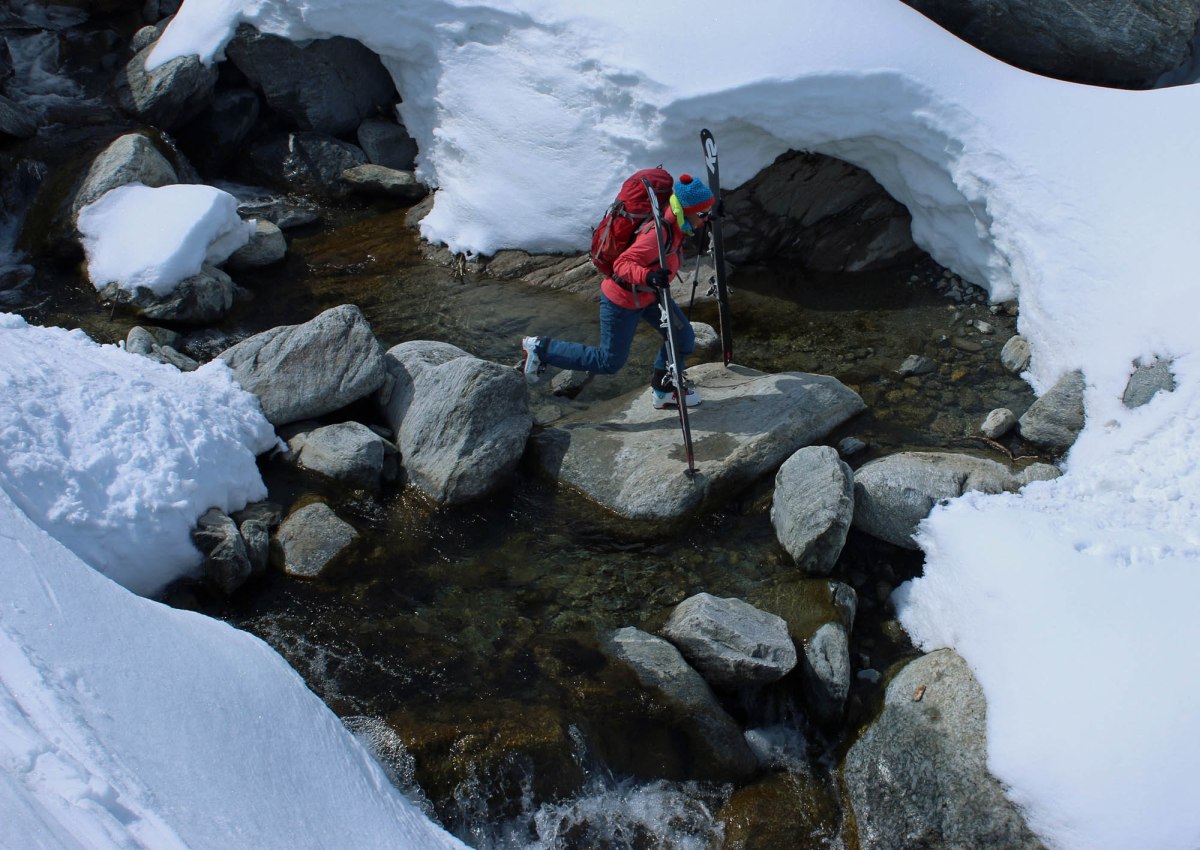 Ab Curaglia muss man nur 10 Minuten die Ski tragen. Dann gibt es ausreichend Altschnee und vor allem auf den nordseitigen (Gletscher)Hängen eine schöne Pulverschneeauflage. Weiter unten trifft man aber auch Bruchharsch.