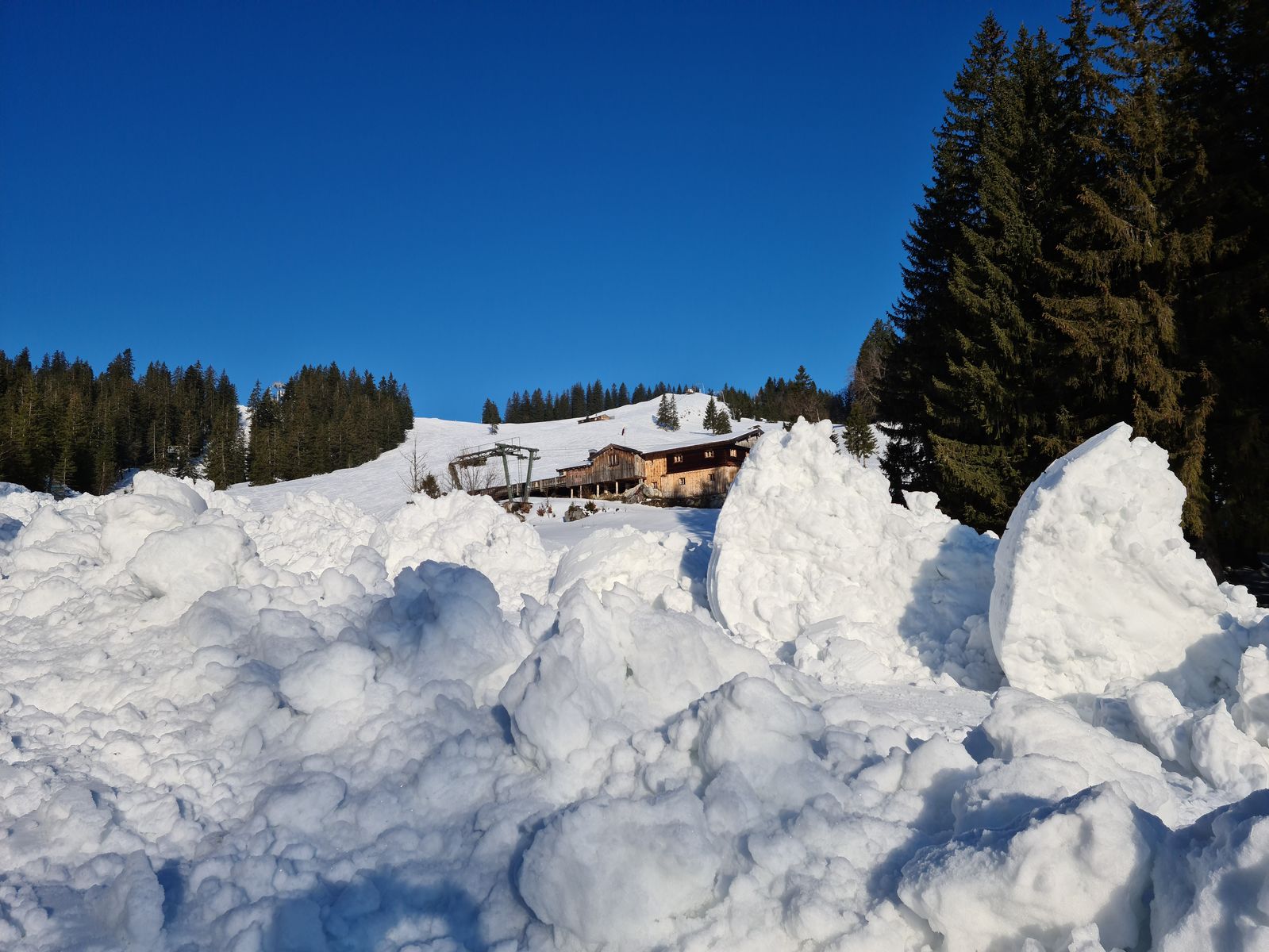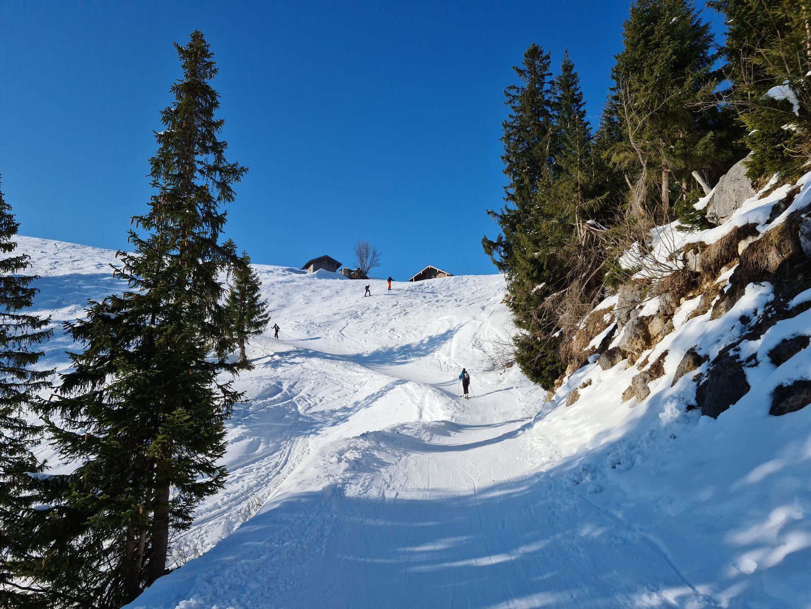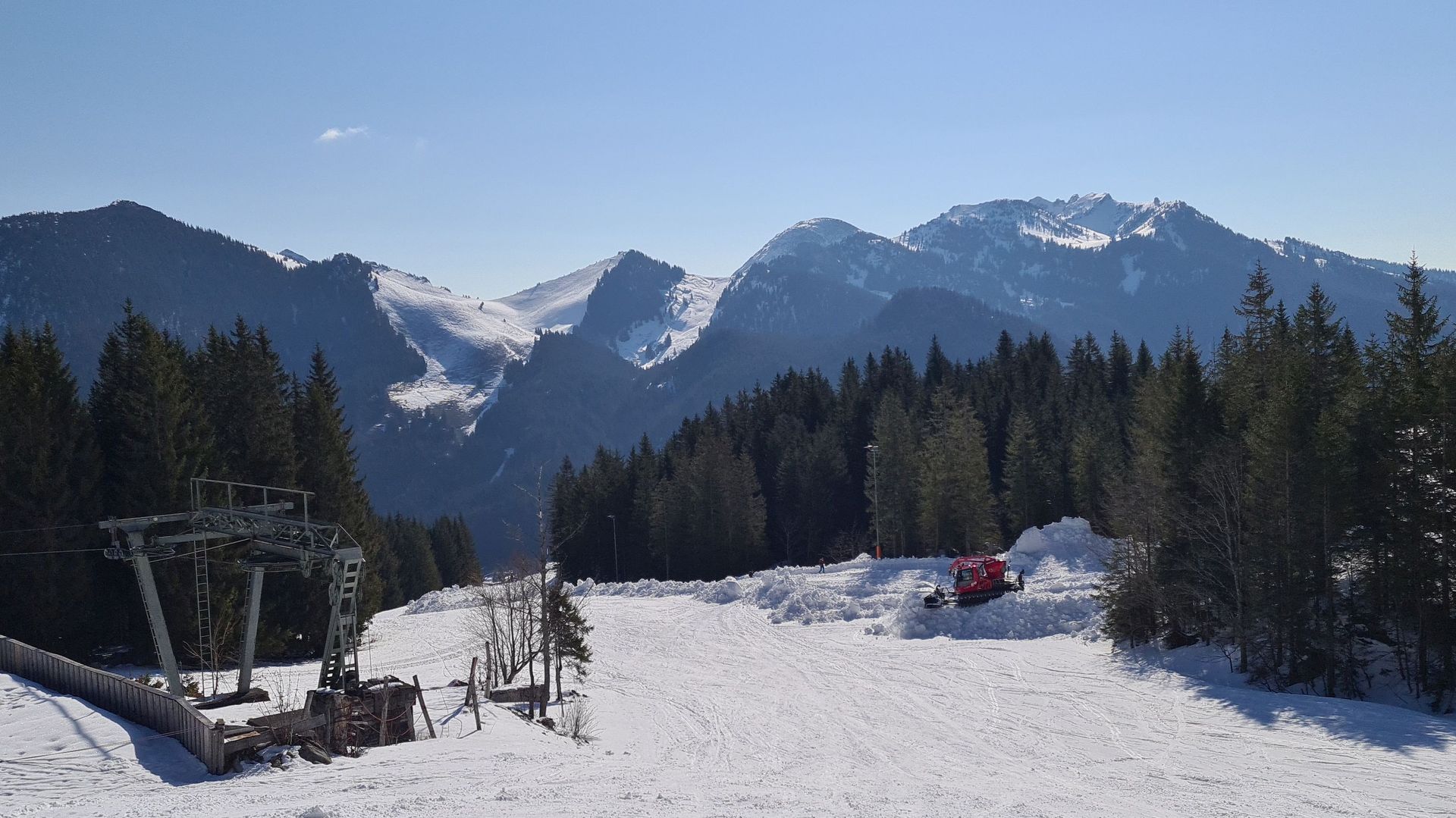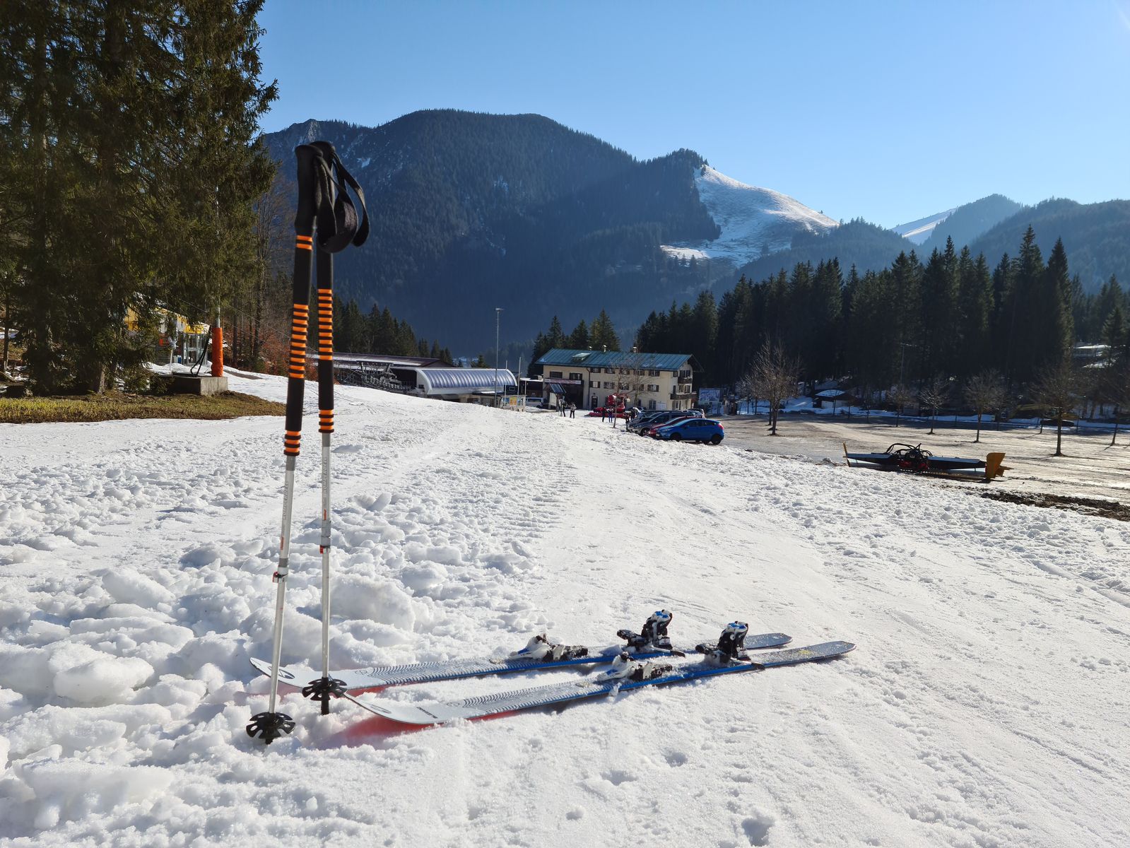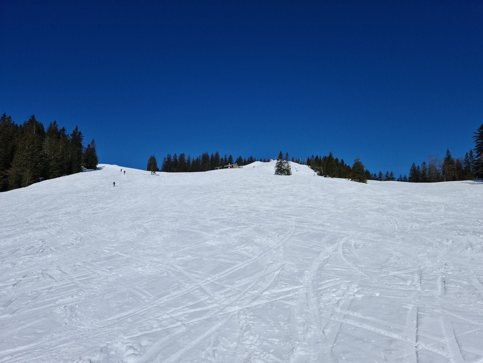 Viel Schnee bis zum Parkplatz hinunter. Praktisch keine aperen Stellen. Aufstieg über die morgens noch sehr harte Piste und den von Pistenraupen freigeräumten Forstweg auf griffigem Schnee.