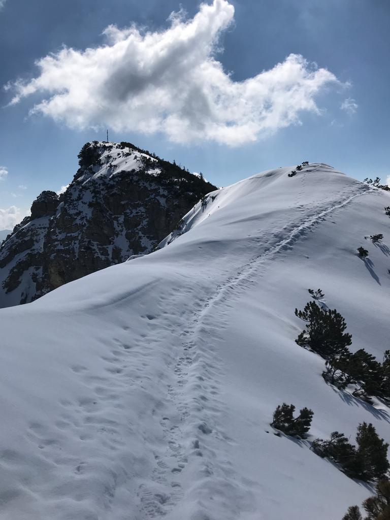 Start um 7 Uhr am Spitzingsee mit den Rädern, da die Mautstraße in die Valepp noch gesperrt ist. Straße ist aber bis zum Zusammenfluss von Roter und Weißer Valepp schneefrei, dennoch vorsichtig fahren, teilweise ist die Straße am Morgen überfroren. Insgesamt nur kurze Tragestrecken im Bereich der Schlagalm. Im Kar reichlich Schnee, der bei der Abfahrt schön aufgefirnt hat. Schindertor ist passierbar, oberhalb ziemlich hart, aber nicht eisig.