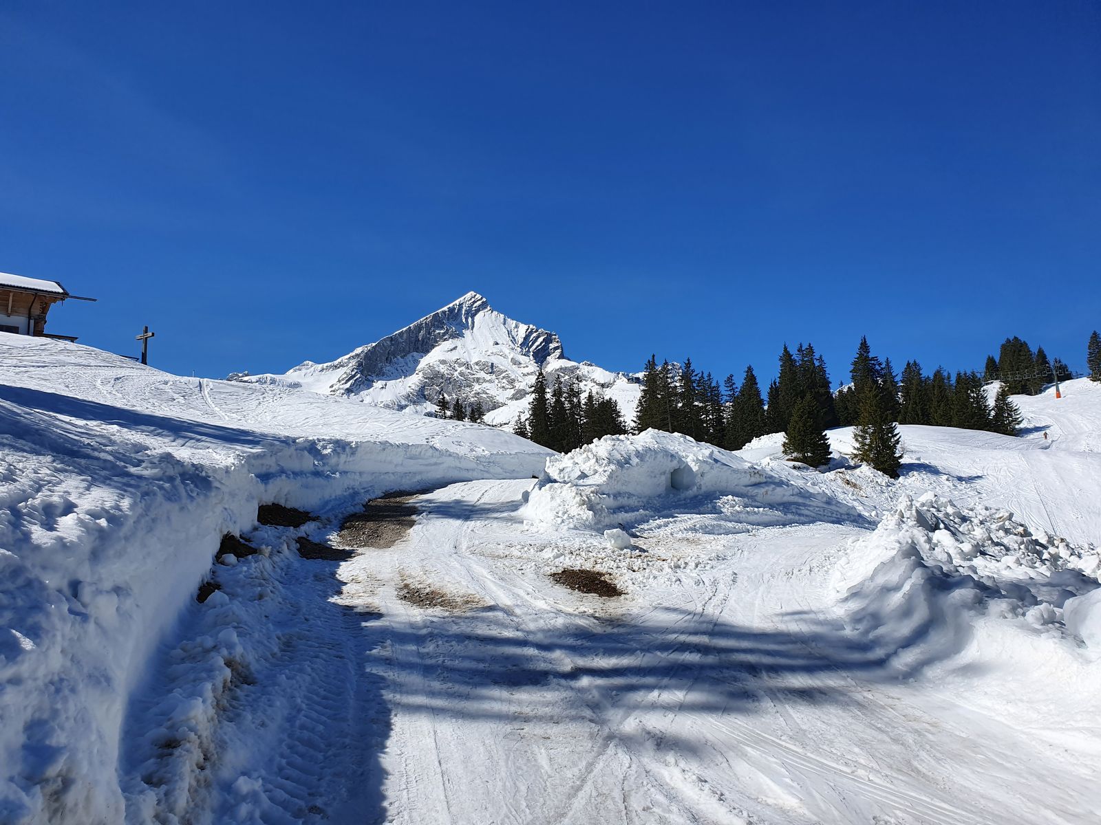 Weiter ab Hochalm zum Osterfelder: Fahrstraße noch begehbar aber nicht durchgängig abfahrbar. Hier ist das Problem, dass bei der Abfahrt gutes Timing nötig ist, damit man nicht die 2m-hohen senkrechten Seitenwände der Fahrschneise runterspringen muss. Außerdem sind die Schneebollen am Seitenwandbereich sehr hart. Wenn man sich beim AUfstieg die Stellen gut merkt, wo man die Seiten wechseln kann, ist sicher hilfreich. Mir ist das nicht immer gelungen.