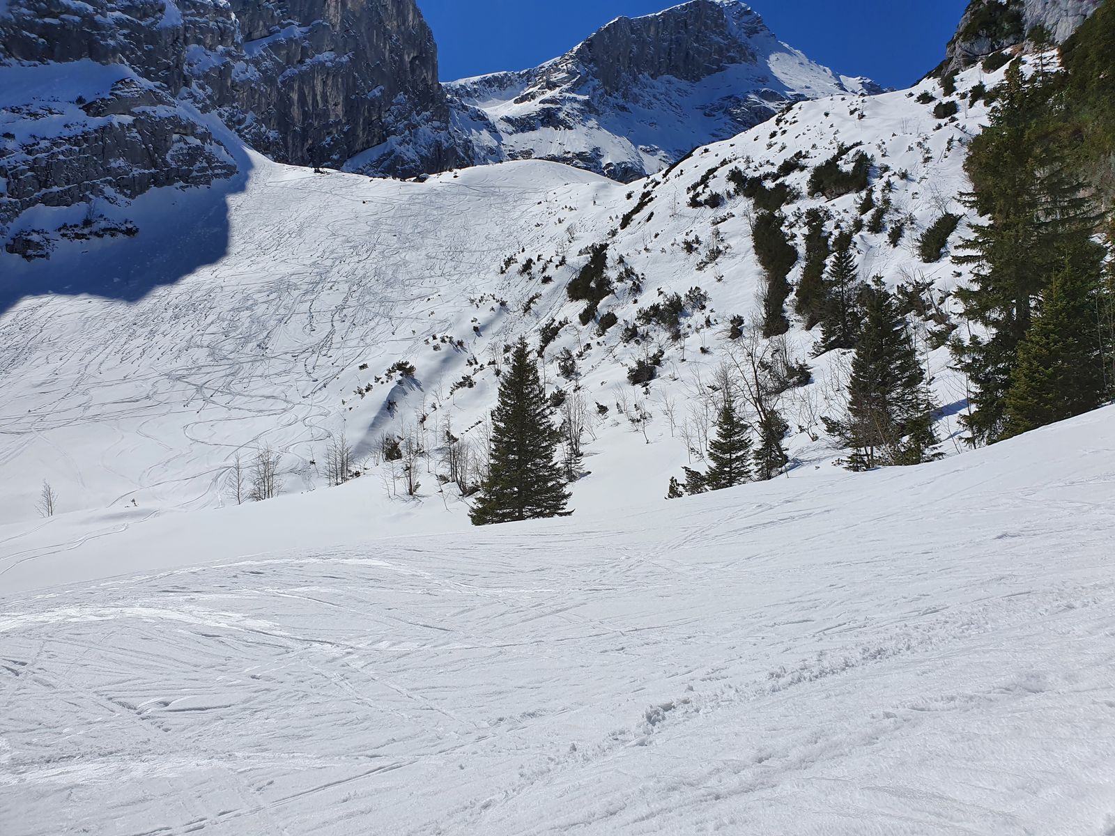 Abfahrt vom Osterfelder bis kurz vor (ca. 100m vorher rechts weg) Bernadein und den Tourenhang anstatt Piste runter: komplett eingeschneit, weicher Schnee. Die einzige Gesellschaft von mir waren kleine Schneekugeln, die ich losgelöst und die mich dann überholt hatten, meine Einschätzung: unkritisch.