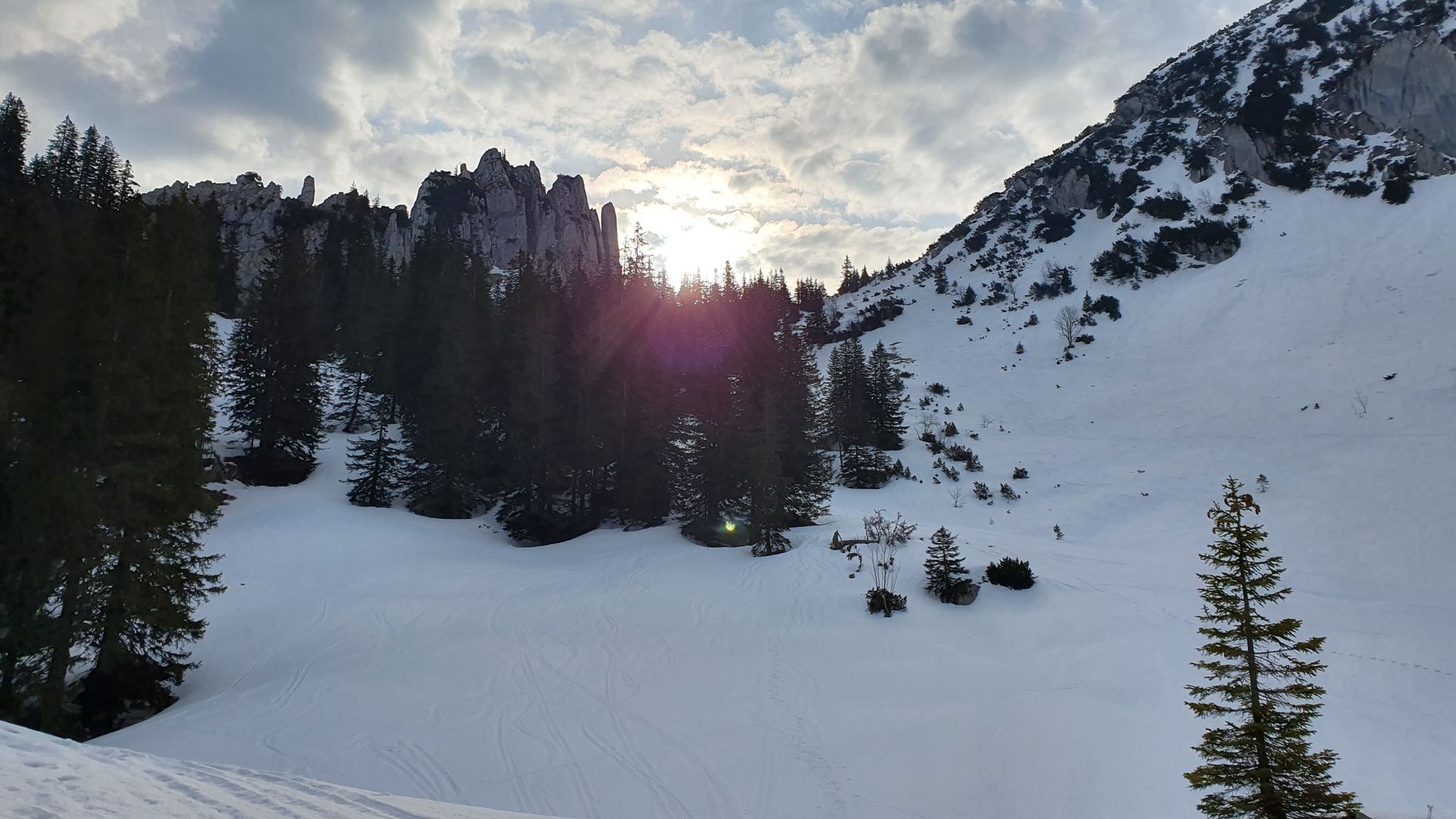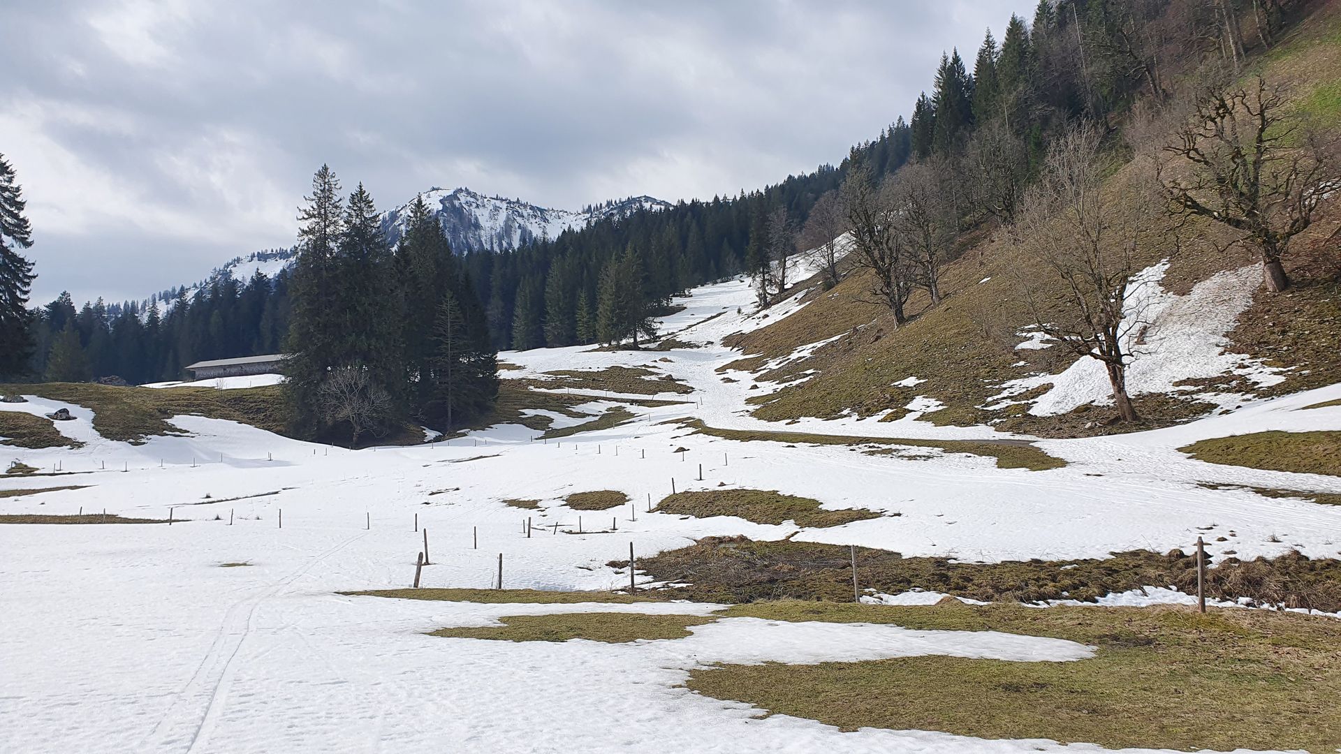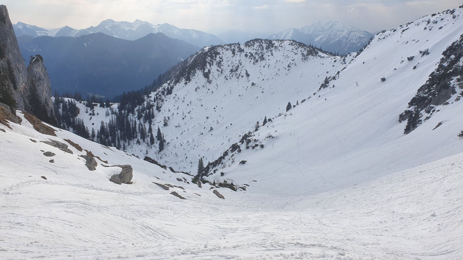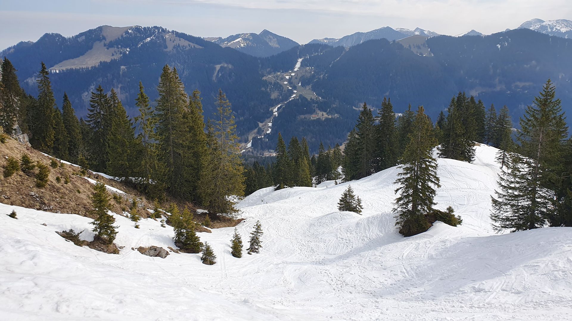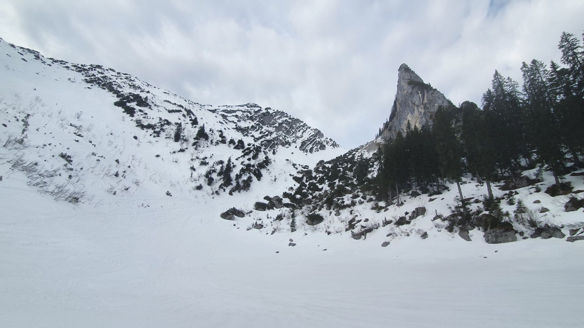 Heute auch noch die Runde gewagt. Leider war es heute zeimlich bewölkt und nicht so sonnig wie gestern am Sonntag. Aufstieg über die Röthensteinalm. Die Tragepassage hat sich nicht verändert und der Schnee beginnt immer noch hinter der Diensthütte. Aufgrund der fehlenden Erwärmung das Grubereck ausgelassen und gleich zum Plankensteinsattel. Ab und zu kam die Sonne durch und nach einigem warten wurde der Schnee auch weich. Gute Schneeverhältnisse in der Abfahrt. Störend waren nur die vielen Fußstampfer der Wanderer, die anscheinend am Wochenende das Massiv überrannt haben müssen. Kurzer Aufstieg zum Riedereck und über die Sieblialm zurück. Im Waldstück der Siebliabfahrt muß man sich etwas durchmogeln und auch kurz mal tragen. Auch hier wieder unmengen von tiefen Löchern, aber man findet auf der Tour noch glatte Firnstellen. Die Hänge bei der Alm gehen noch, werden aber vermutlich im Laufe der Woche ausapern. Abschwingen an der Diensthütte ist noch möglich.