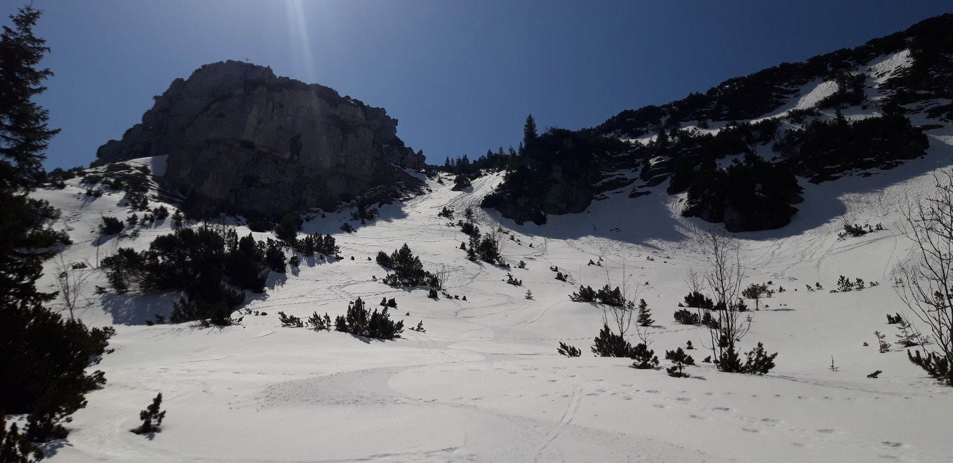 Auf Skiern ging es (mit einer kurzen Tragepassage) zum Sattel vor der Kesselwand und von dort hinunter zum Soinsee. Danach habe ich verschiedene Varianten rund um Seewand sowie Kesselwand gemacht. Der Schnee wies je nach Feinexpostion und Tageszeit diverse Formen von Firn und Sulz auf - nur die letzte Abfahrt durch das Lacherspitz-Ostkar hatte gegen 14 Uhr schon Faulschnee. Die Abfahrten sind zwar kurz (kaum mehr als 100 Höhenmeter), aber doch spaßig und (im Bereich der Seewand) recht steil; beim Aufstieg braucht es viele viele Spitzkehren, da die Latschengassen oft recht schmal sind. Außer mir war heute niemand hier auf Skiern unterwegs und auch sonst hielt sich der Andrang sehr in Grenzen.