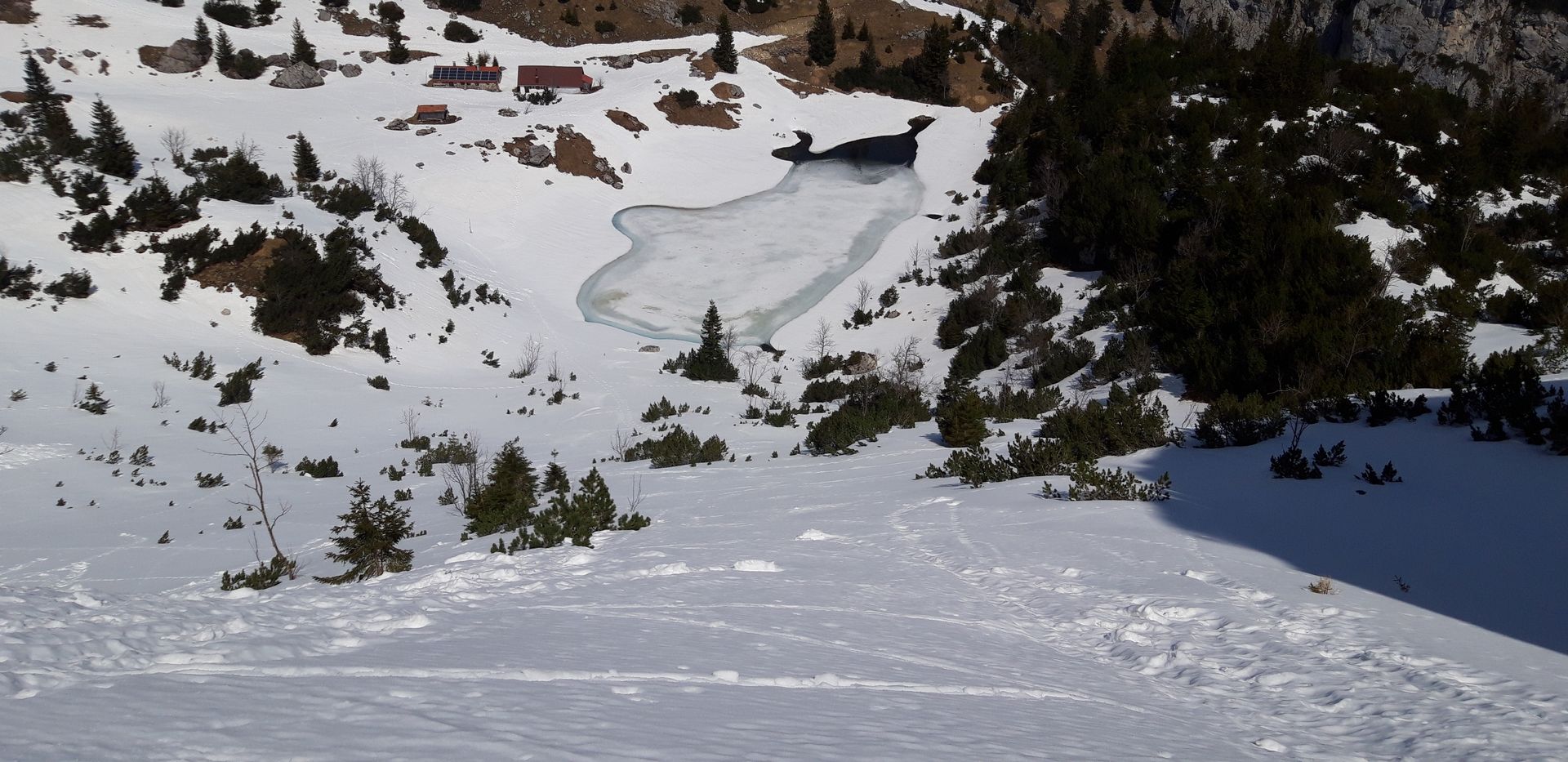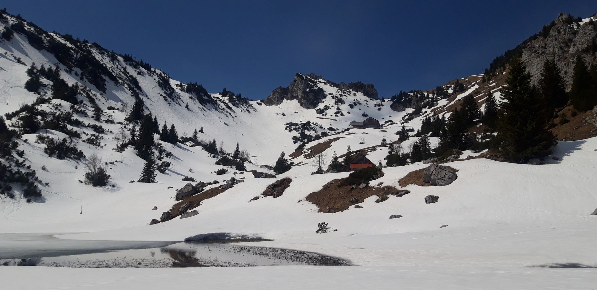 Neben dem schönen Wetter und der Einsamkeit warteten auch Fauna und Flora mit einigen Glanzlichtern auf: Beim Aufstieg wandert man durch ein Meer aus Krokussen, auch die ersten Enziane und andere schöne Blumen zeigen sich bereits. Und am Soinsee gibt es ein Schauspiel ganz eigener Art zu bewundern: Obwohl erst etwa 1/10 des Sees eisfrei ist, tummeln sich hier tausende (ich übertreibe sicher nicht) Frösche in angeregtem Liebesspiel, wobei mir etwas schleierhaft ist, wie man bei etwa 3-4 Grad Wassertemperatur dermaßen in Fahrt kommen kann... Auf jeden Fall wird diese hormonbedingte Unaufmerksamkeit dann auch gnadenlos von verschiedenen Greifvögeln ausgenutzt, die in den Bäumen rund um den See sitzen und nur darauf warten, sich die leichte Beute zu holen.