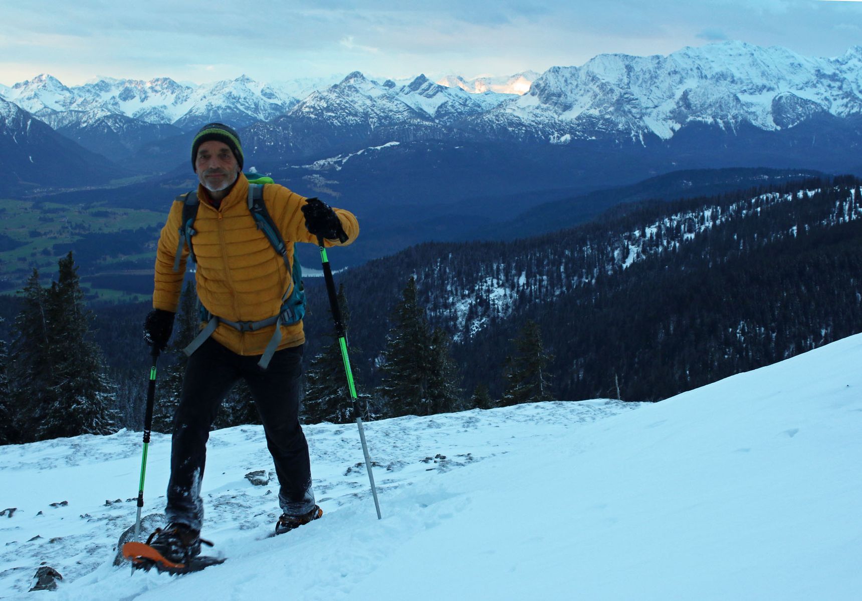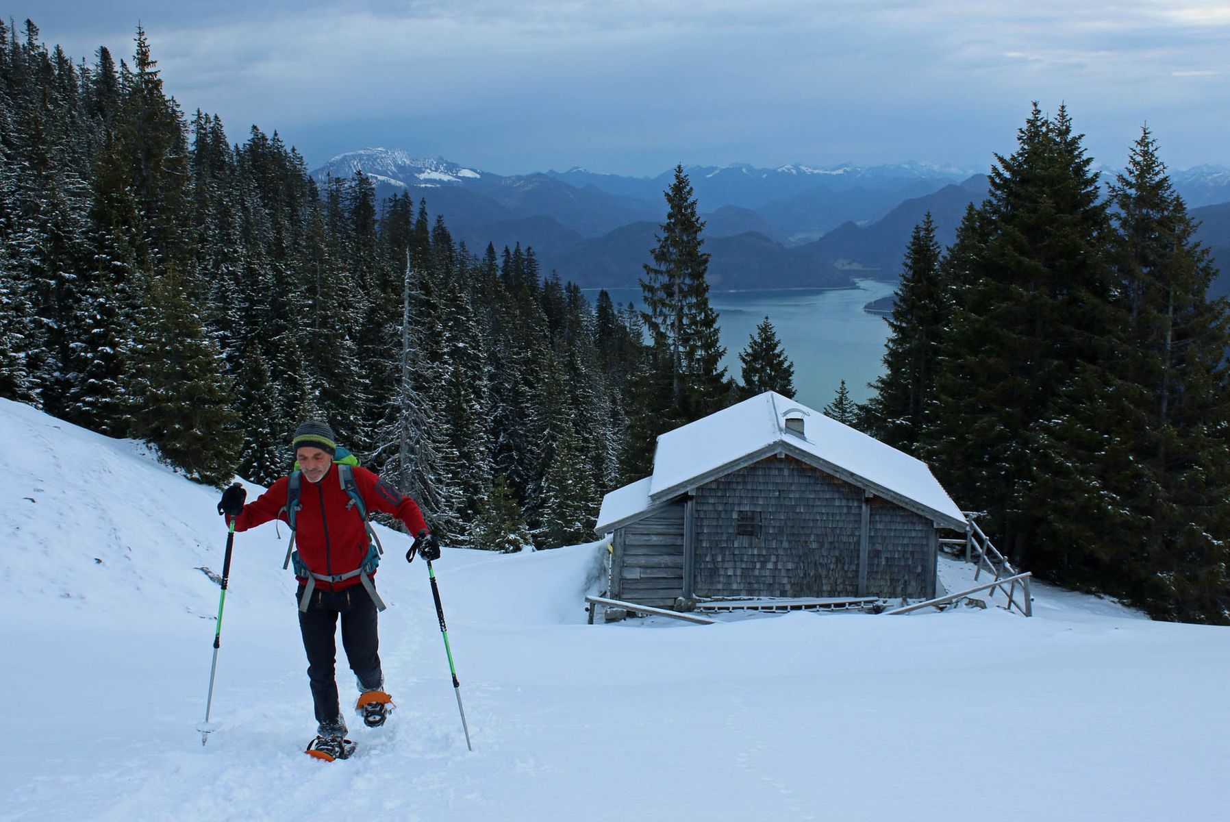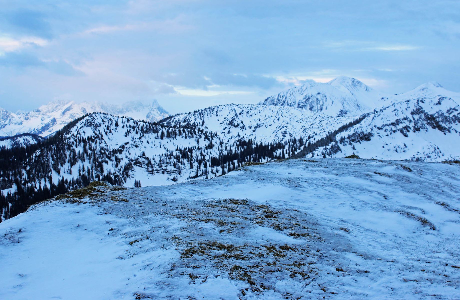Ab etwa 1500 m liegt im Wald eine immer wieder geschlossene (tragende) Altschneedecke, die mit bis zu 5 cm Neuschnee überzuckert ist. Oberhalb der Diensthütte dann im freien Gelände Verwehungen, weswegen die Schneeschuhe wirklich hilfreich waren.