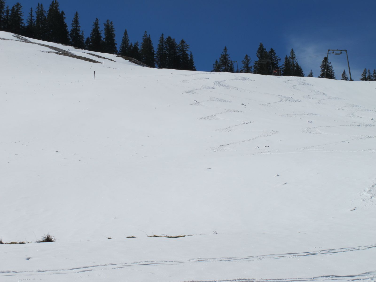 Dann weiter über Stümpfling zum Roßkopf. Roßkopfnord noch sehr gute Buckelpiste, dann weiter rechts der aufgeschobenen Straße und weiter zum Kurvenliftparkplatz. Am Schluß nur noch rechts am Wald ein Schneestreifen, aber immerhin fast bis zur Liftstation.