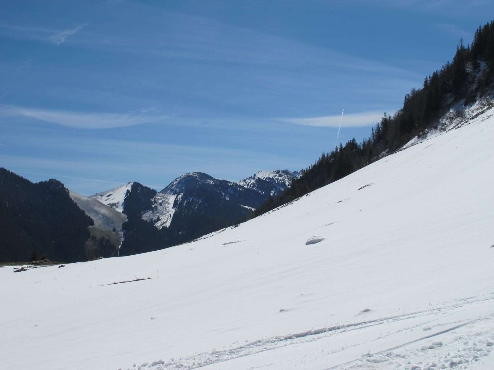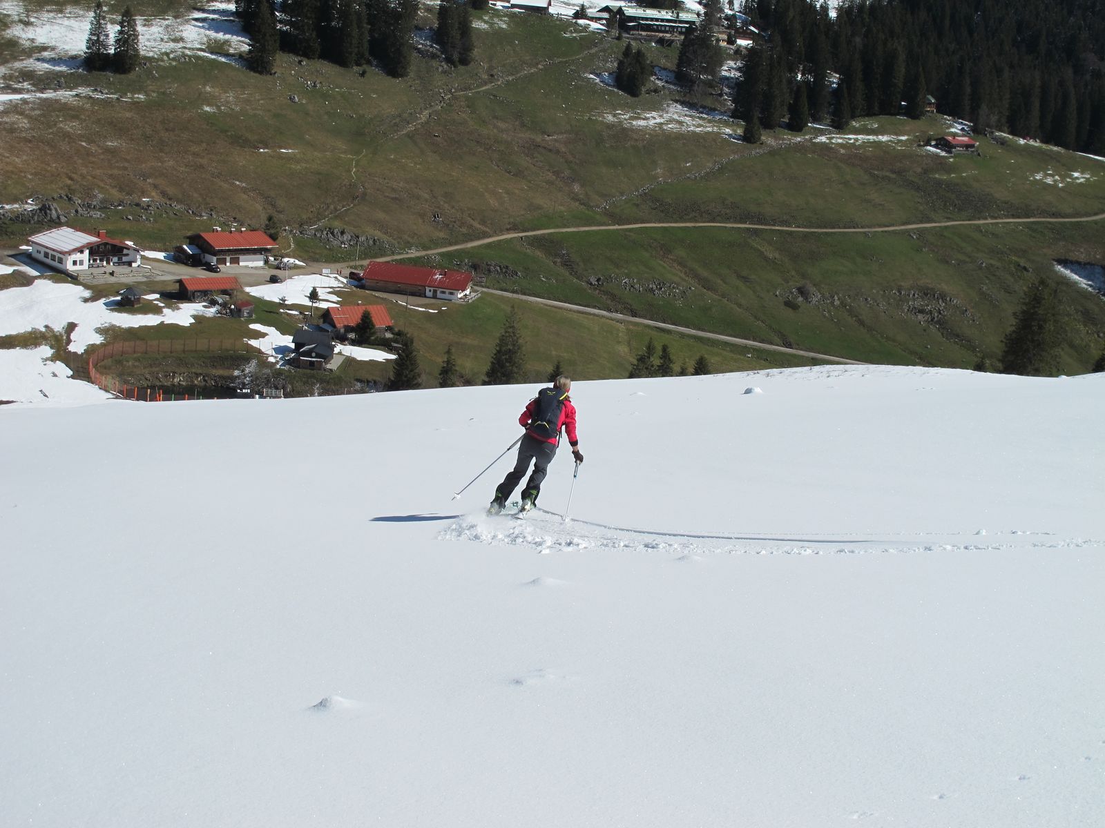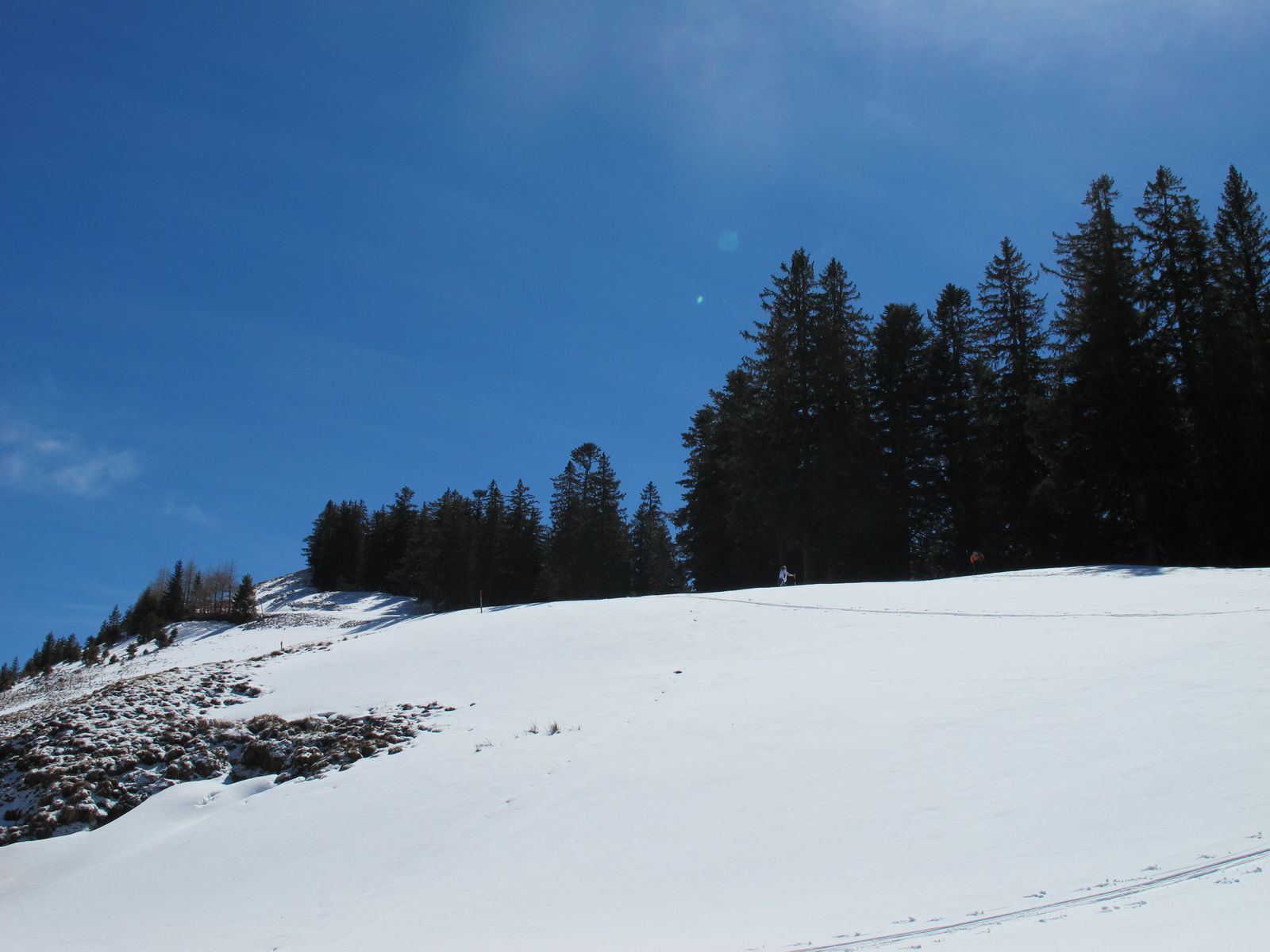 Eigentlich wollten wir was anderes machen, waren aber zu spät dran. Also Roßkopf über Dreitannenabfahrt( Ab Bergwachthütte Schnee, zwei kurze Tragestücke im Wald, sonst noch durchgehend Schnee.
