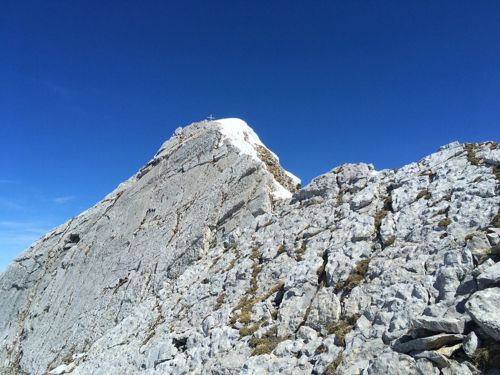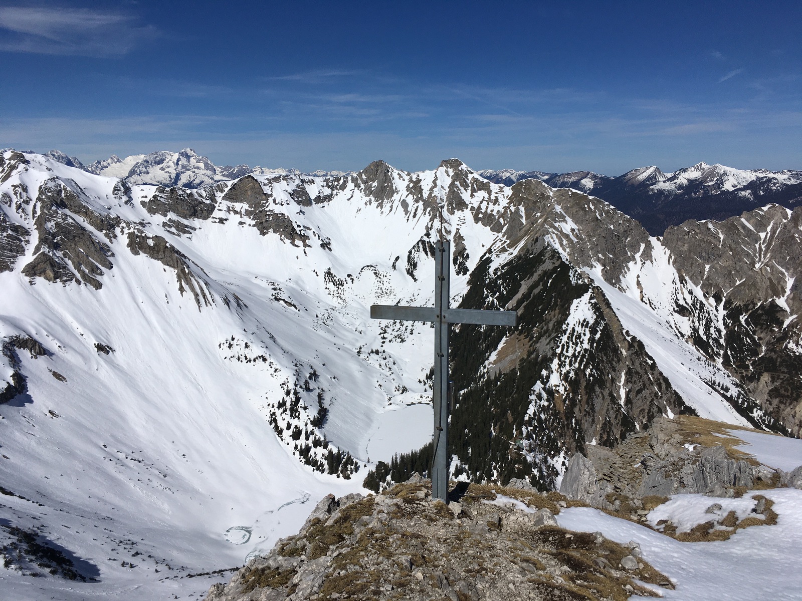 Blick über das vorgelagerte Kreuz auf der Gumpenkarspitze: