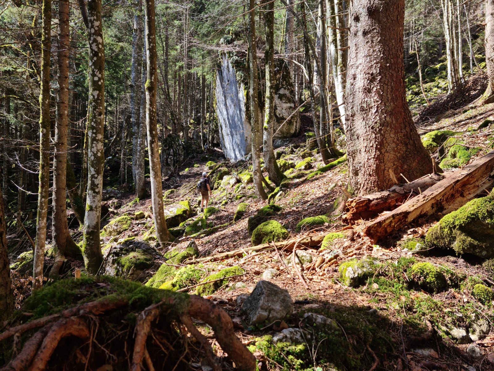 Von der Haidenholzalm sind wir über die Forststraße bis auf 1060 m abgestiegen und auf einem kleinen Pfad an der Bergflanke unterm Spitzberg praktisch ohne Höhenverlust in Richtung Rupprechtshütte gegangen. Noch vor Erreichen der Hütte sind wir dann steil hinunter bis zum Schneiderhanggraben, dann erst auf gleicher Höhe und am Ende 60 m hinauf zum Berghotel Breitenstein. Die Bergflanken durch den wunderschönen Buchenwald waren trocken und schneefrei.