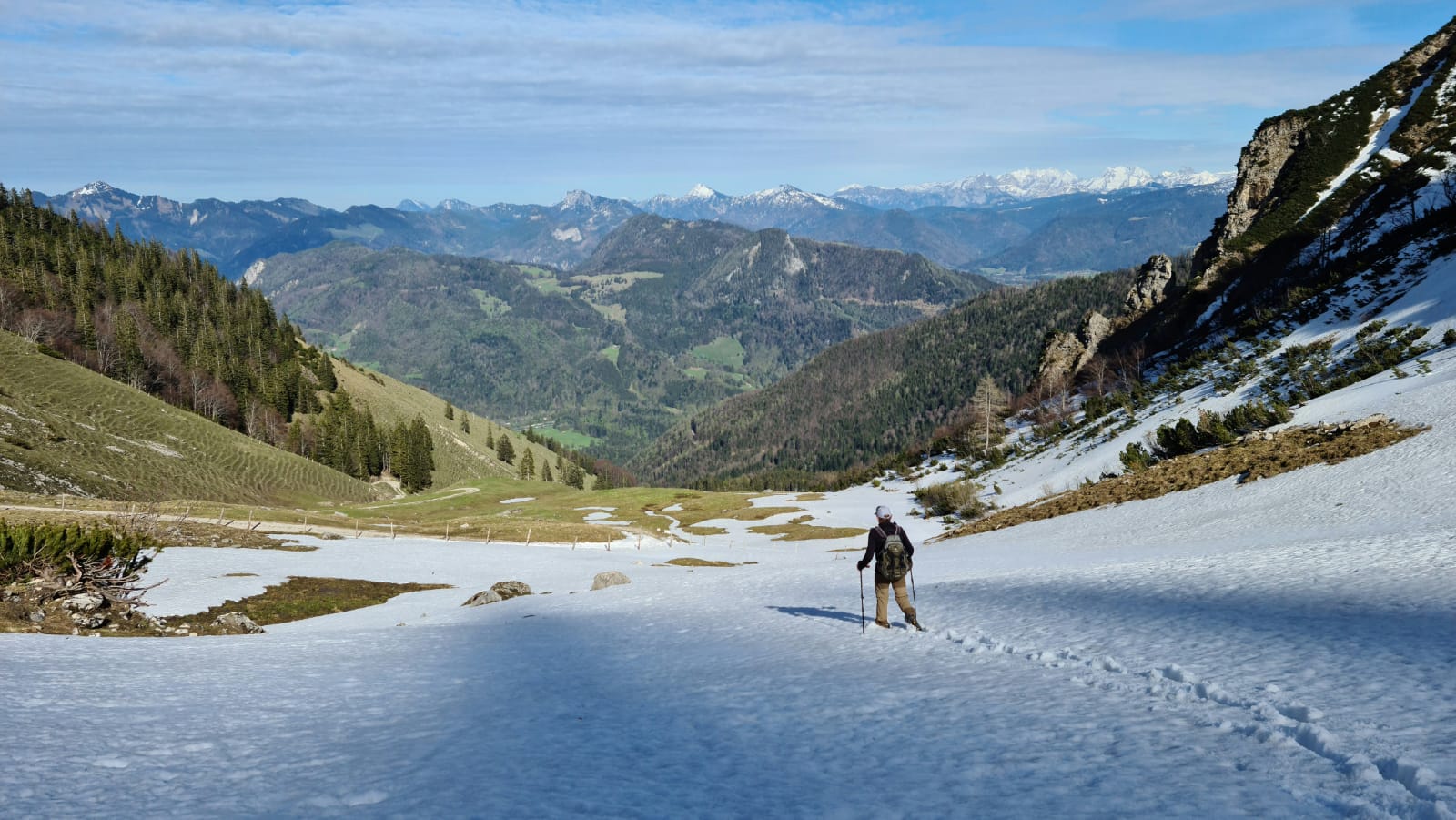 Kurz vor der Wirtsalm ab ca. 1400 m gibt es dann einzelne Schneefelder. Entsprechend matschig und nass entwickelt sich der weitere Aufstieg. Der Weg am Gipfelgrat durch die Latschen ist aber praktisch schneefrei und trocken. Oben dann dank dem Föhn der super Blick in alle Richtungen.