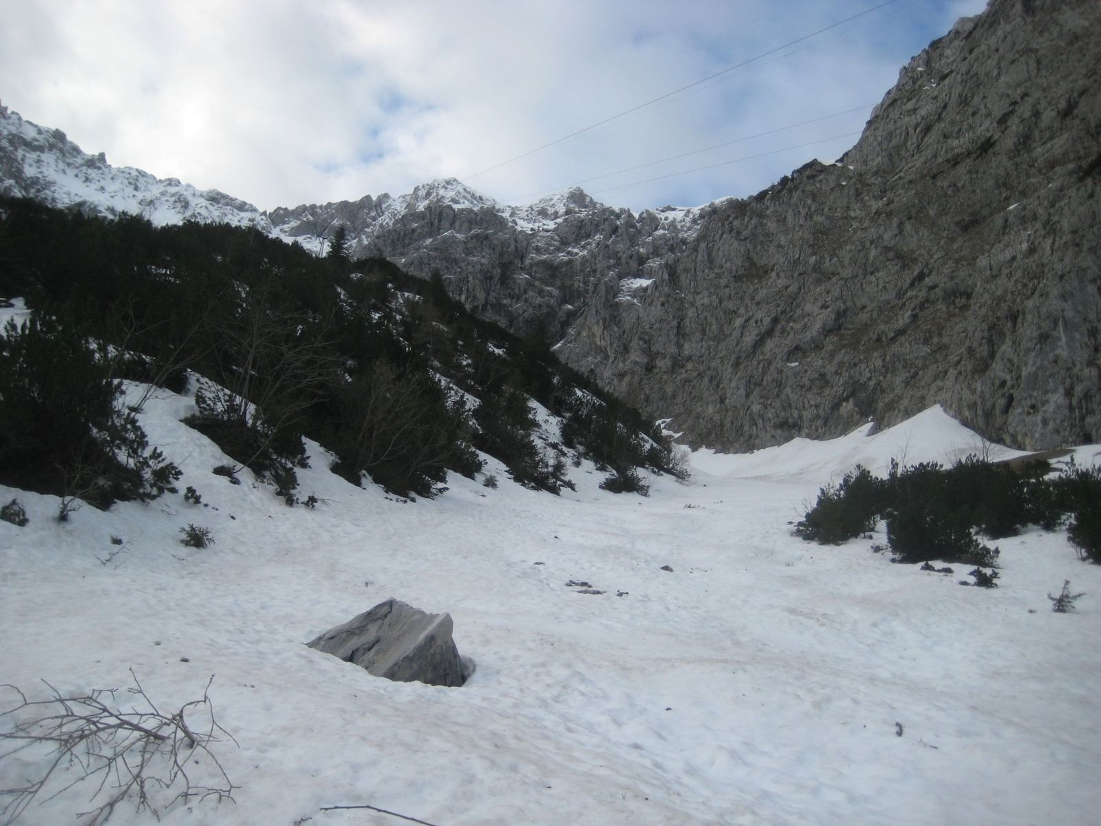 Heute wollte ich versuchen, 2 Ziele zu kombinieren: Das Dammkar zu erkunden (ob sich noch eine Schitour lohnt) und einen Versuch unternehmen, die Tiefkarspitze über die Westrinne zu besteigen. Da ich schon wusste, dass man mindestens eine Stunde die Schi tragen muss, wollte ich wissen, ob es sich lohnen würde (mein Radl passt nicht gut ins Auto).