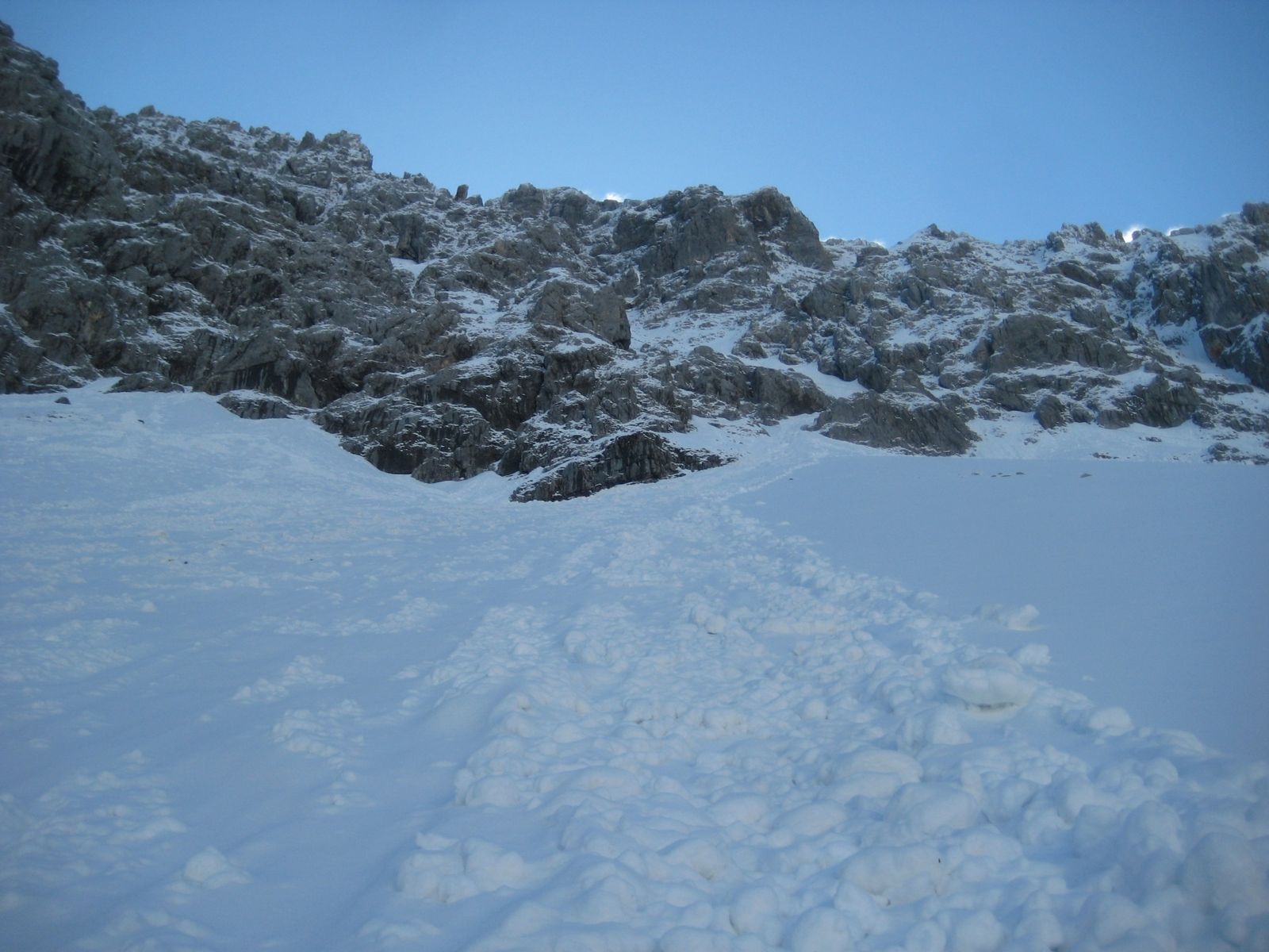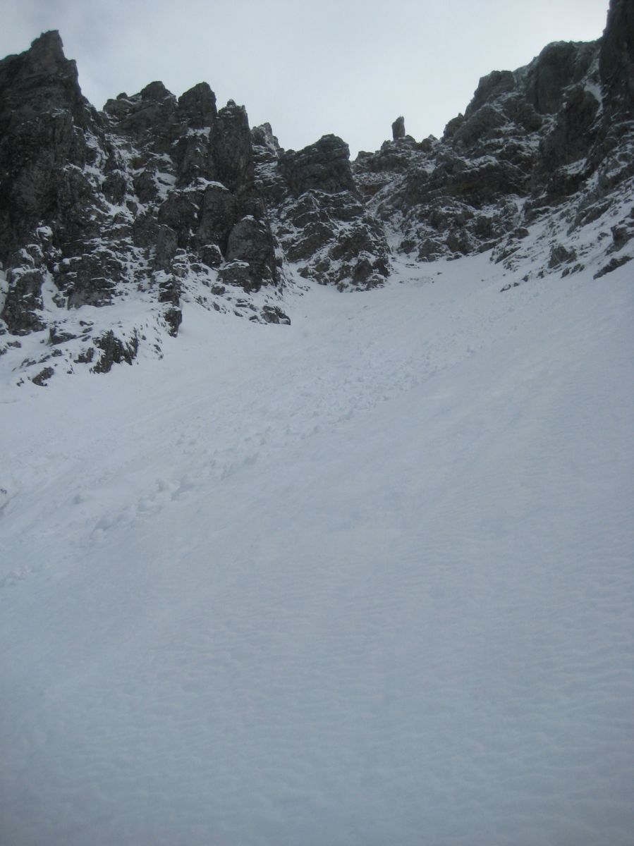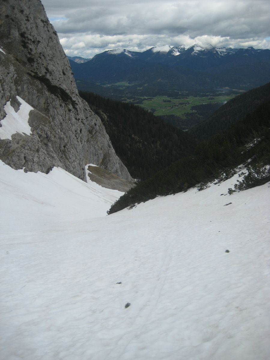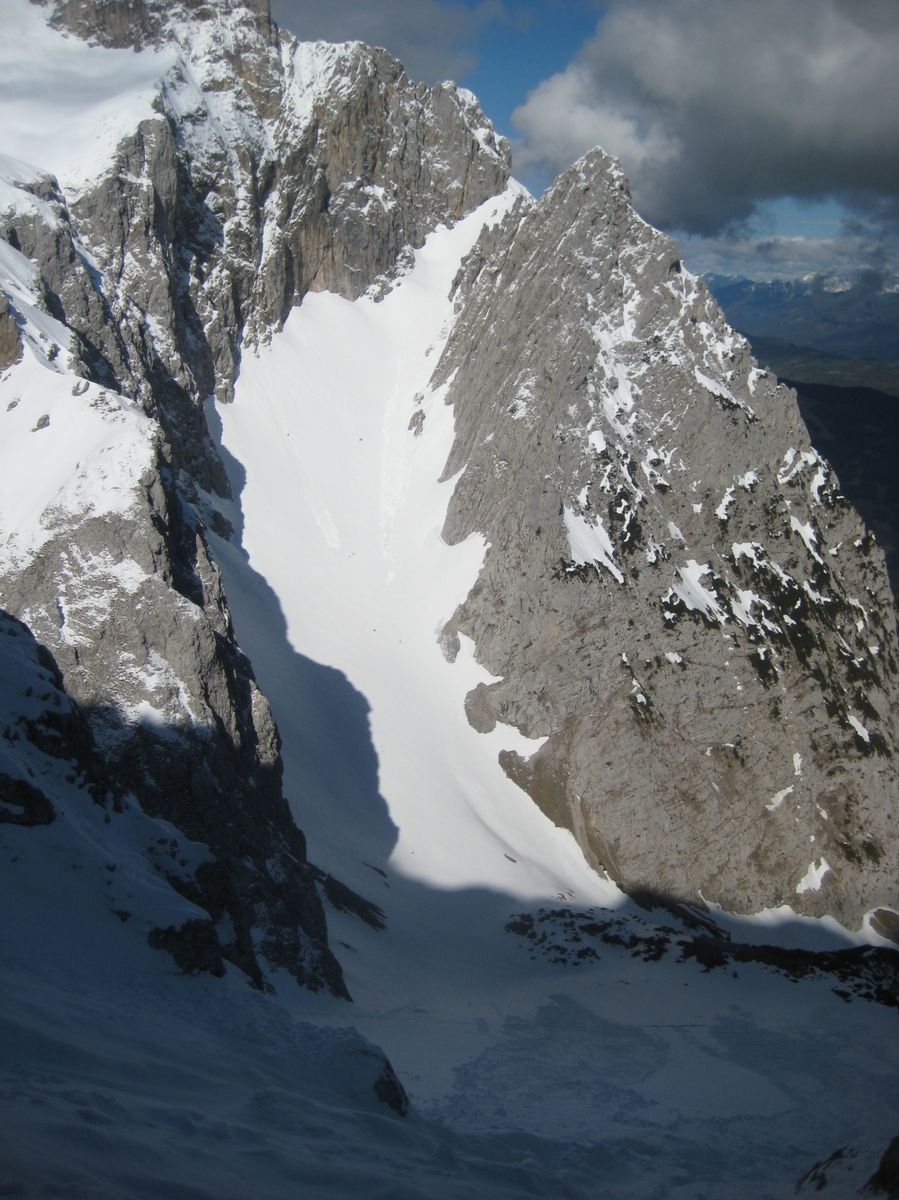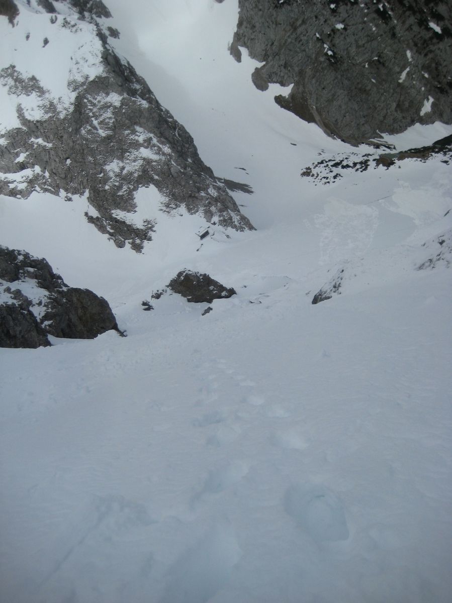Ohne Schi war ich der einzige, es waren nur Anzeichen von Fußspuren bis zur Dammkarhütte zu sehen, danach keine mehr. Die Verhältnisse waren an sich gut in der Rinne (meistens Trittfirn). Aber durch die Spurerei war ich zu langsam und ich bin auf ca 2200m umgedreht. Da es nachts nicht durchgefroren hatte, wurde mir dann irgendwann das Steinschlag-Risiko zu groß. Vielleicht hat ja jemand Lust, den Rest der Rinne zu spuren und sagt mir danach Bescheid? Dann versuch ichs evtl nochmal, mit einem noch früheren Start ![]()