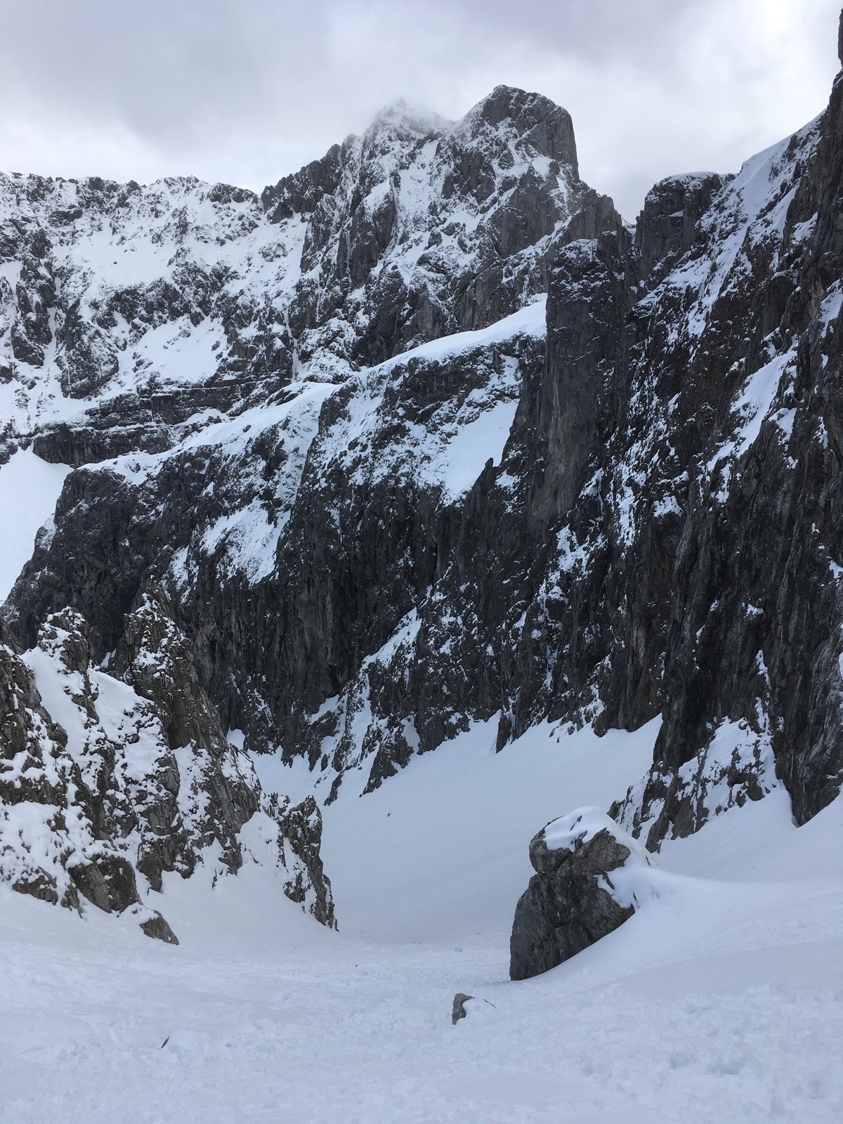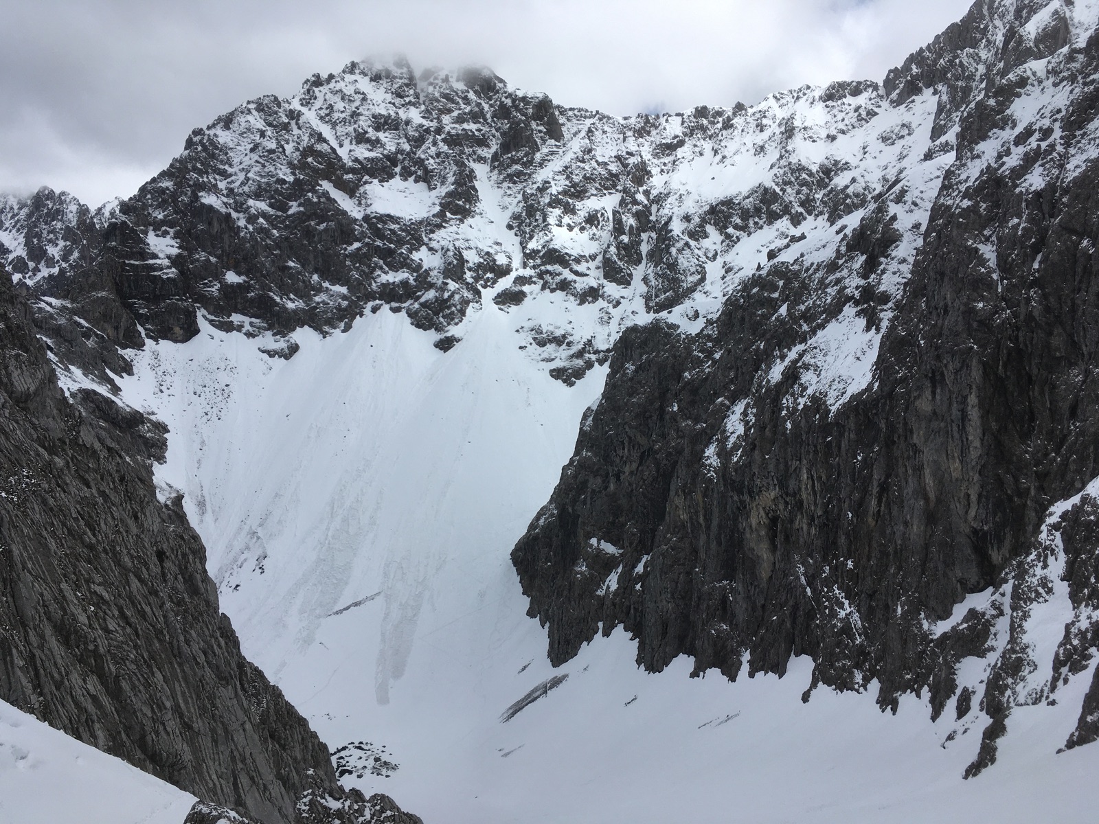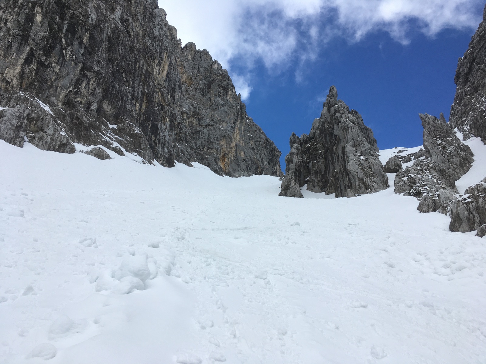 Schnee gibt es von und bis zum Bankerl. Der erste Hang hat aber doch an einigen Stellen nur noch eine recht dünne Schneedecke. Von der Konsistenz ist es zwar noch nicht direkt Sommerschnee, geht aber schon in die Richtung. Im Vorderen Dammkar war dann der tiefe, nasse Schnee mühsam hoch zu spuren. Hinunter ging es aber mit der nötigen Rücklage trotz Abfahrt nach Mittag dank der Steilheit doch passabel. Im Kanonenrohr sogar gut. Und geregnet hat es dann während der ganzen Tour auch nicht, zeitweise kam sogar die Sonne durch.