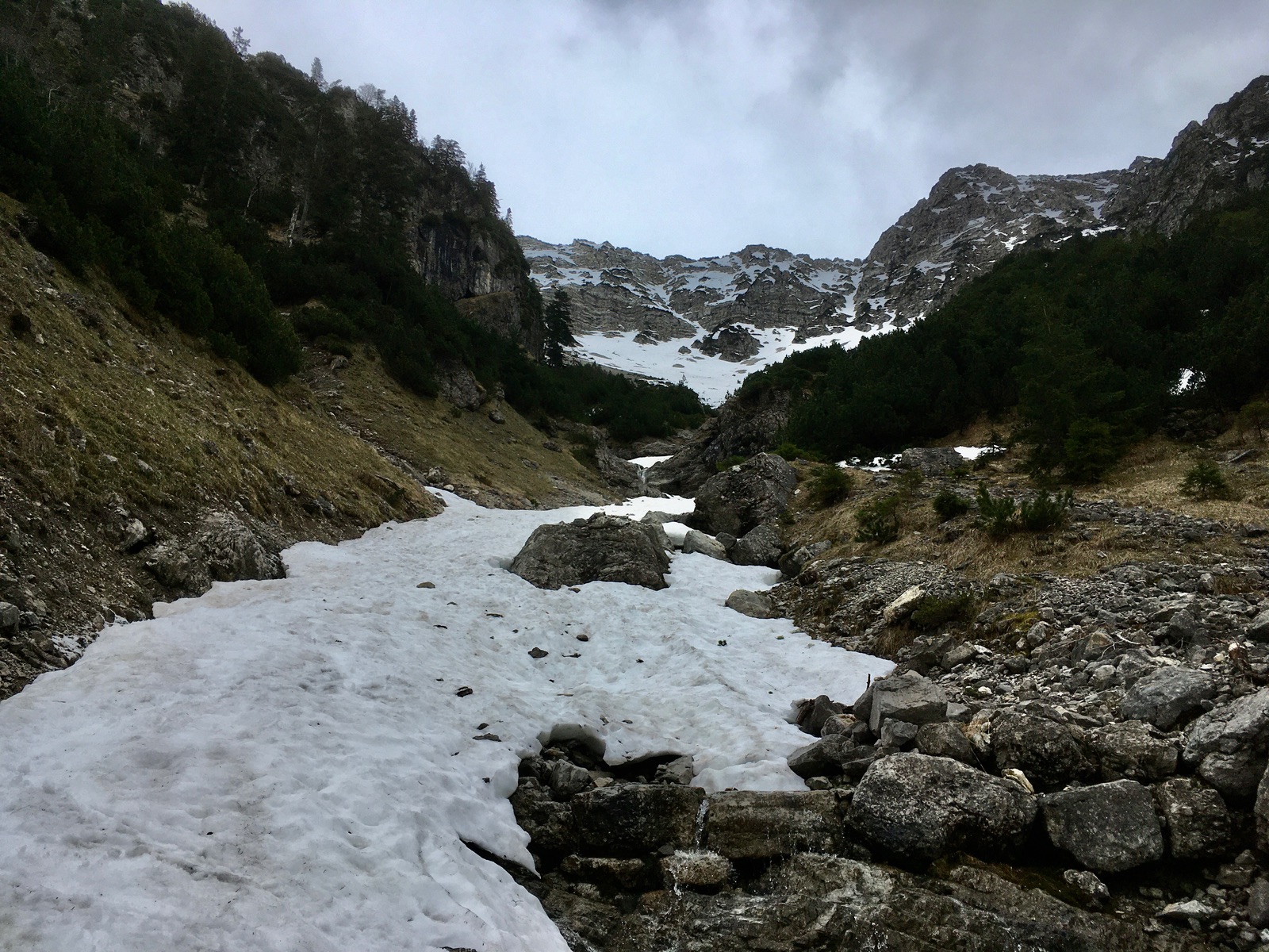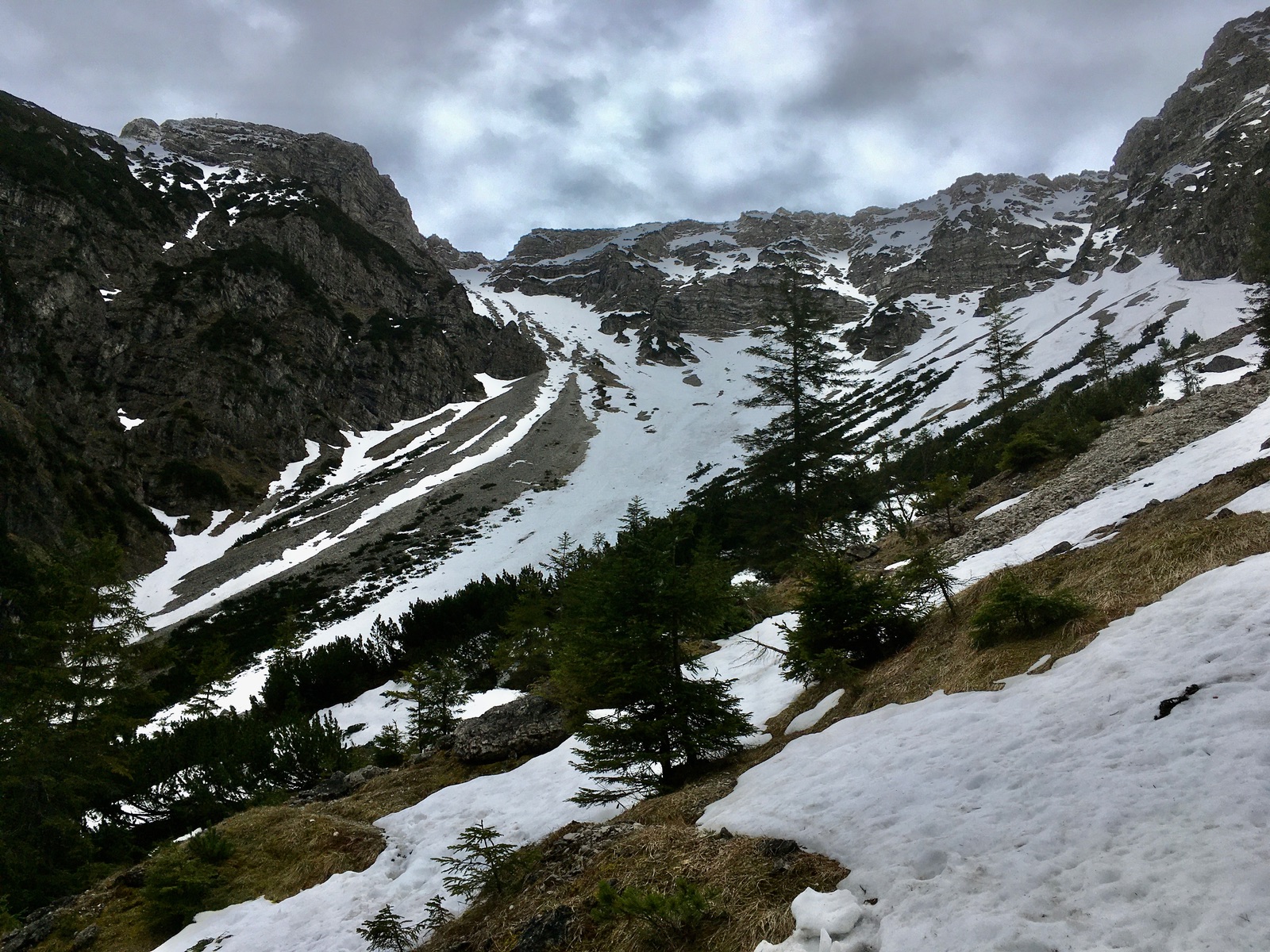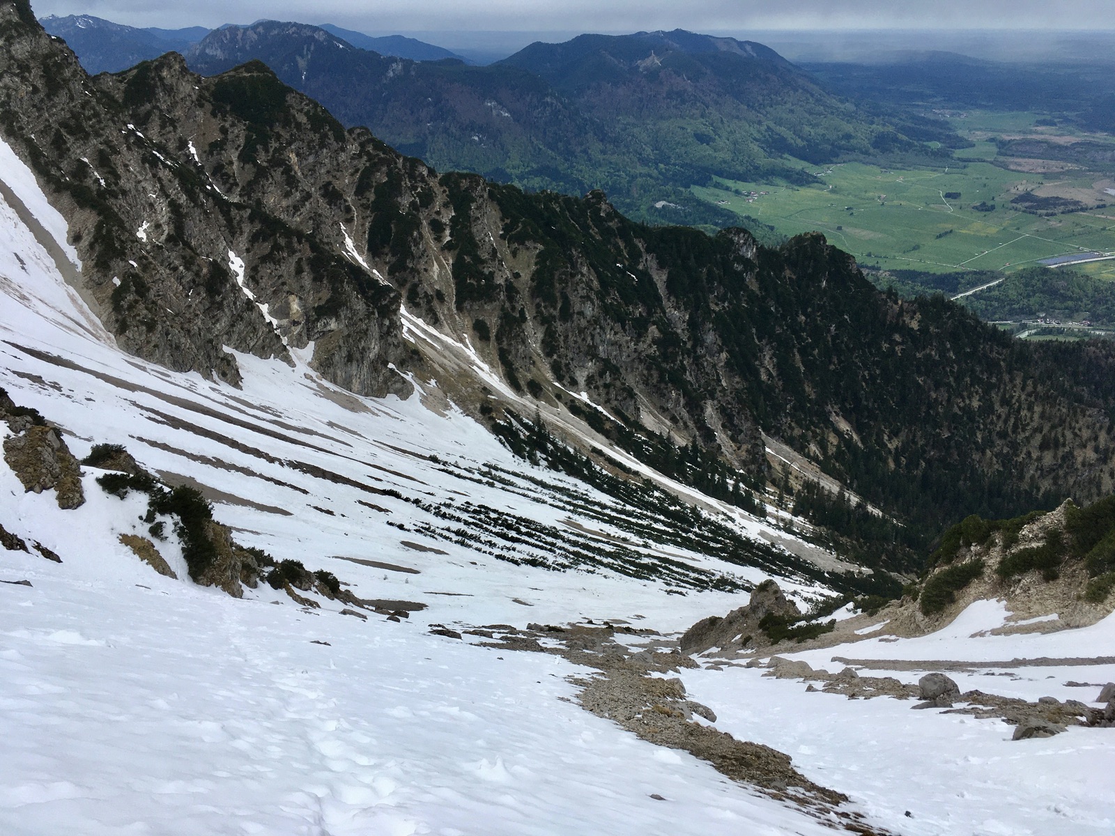 Heute ging es von Eschenlohe auf batzigem Steig, der an einigen Runsen weggerutscht ist (wird gefühlt auch jedes Mal schlechter), zu Fuß hoch ins Kistenkar. Je nach Lust und Laune kann man dann früher oder später im Kar die Kurzski anschnallen (mit den langen Latten m.E. nicht mehr lohnend). Die letzten ca. 20 Hm geht es nur noch zu Fuß aus dem Kar hinaus in das Joch. Dann noch ca. 80 Hm zum Gipfel durch die vorbildlich ausgeschnittenen Latschen (vielen Dank an diejenigen, die das gemacht haben). Die Abfahrt im Kar ist schon etwas eingeschränkt durch ausgeaperte Rippen und Felsen, aber es geht letztlich recht gut hinunter - jeweils am besten dort, wo Lawinen den "Sumpf" ausgeräumt haben und man auf der Altschneedecke abfährt. Ich bin das Bachbett noch weiter hinab gefahren, ist aber schon recht eng und steinig. Dabei drei apere Stellen, ein Mal mit Kraxelei in brüchigem Fels. Es ging noch genau bis 1.200 m hinunter. Dann folgen einige Meter Latschenkampf, bevor man wieder auf den Steig trifft.
