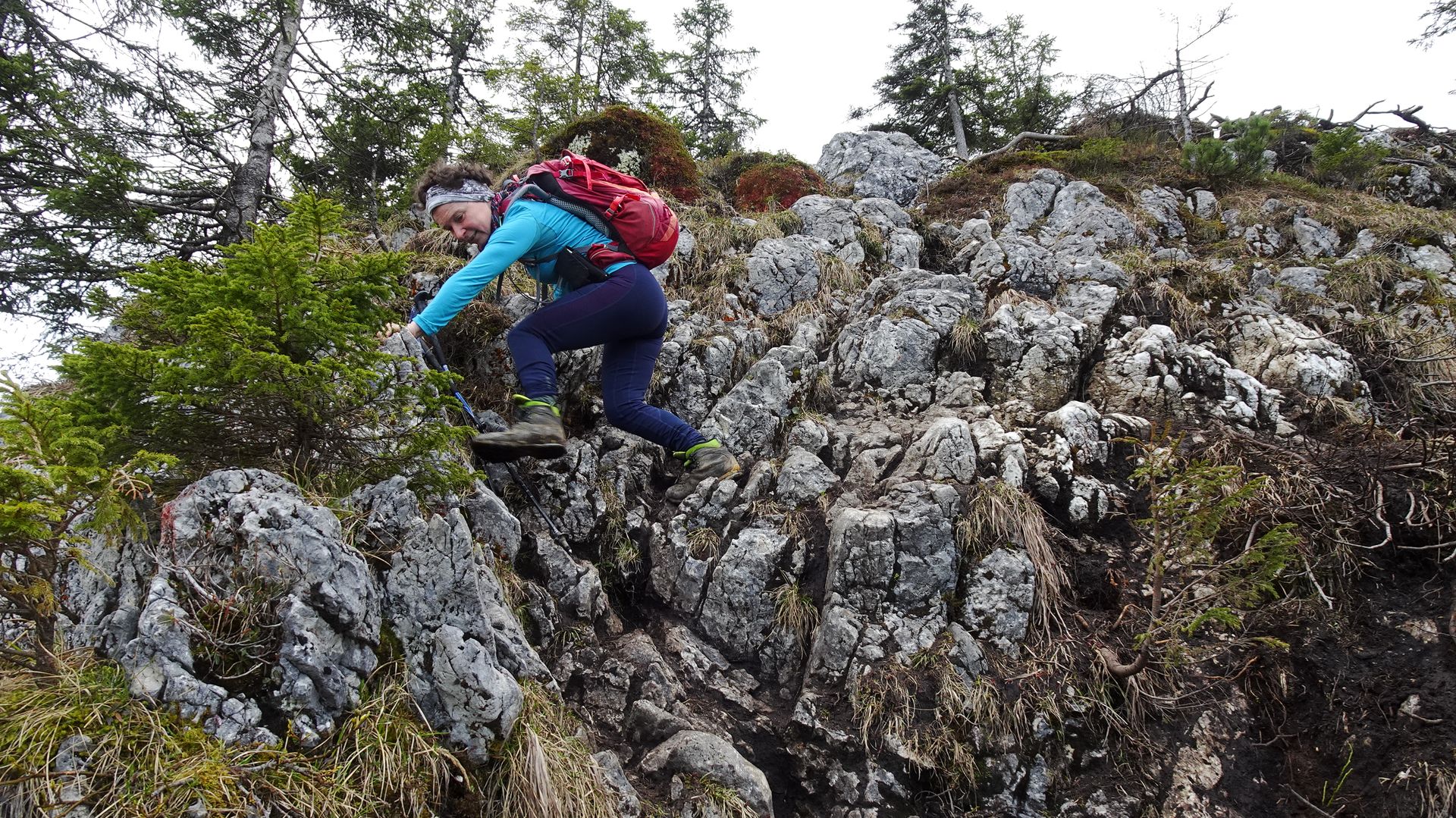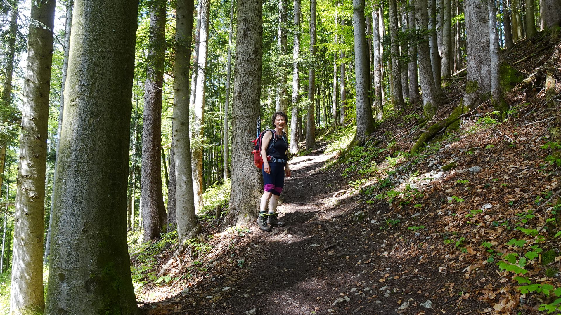 Bergab sind wir zuerst den Maximiliansweg weiter gegangen. Da geht es kurz ein wenig ausgesetzt mit einer sehr kurzen Kraxelstelle und danach bequem durch den Wald hinab bis auf 1340 m. Da kommt ein Wegweiser, dem wir dann nach links Richtung Lenggries gefolgt sind.