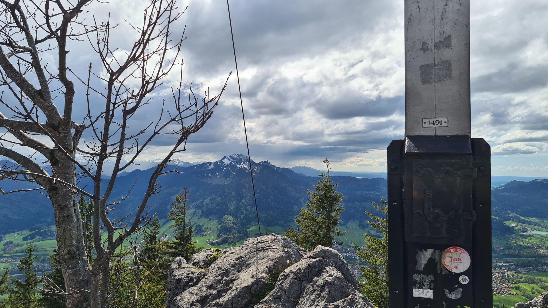 Am Gipfel öffnet sich der Blick noch weiter. Heute war die Sicht unterhalb der Wolkenschicht wieder sehr klar und die für diese Jahreszeit beträchtlichen Schneemengen im Karwendel gut zu erkennen. Nach den obligatorischen Gipfelfotos sind wir zügig abgestiegen, denn die Regenwolken rückten immer näher.