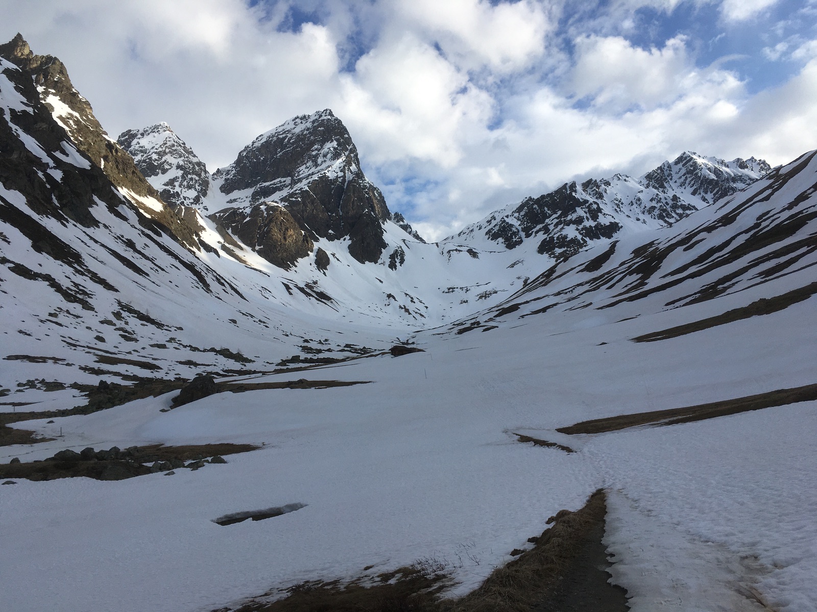 Zunächst mit dem Radl durch das Val Tuoi - welches mitunter ordentlich hochzieht. Bis zur Verzweigung vor der Alp Suot ist es völlig schneefrei. Ich bin noch weiter gefahren und musste dann über mehrere jeweils kurze Schneefelder schieben. Dann direkter Wechsel auf die Skier bei der Almhütte auf ca. 2.130 m - besser wäre es aber wohl gewesen, schon vorher bei den Kieshaufen nach dem Abfall des Weges das Radldepot anzulegen, weil man danach hin und zurück mühsam schieben musste.