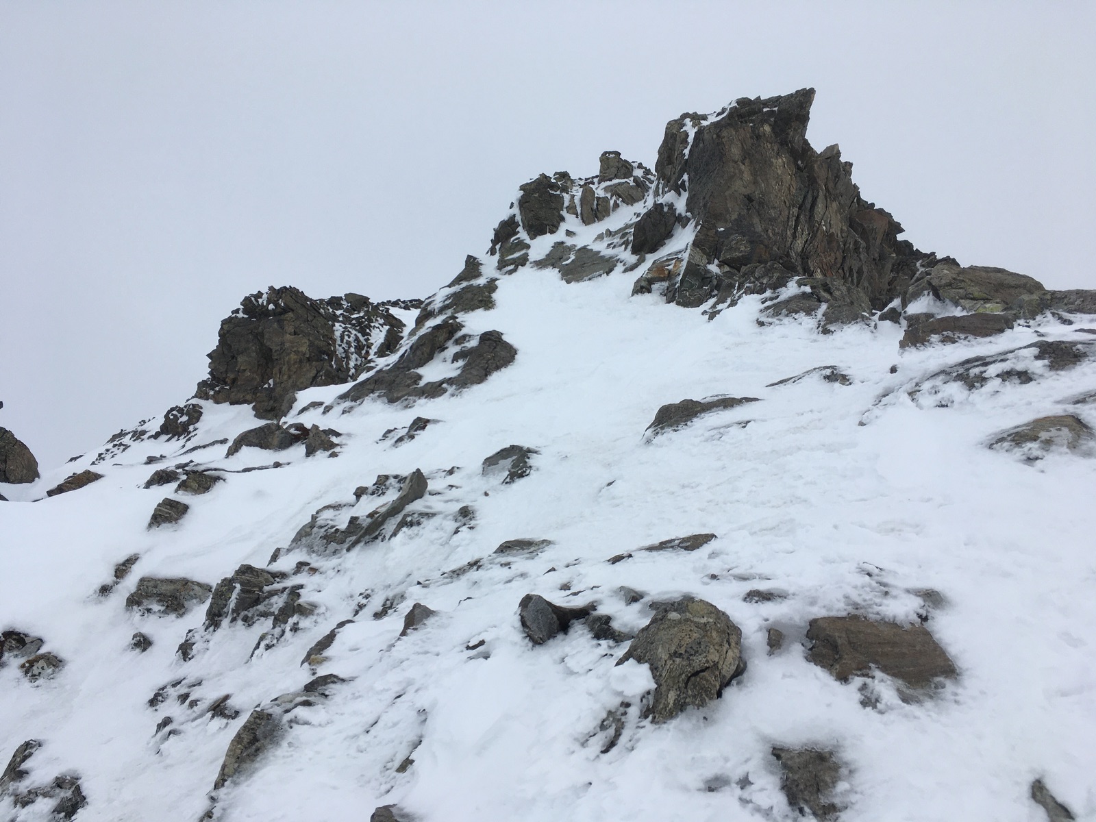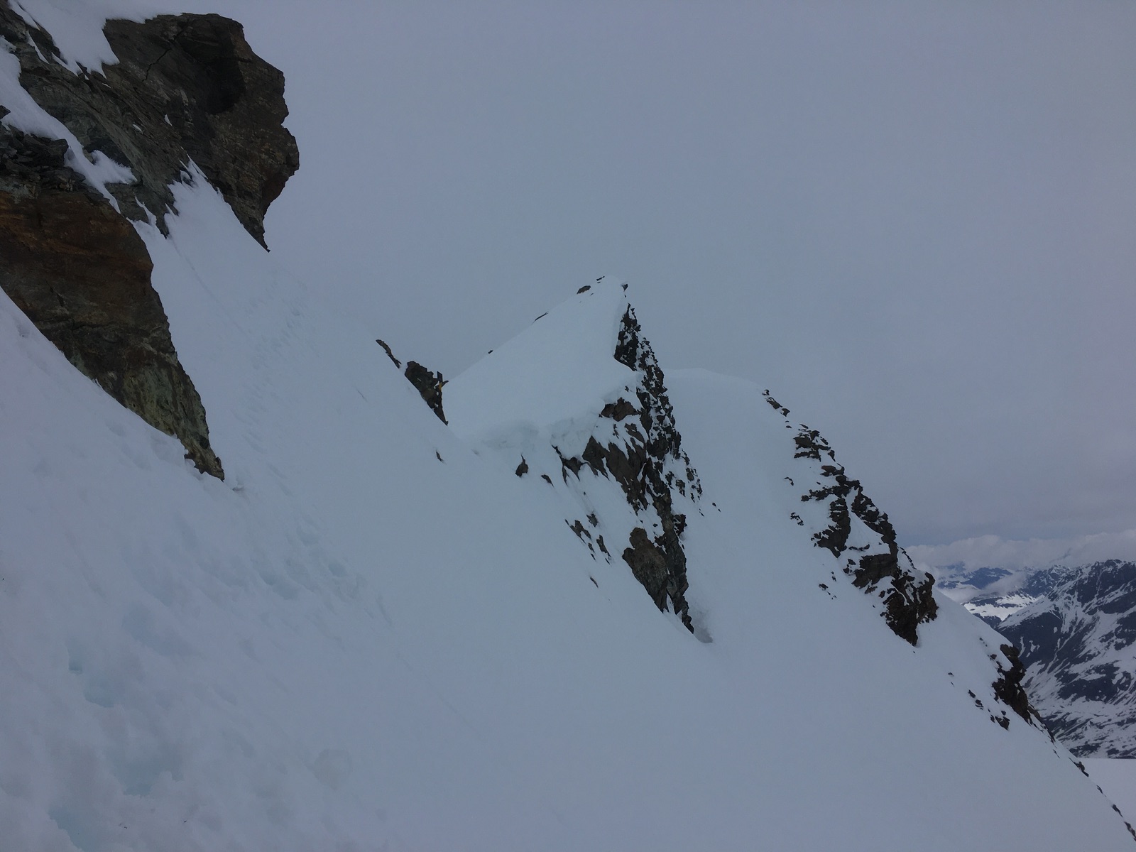 Der Gipfelanstieg ab dem Skidepot auf gut 3.100 m war mit Pickel und Steigeisen heute recht gut machbar. Anspruchsvoll daran ist ohnehin eher die Kombination aus ausgesetztem Gelände, Schnee, Eis und Fels und letzterer auch nicht immer fest. Klettertechnisch ist es hingegen überhaupt kein Problem, jedenfalls mit dem Schnee. Mit weniger gesetztem Schnee ist vermutlich alles aber bröseliger und auch die Steinschlaggefahr ein Thema. Die in vielen Internetbeschreibungen als unterer und oberer Kamin bezeichneten Stellen nimmt man zur Zeit kaum als solche war.