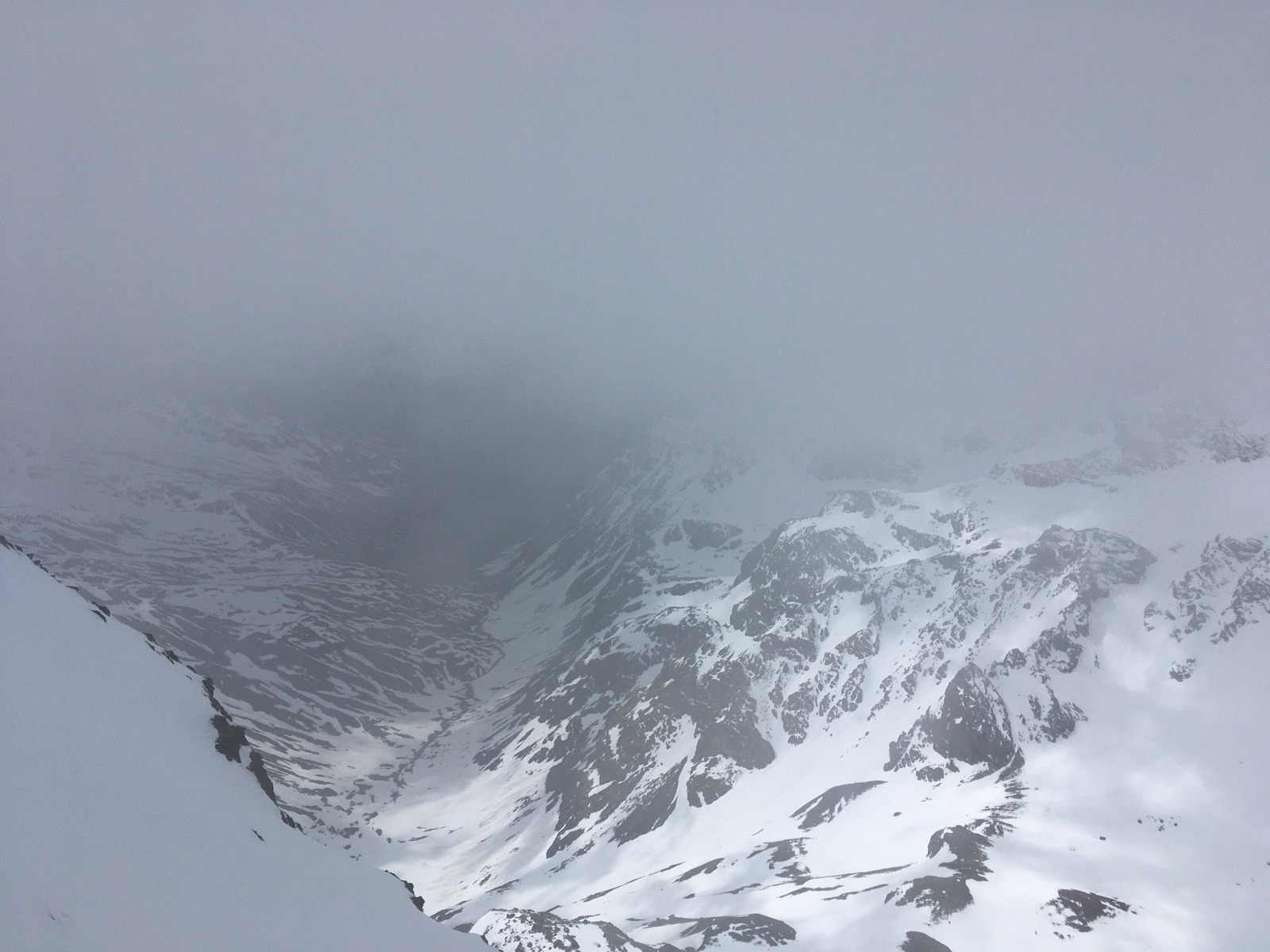 Die Abfahrt vom Skidepot zur Buinlücke war recht ruppig. Dann entschied ich mich doch direkt von der Buinlücke die Rinne abzufahren - ganz oben aber schon ziemlich steil und bei mir unangenehm hart. Weiter unten leider viele Lawinenboller, das sah von unten schöner aus. Wo es flacher wurde guter Firn, unten schon ziemlich tief (11.30 Uhr Abfahrt war zu spät). Der SAC empfiehlt, wegen Steinschlags das Gebiet der Rinne zu meiden - heute lagen aber nur wenige Steine herum. Der lange Rückweg über den Anstieg und dann noch bei Nebel erschien mir aber auch nicht angenehm.