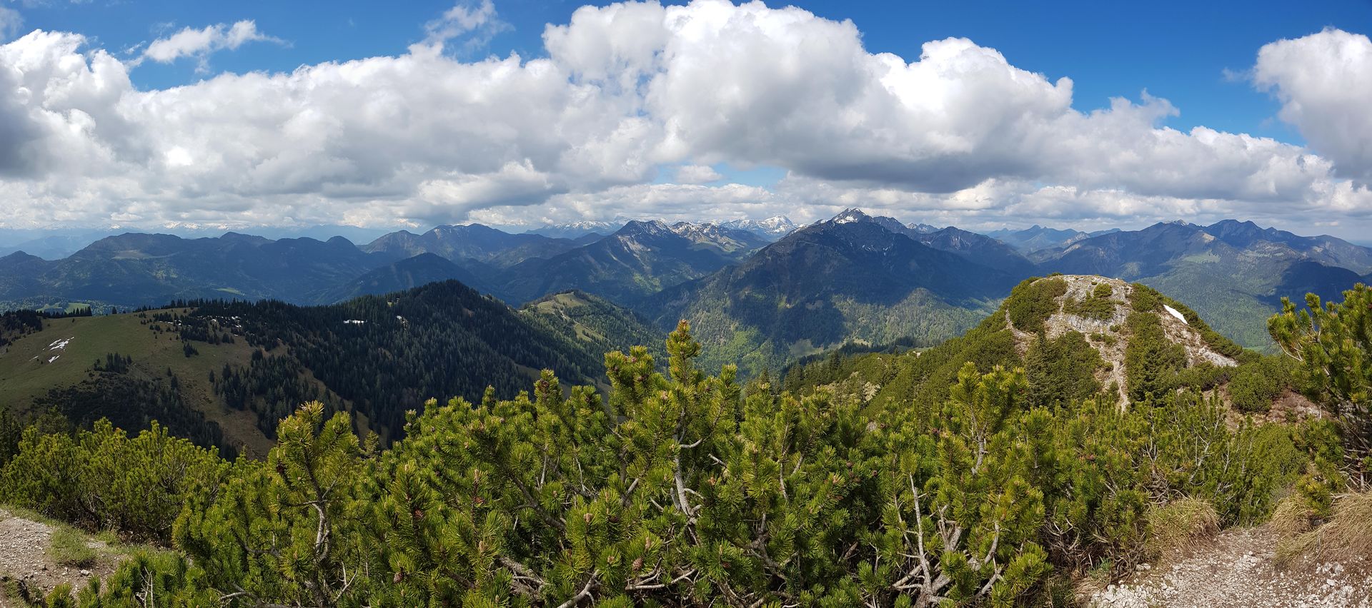 Blick nach Südwesten, u.a. zum hinteren Sonnwendjoch - noch kleine Schneereste nordseitig (Achtung: Panoramafoto in Vorschau nicht vollständig sichtbar!)