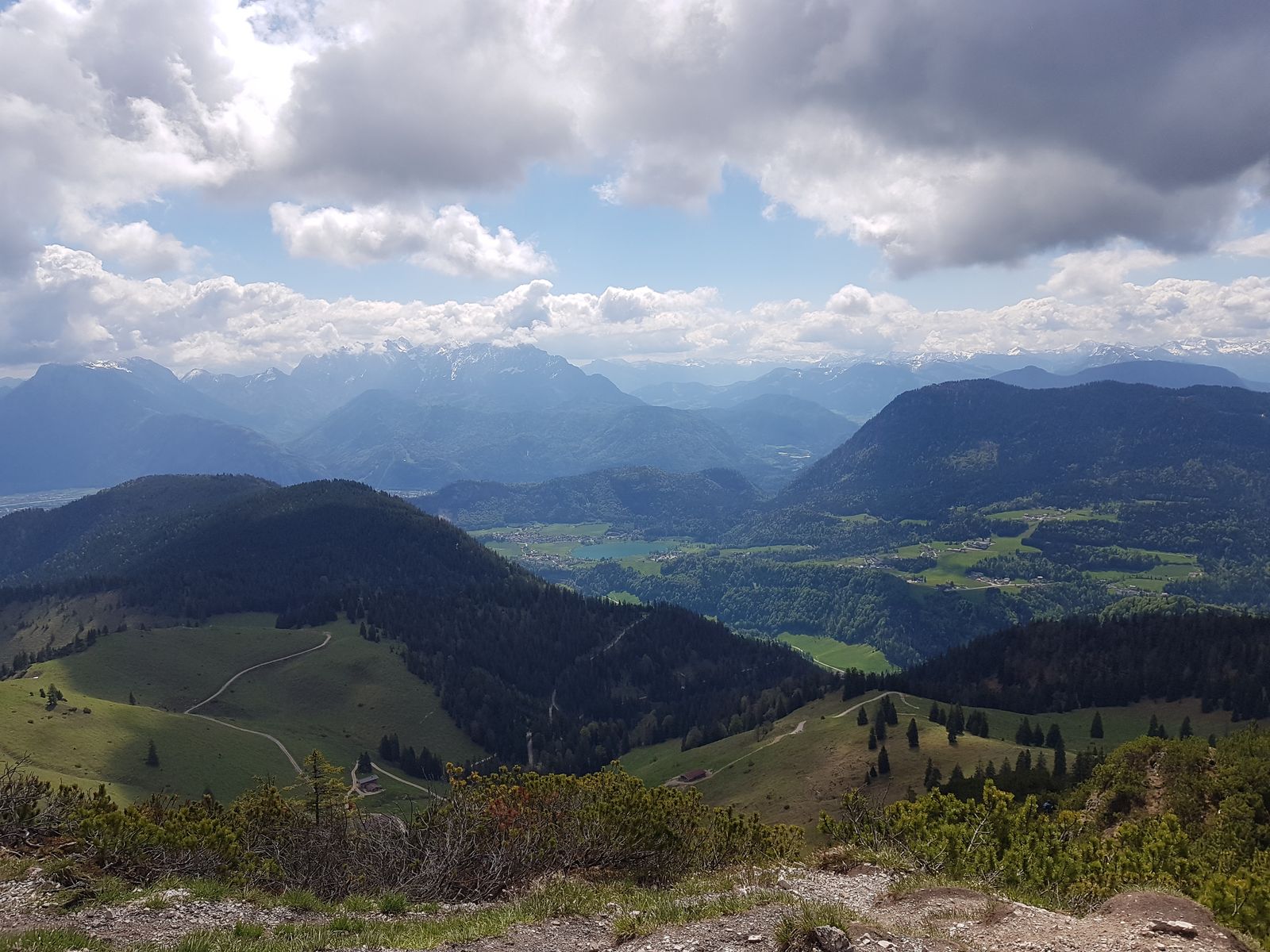 Blick nach Südosten zu Kaisergebirge, Thiersee und Pendling (auf dem Parkplatz dort am Gasthof Schneeberg war auch noch etwas Platz am späten Vormittag)