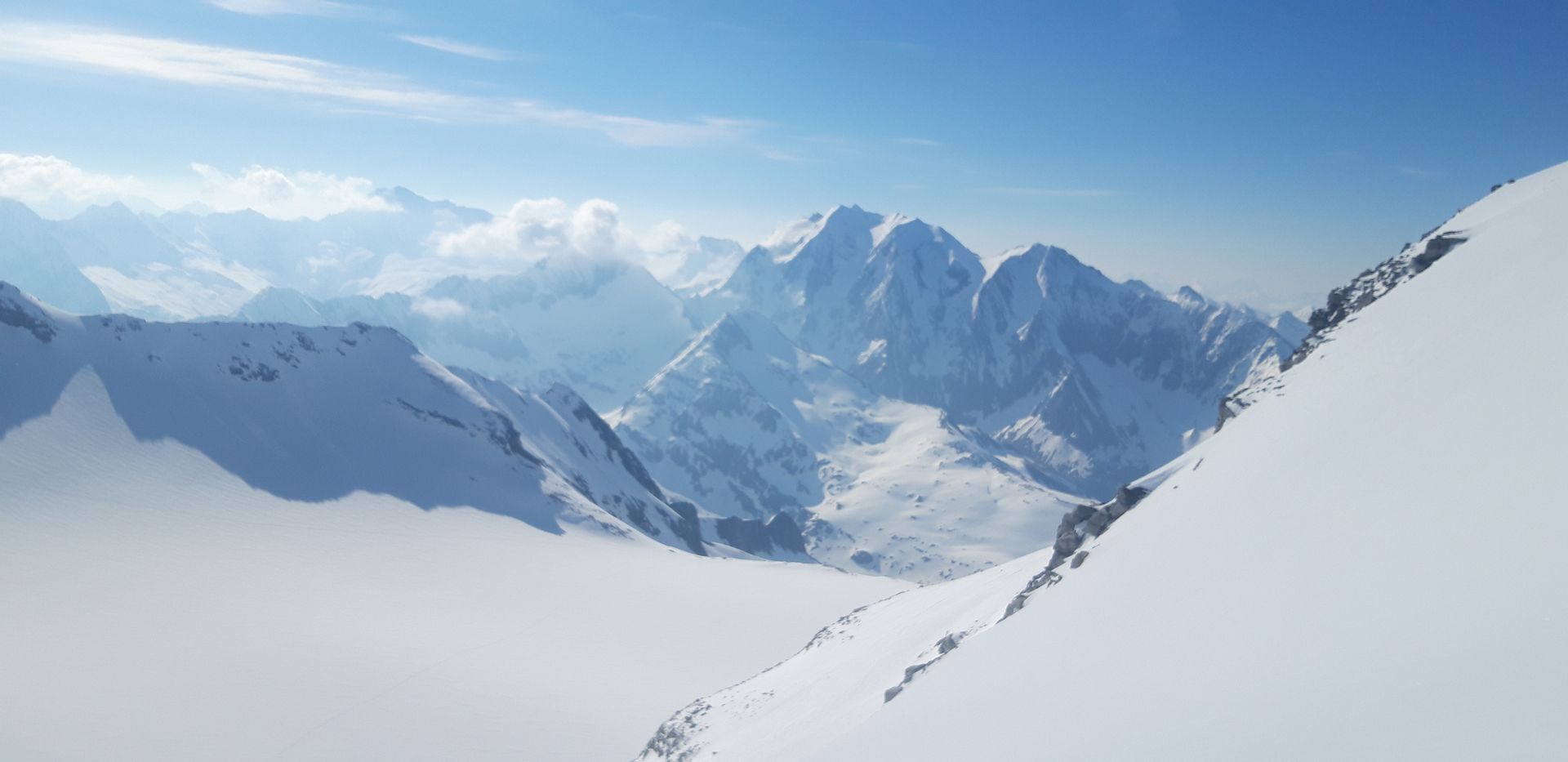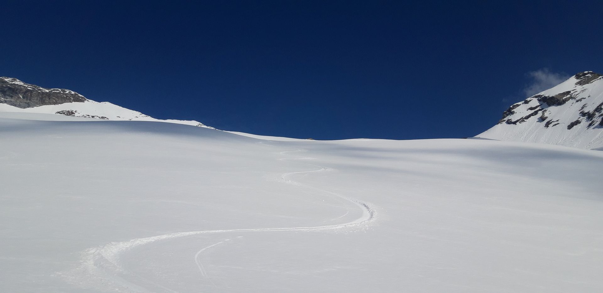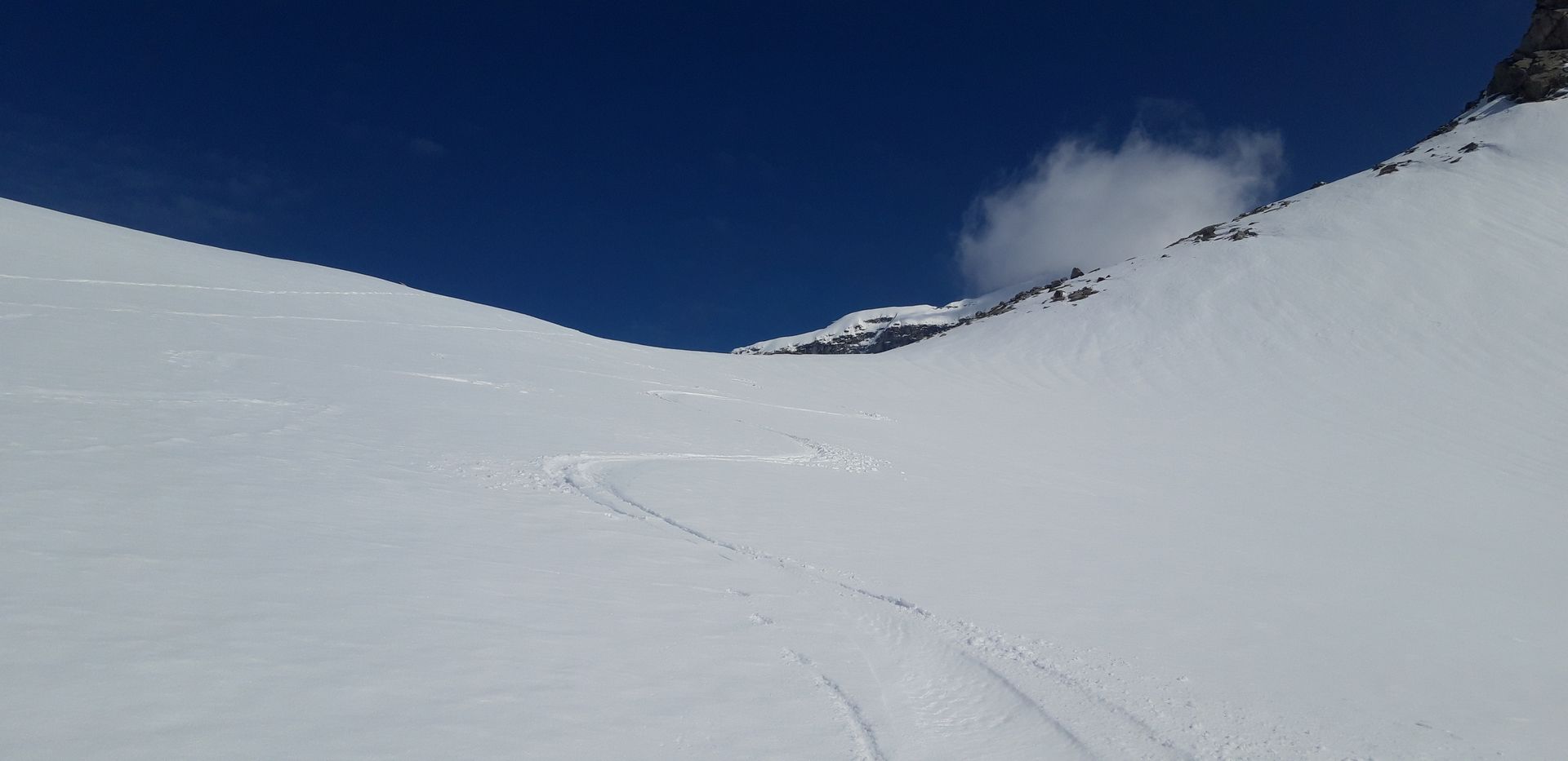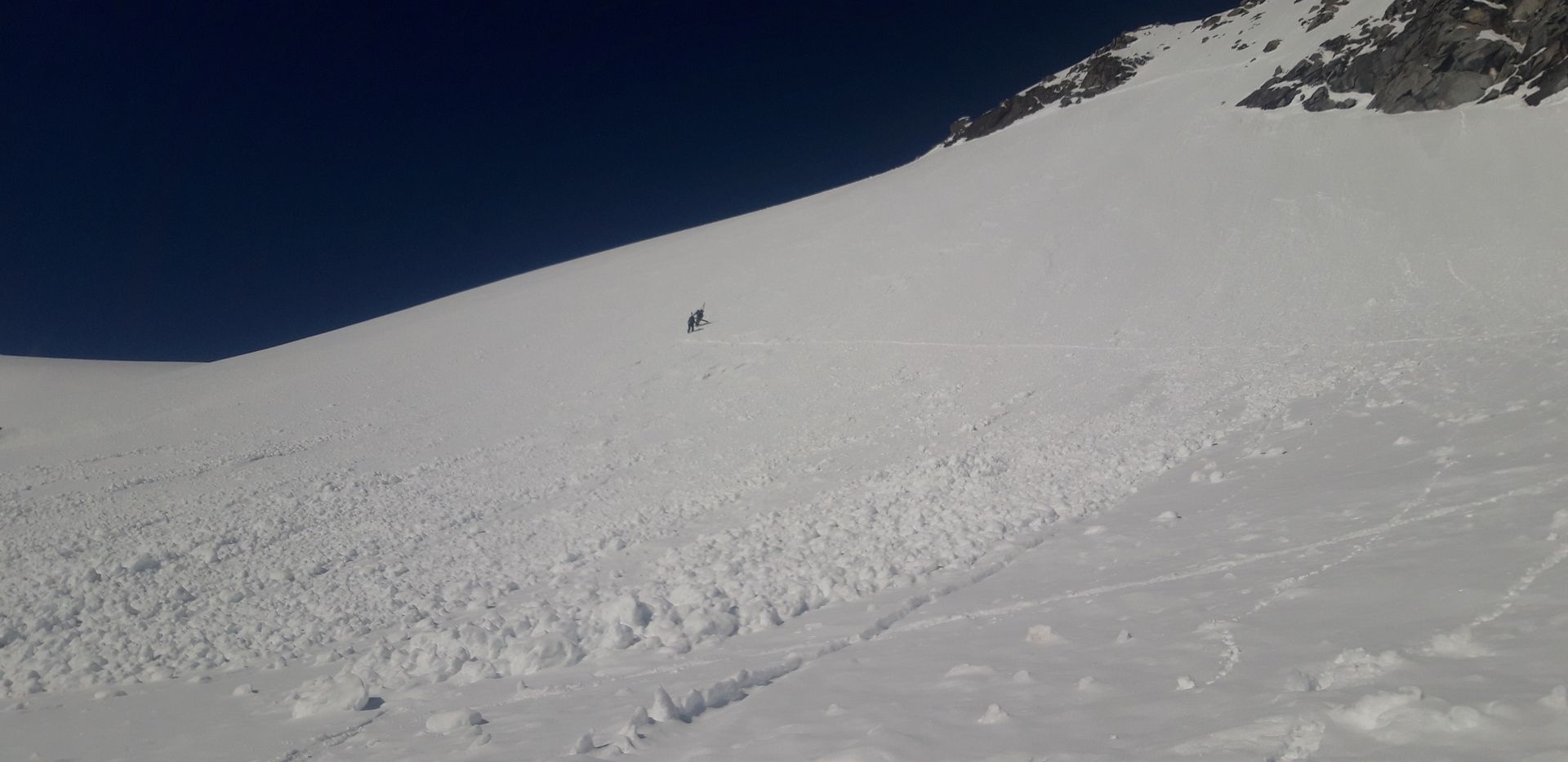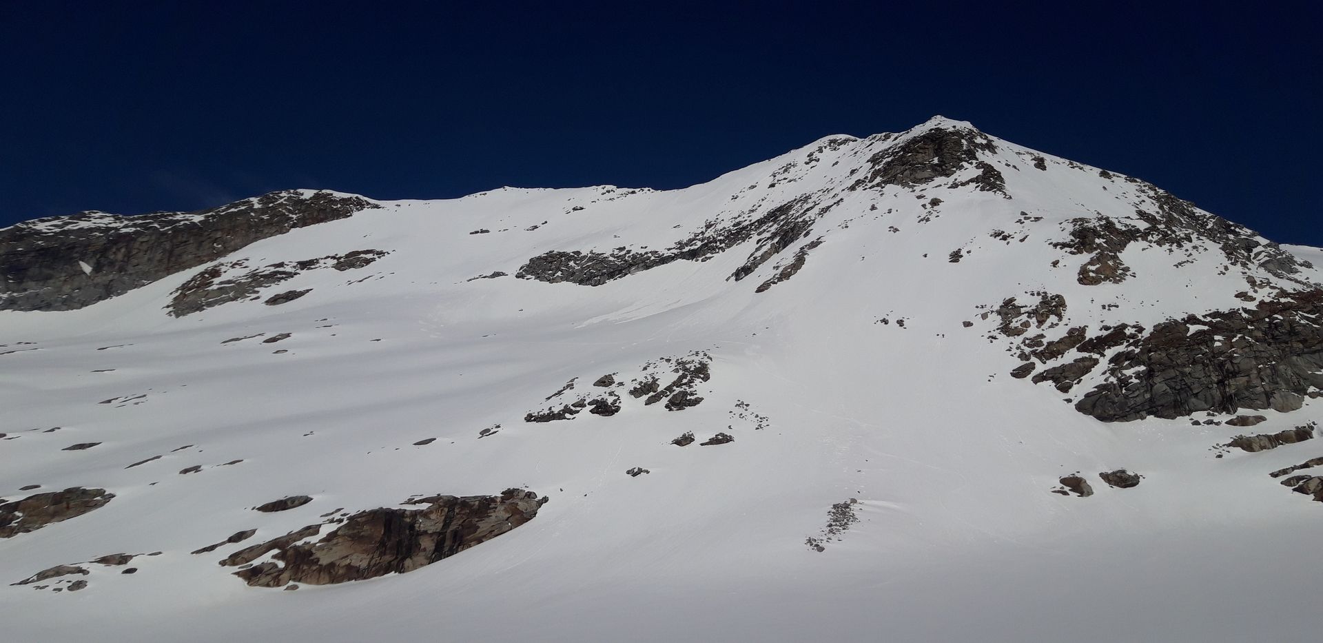 Warum aber "Grenztour"? Nun: Der Gipfel liegt ja schon in Italien, aber vor allem war es von der Lawinengefahr her grenzwertig. Oberhalb von 3000 Metern hat es über Nacht etwa 10cm geschneit, wozu dann einen frühe und schnelle Erwärmung kam. Während ich den steilen Osthang im Aufstieg querte, hinterließ meine Spur unterhalb schon ansehnliche Lockerschneerutsche. Ich fand es noch vertretbar (drei andere nach mir auch), aber wäre ich eine halbe Stunde später dran gewesen, hätte ich wohl abgebrochen. Gleiches gilt für die steile Abfahrt, wobei hier (Südost) der Schnee noch gut gehalten hat. Ich bin um 5 los und um 9 abgefahren. Später sollte man vermutlich auch in den nächsten Tagen nicht dran sein.