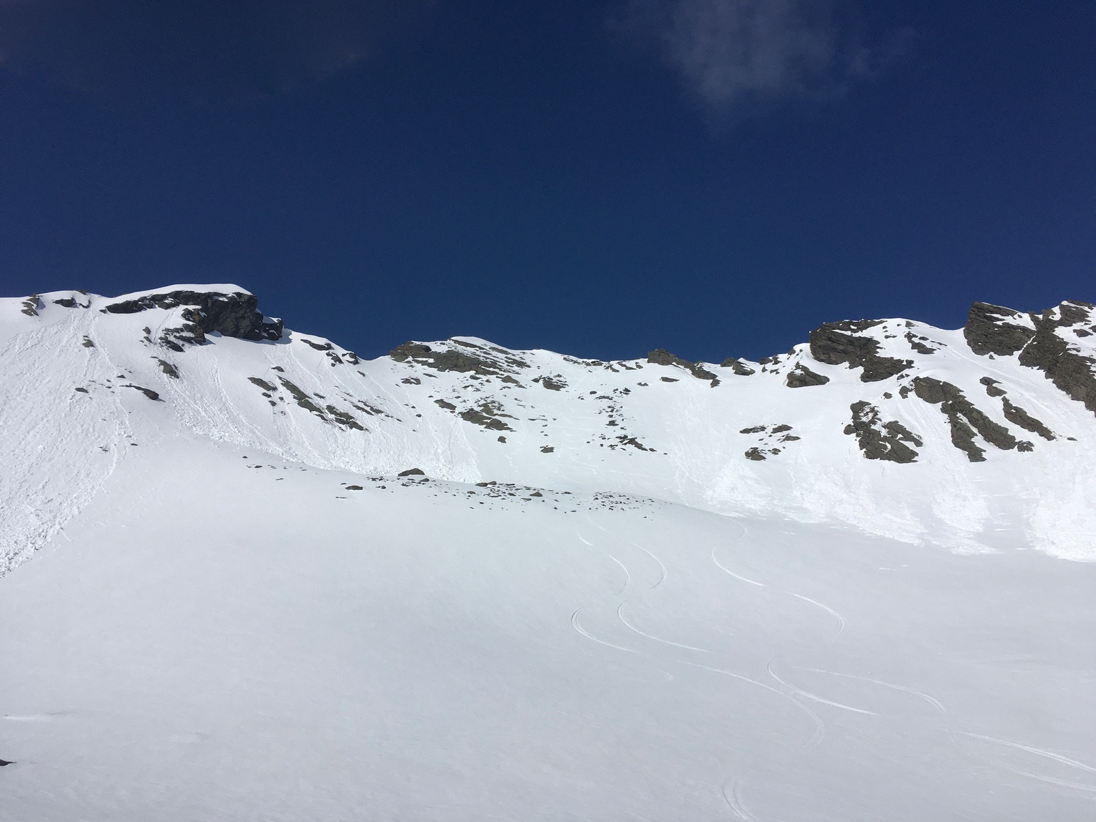 Der steile Gipfelhang war heute durchgehend mit Skiern zu machen: