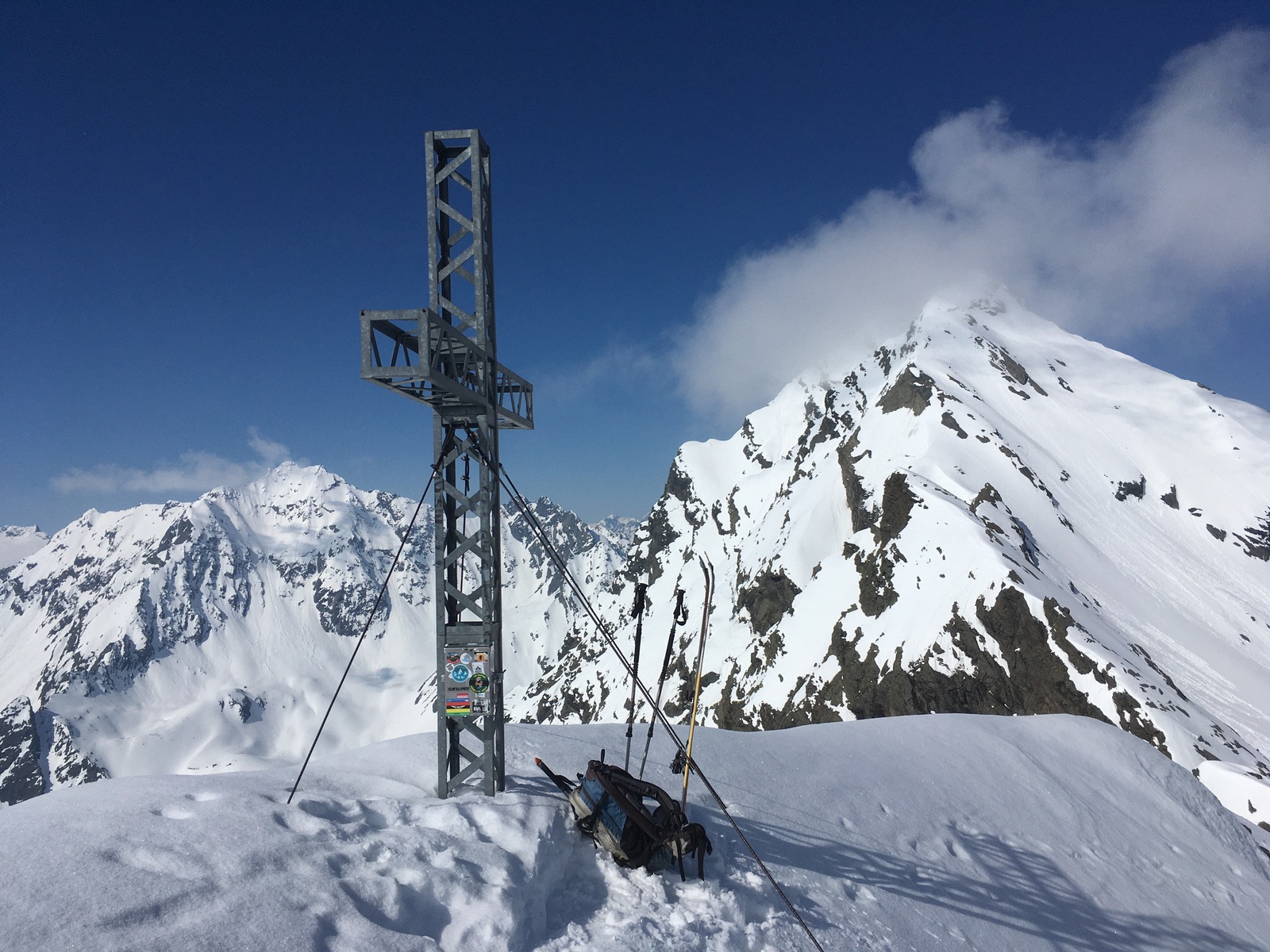 Sogar im Sellrain ist es mittlerweile recht ruhig geworden. Ich startete am Parkplatz des Ghf. Lüsens (zur Zeit geschlossen, 4 €) und hatte zunächst einen Zustieg ins Schöntal zu Fuß bis auf ca. 2.000 m - davor ist die Schneedecke nicht durchgehend. Da es in der Nacht wohl teilweise bewölkt und v.a. recht warm war, war die Schneedecke im Schöntal schon am Morgen nur eingeschränkt tragend. So war das Spuren etwas anstrengender als bei komplett verharschten Verhältnissen. Dafür ging es schweißtreibend (angesichts der sehr hohen Temperaturen) mit Skiern direkt bis zum Gipfelkreuz.
