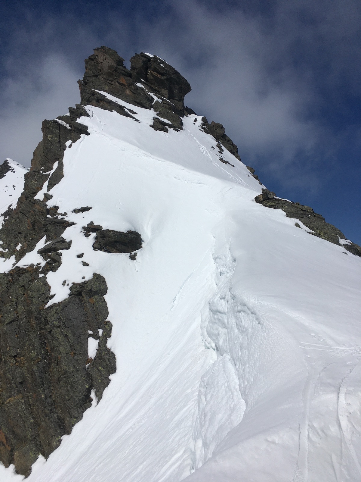 Der steile Gipfelhang war heute durchgehend mit Skiern zu machen: