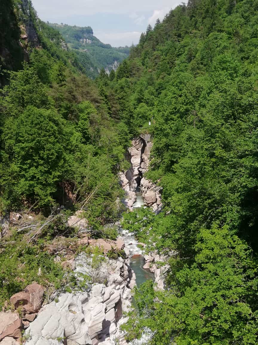 Landschaftlich ist die Tour aber sehr schön, erst mit Tiefblicken in die Schlucht, später dann mit Ausblicken in die Brenta und auf die Rückseite der Berge am Ledrosee. Ab dem Abzweig von der Hauptstraße Richtung Comano richtig idyllisch, der Ort (und auch Villa Banale) ist zumindest derzeit total verschlafen (aber mit Bar).