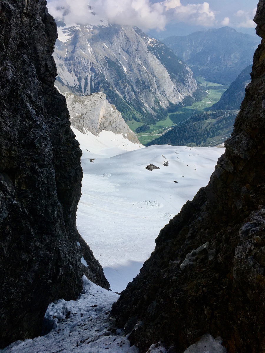 Der Schnee beginnt auf ca. 1.520 m etwas unterhalb des Brotzeitfelsens. Ich habe es aber vorgezogen, noch bis in das eigentliche Kar mit den Kurzski auf dem Rucksack aufzusteigen - geht einfach schneller und herauf ist die Steilstufe ohnehin nicht so toll. Im eigentlichen Kar liegt noch viel Schnee. Heute nahm ich mir mal die Östliche Hochglückscharte vor, die hat mit noch gefehlt. Jetzt weiß ich aber, warum fast alle auf die Westliche Hochglückscharte gehen: Es wird bei der östlichen Scharte nach oben hin einfach sehr steil und eng und das Ganze gab es heute noch mit Einbrechen bis zur Hüfte ... Bei härteren Schneeverhältnissen sicherlich leichter, dann wird es aber wohl Pickel (brav mitgeschleppt) und Steigeisen brauchen. In der Scharte selber hängt eine Wächte, die sich demnächst Richtung Inntal verabschieden dürfte (Vorsicht!) und es gibt auch kaum Platz. Also Brotzeit etwas weiter oben, das Gelände ist da aber unangenehm brüchig. Runterwärts kann man die Rinne erst nach einigen Metern abfahren, davor ist es zu eng.