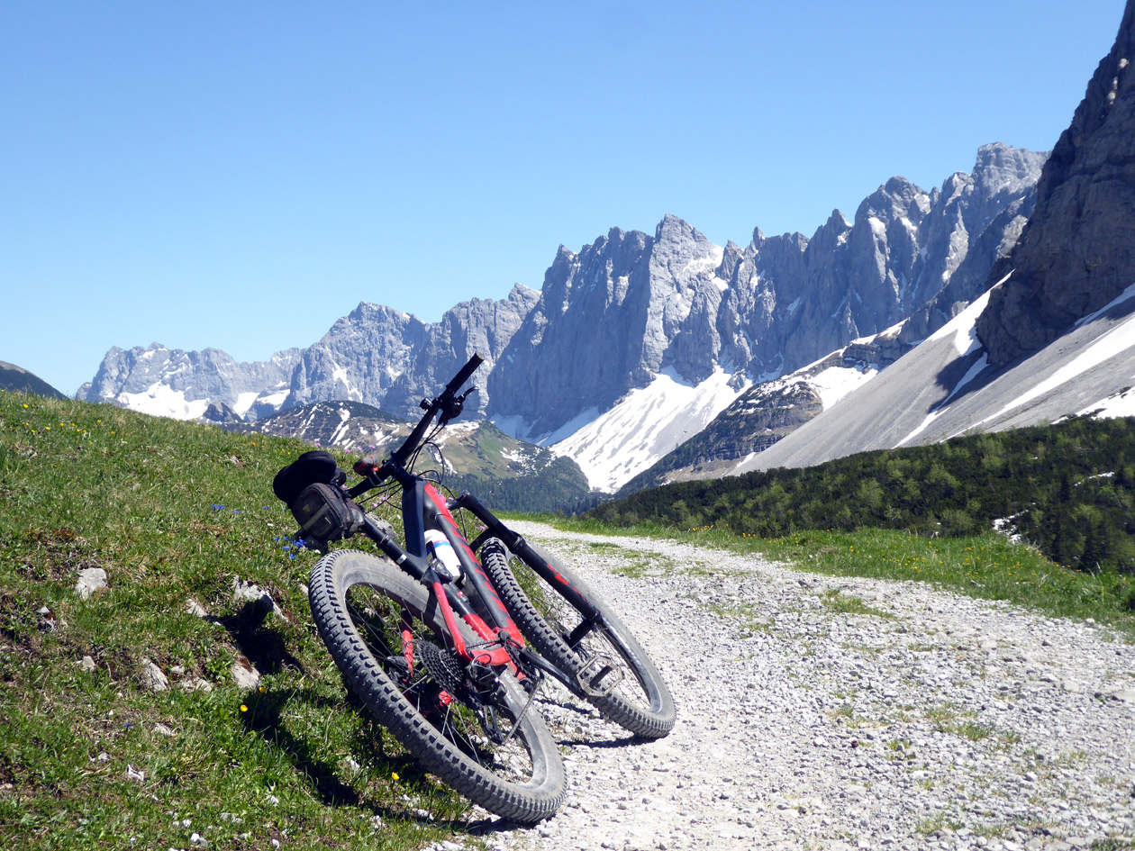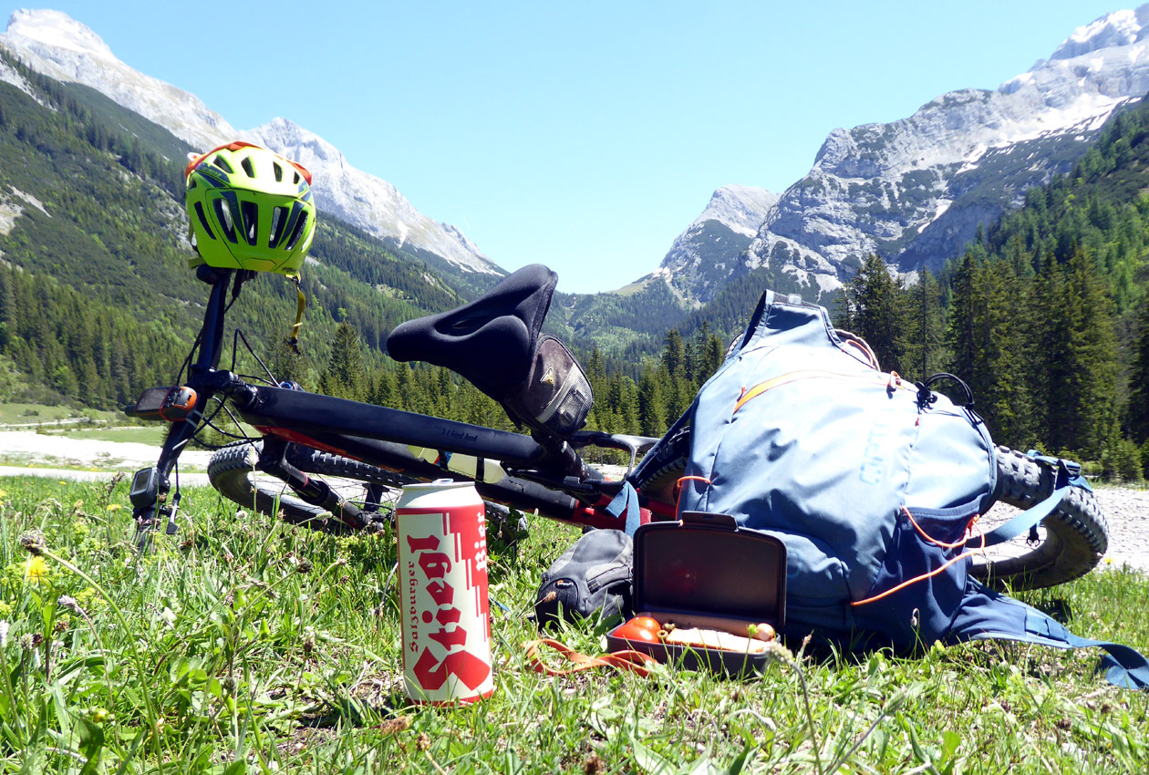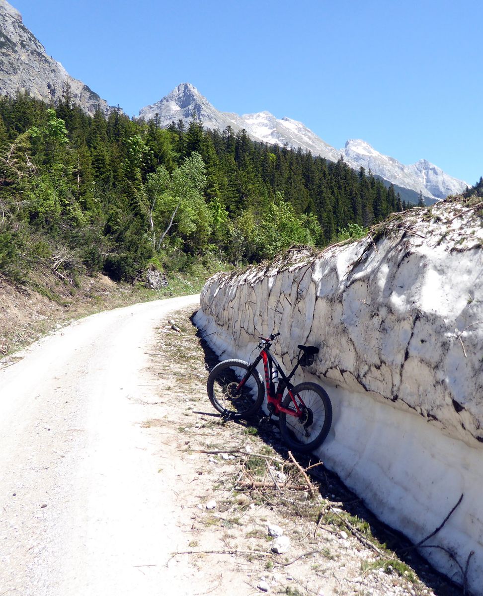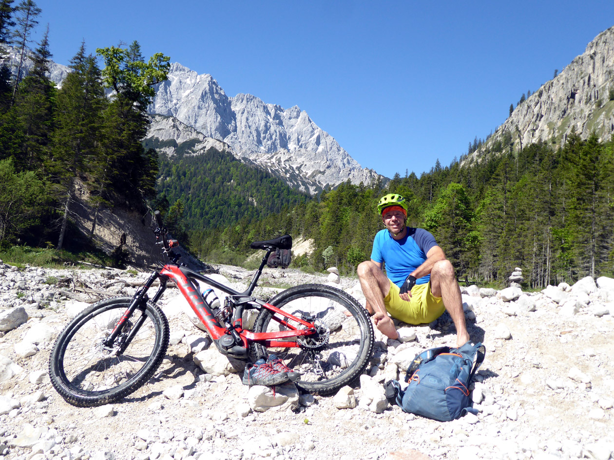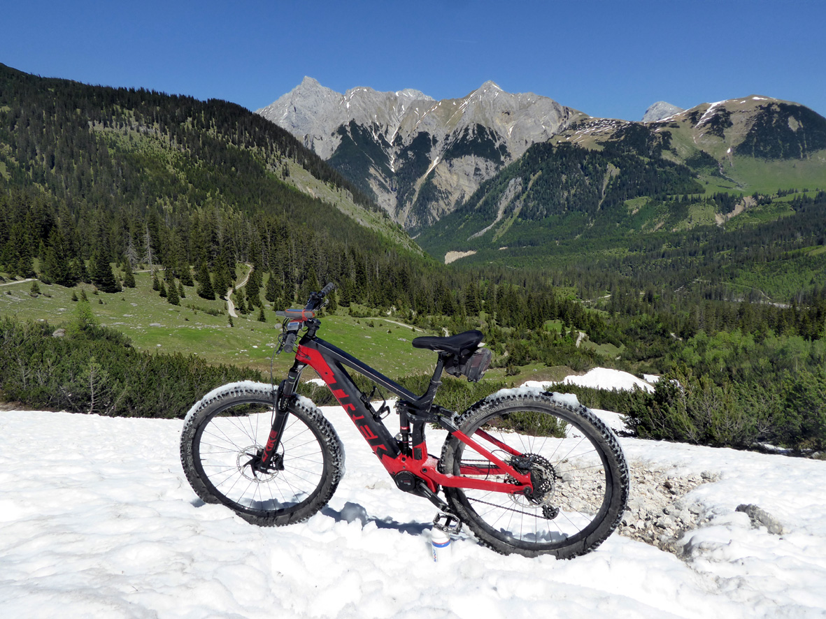 Heute mal Strom-Experiment in den Bergen: Wie weit komme ich mit meinem MTB-Pedelec? Die Teststrecke: Karwendelrunde (68 km, 1800 Höhenmeter). Das Bike: Trek Rail 9.8 mit aufgeladenem 625er Akku und Bosch Performance CX-Motor. Ergebnis: Test locker bestanden - dank sehr biobikemäßiger Fahrweise zu Beginn schaffte ich 990 Höhenmeter mit den ersten 20 Prozent Strom (von Hinterriss bis zum Karwendelsteg = zwei satte Anstiege im Eco-Modus), am Ende hatte ich 35 Prozent Akku-Reserve (2000 plus x wären in diesem Stil also gegangen).