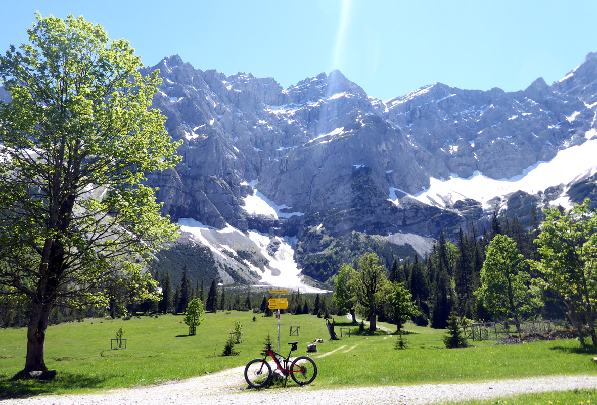 Und sonst: Herrliche Landschaft - und den Andreas Ruech habe ich beim verdienten Weißbier am Karwendelhaus leider knapp verpasst. Schneelage: In der Abfahrt vom Hochalmsattel zum kleinen Ahornboden zwei kleine Schneefelder auf Höhe der Kaltwasserkarspotze, 2x20 Meter schieben (willkommene Erfrischung).