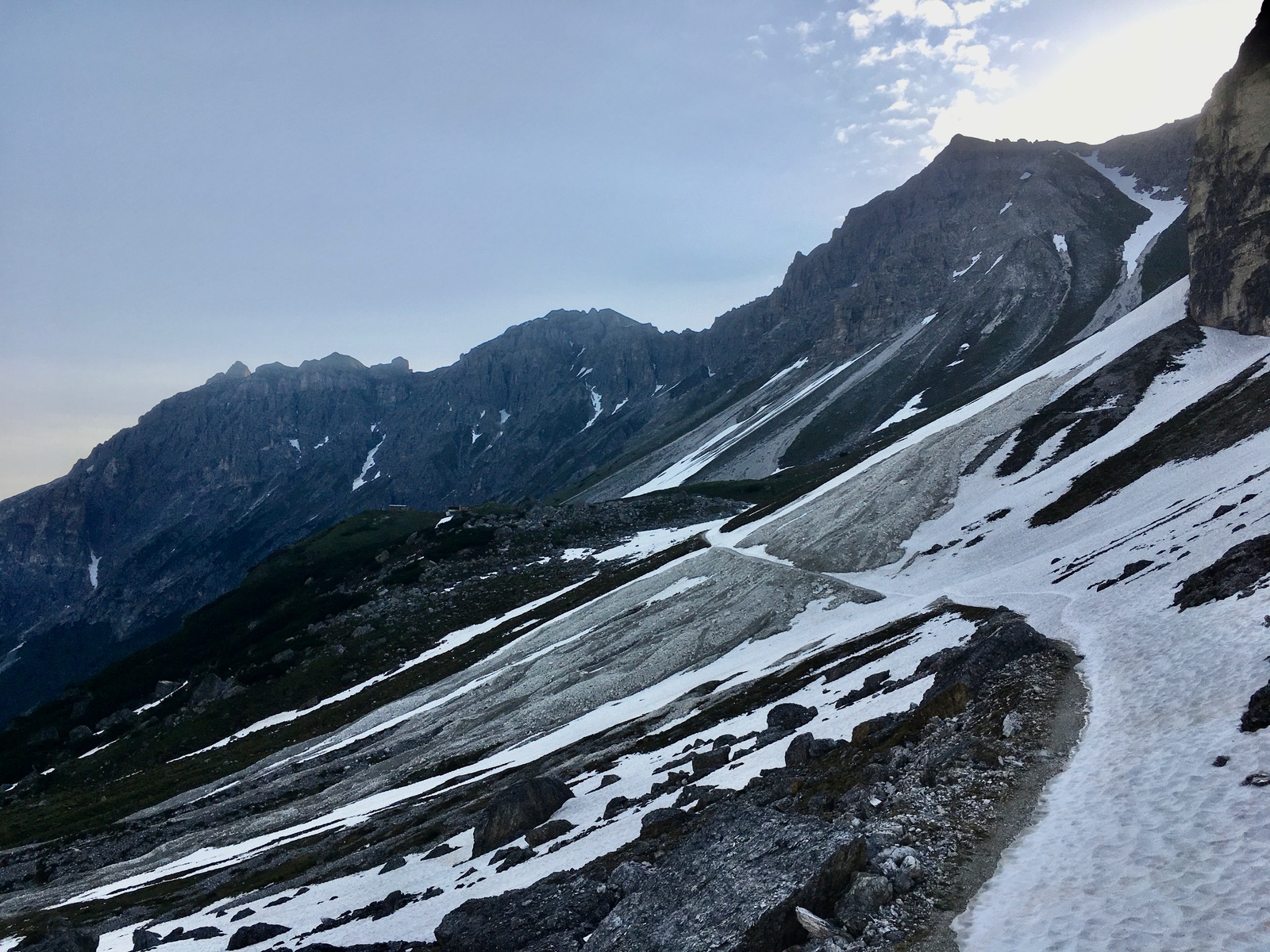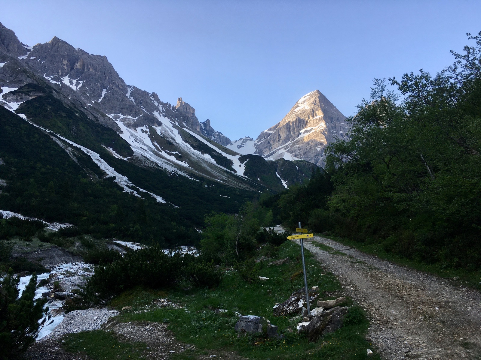 In der Hoffnung, der großen Hitze oberhalb von Schneeoberflächen entkommen zu können ging es zu früher Stunde ins Gschnitztal (Stubaier Alpen). Schon um 6.30 Uhr war es aber auch dort sehr warm - es kühlt selbst auf der Höhe nicht mehr wirklich ab, zudem war die Nacht bedeckt.