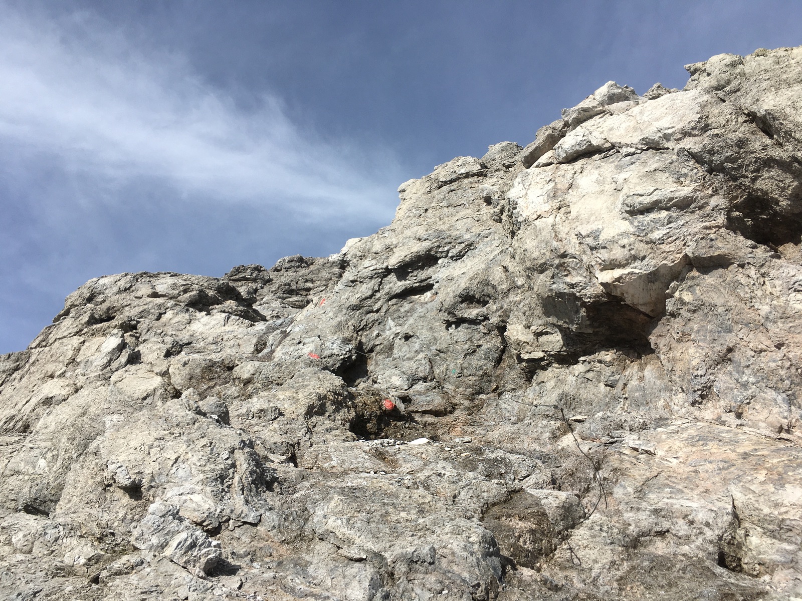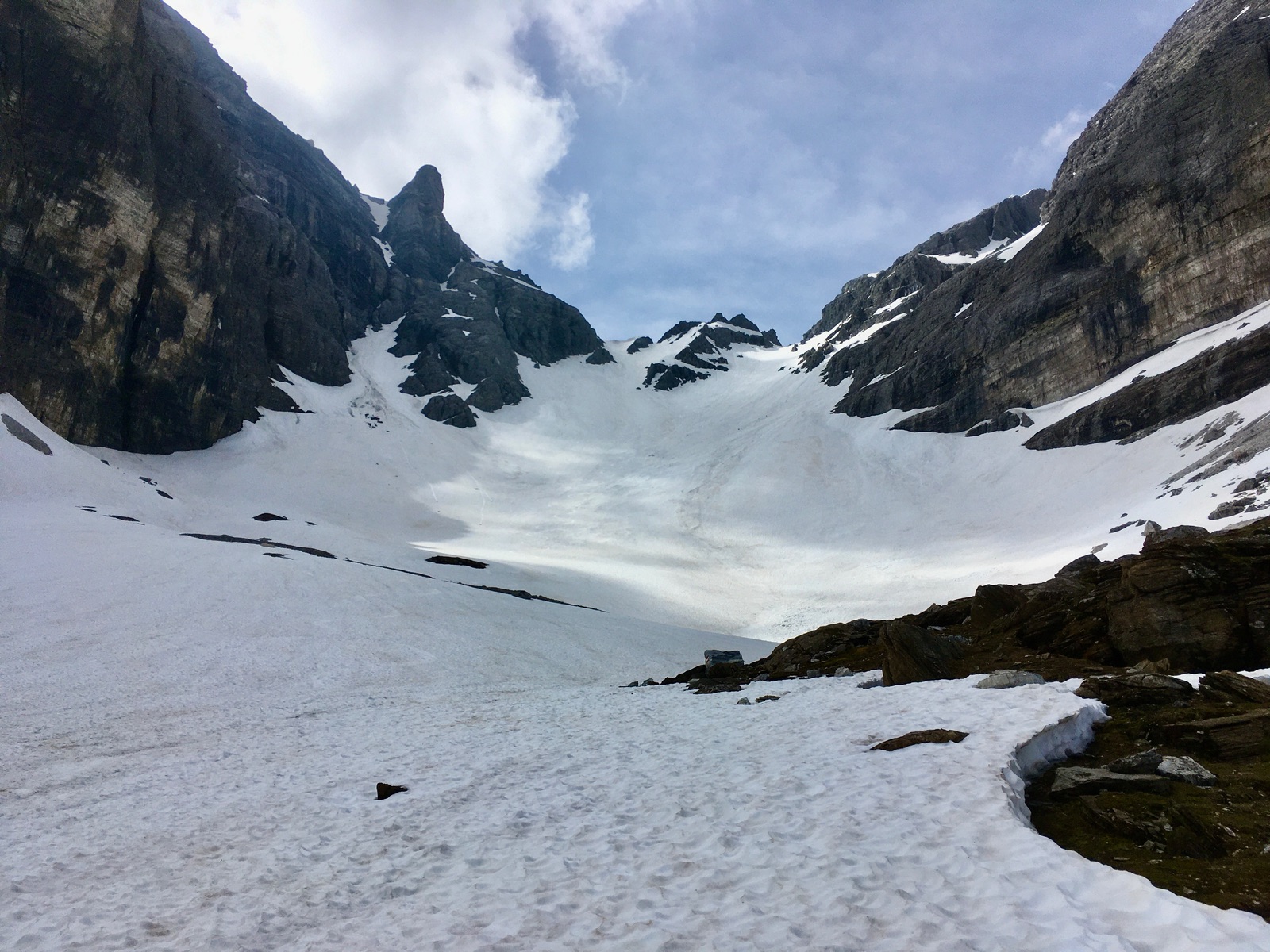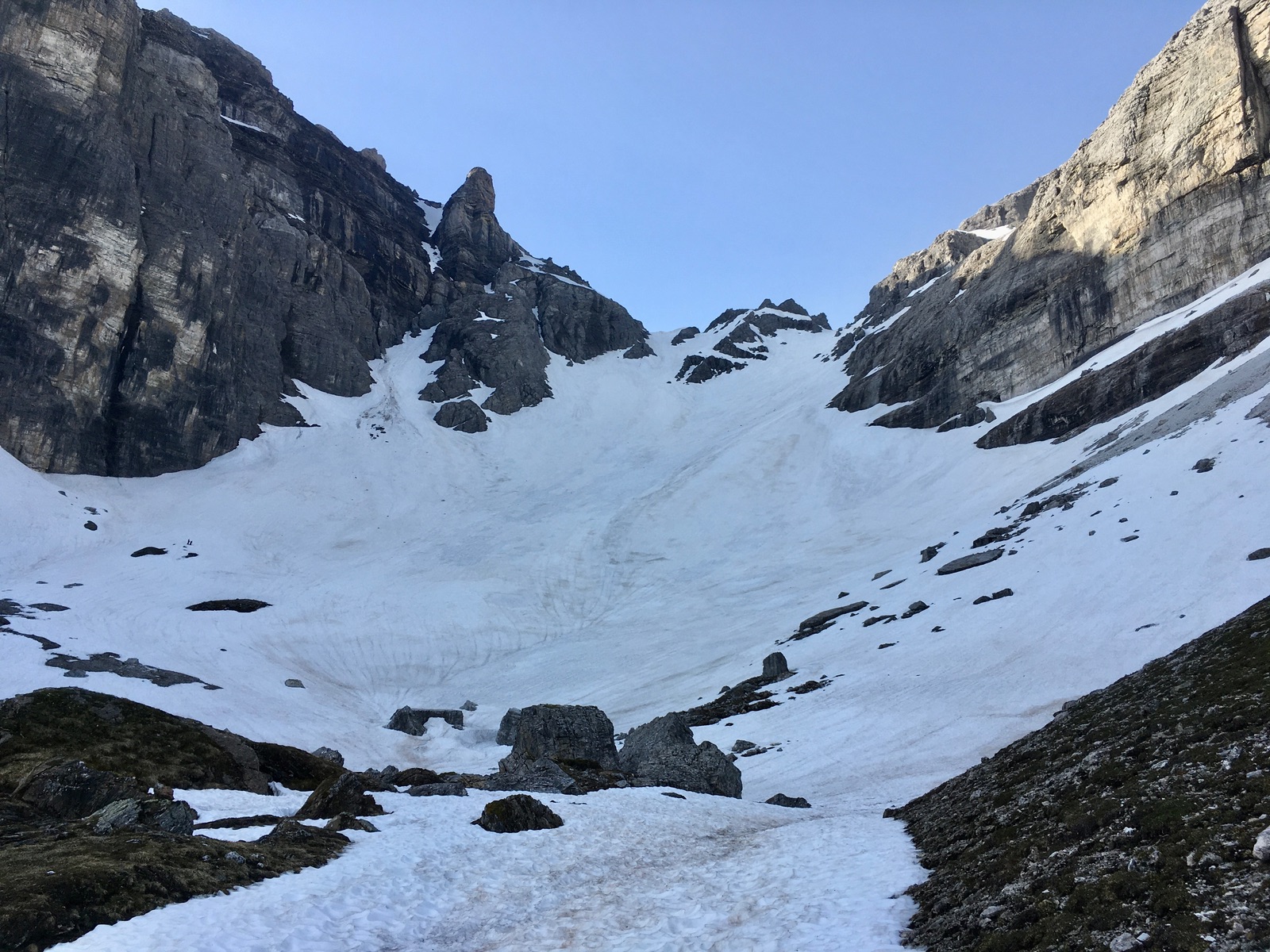 Extreme Skifahrer können sich die Felsstufe im Abstieg sparen - es gibt kurz vor deren Beginn eine extrem steile und enge Nordrinne direkt hinab in das Kar. Schneit sogar noch durchgehend schneebedeckt zu sein, Offenbar wurde die Rinne auch diese Woche befahren - stürzen darf man da nicht.
