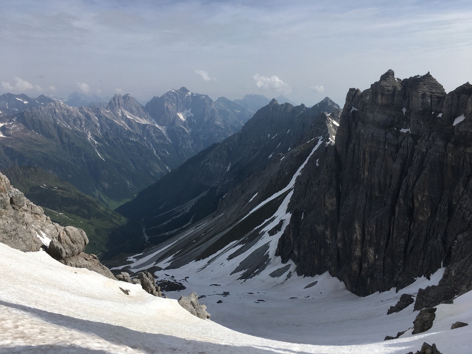 Leider war es heute recht dunstig, damit war die an sich tolle Aussicht vom Tribulaun eingeschränkt. Abfahrt oben um 10 Uhr passabel, der oberste Hang hat noch nicht Sommerschnee. Ab der Schneetalscharte um 10.30 Uhr, hätte durchaus auch später sein können und dürfen (der Nordhang kommt erst spät in die Sonne). Es geht mit Skiern bis zur Hütte. Wer zu Fuß aufsteigt statt das Radl zu nutzen, kann sogar im Bereich des Sommerwegs noch Skimeter "schinden".
