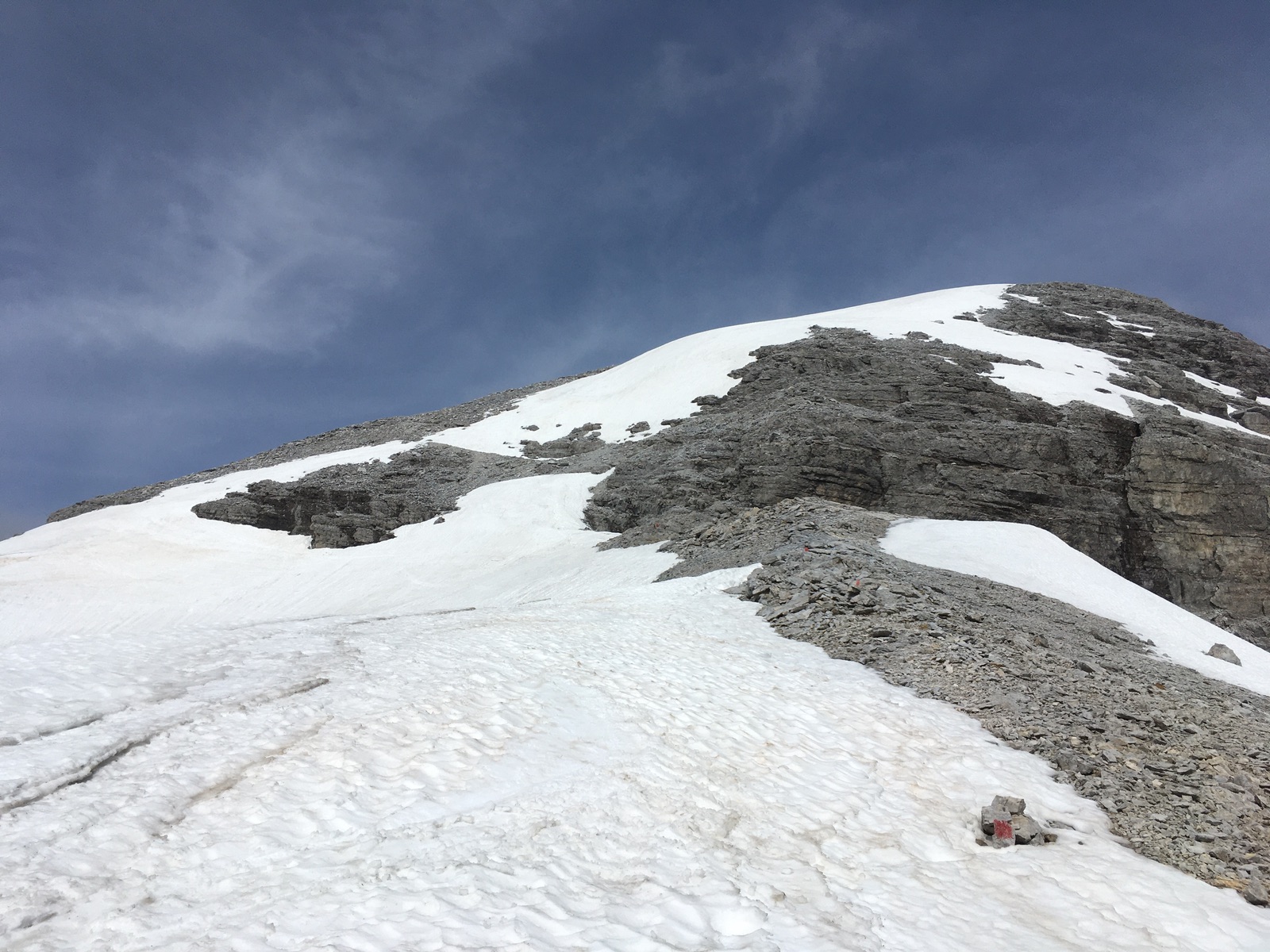 Der Gipfelhang ist noch durchgehend mit Skiern zu befahren: