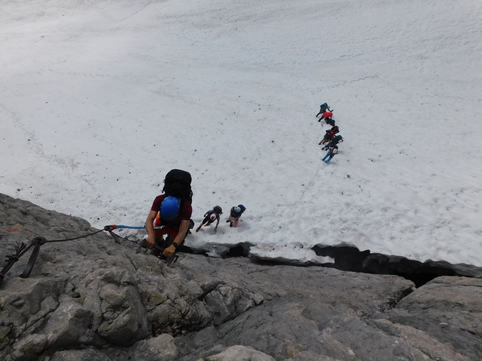 Die Randkluft war um die Jahreszeit schonmal einfacher zu überwinden - beim rechten Übergang muss man nach dem Übergang erst ein paar Meter kraxeln, bis man die erste Sprosse erreicht. Beim linken Übergang sah der Klettersteig leichter zu erreichen aus - allerdings konnte man dort nicht gut sehen, wo die Schneebrücken genau verlaufen (noch keine Spur vorhanden).