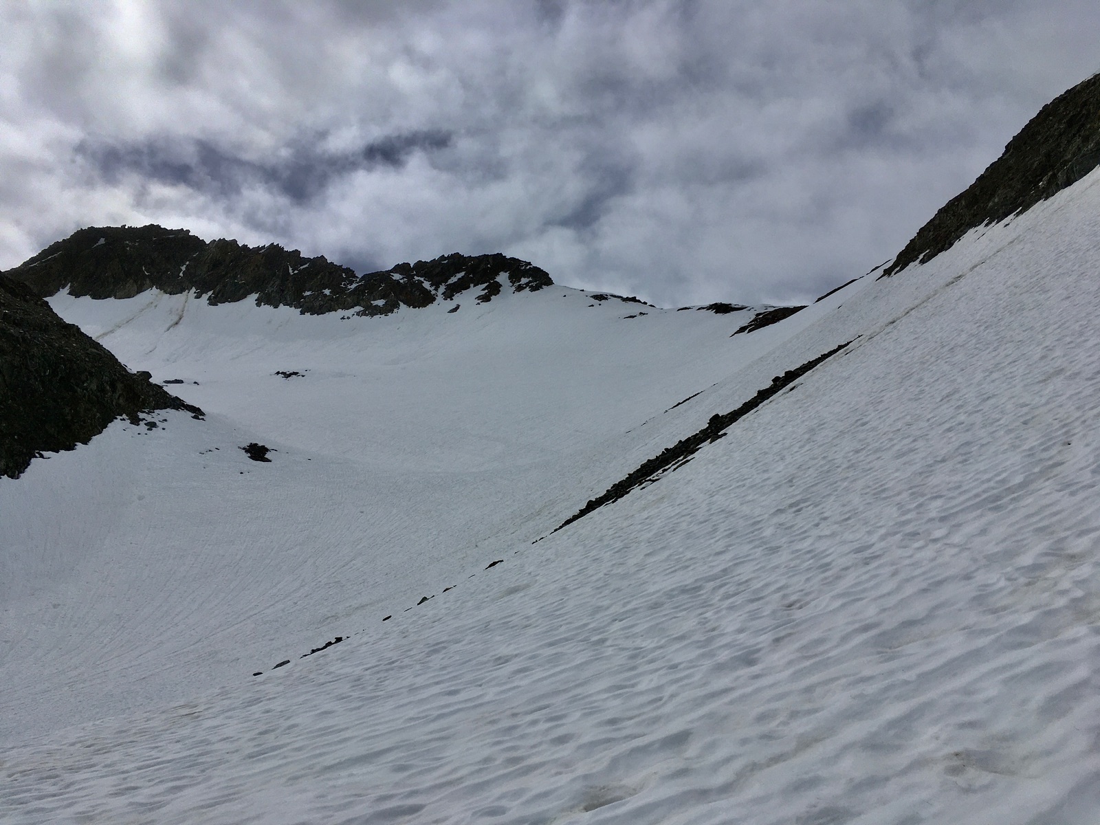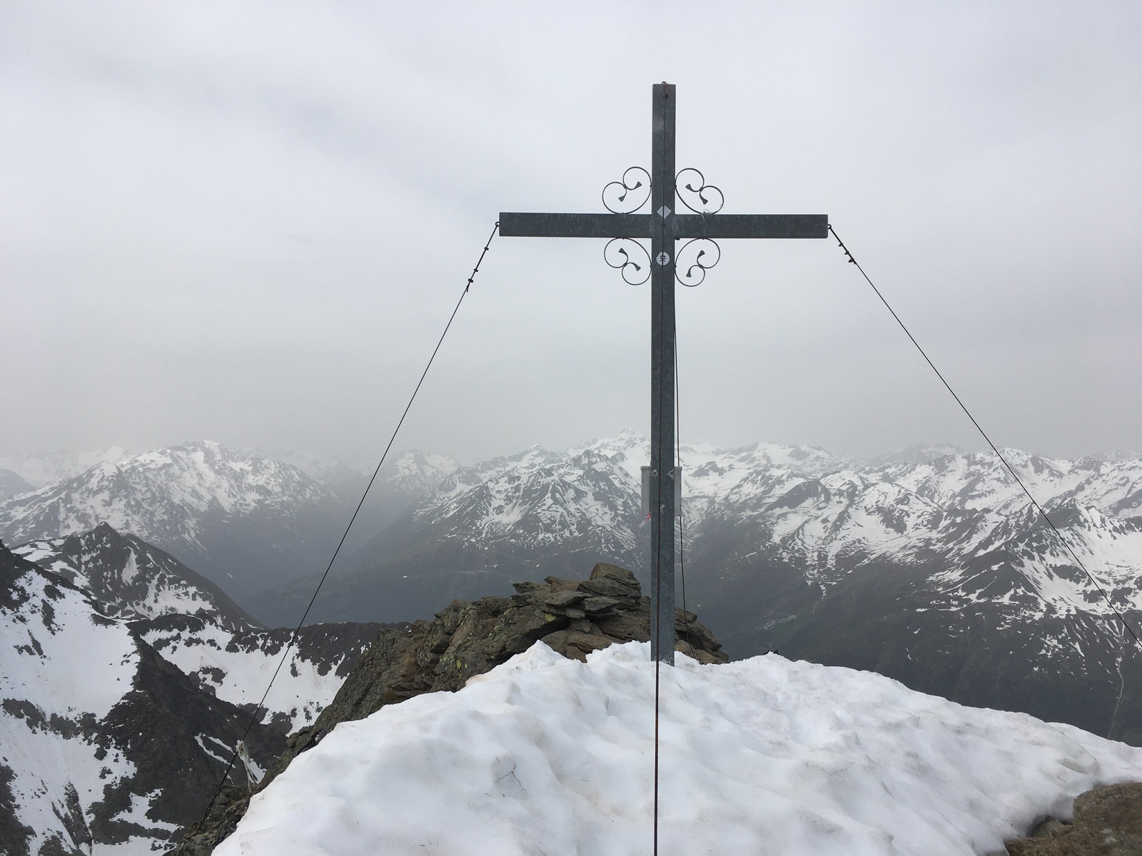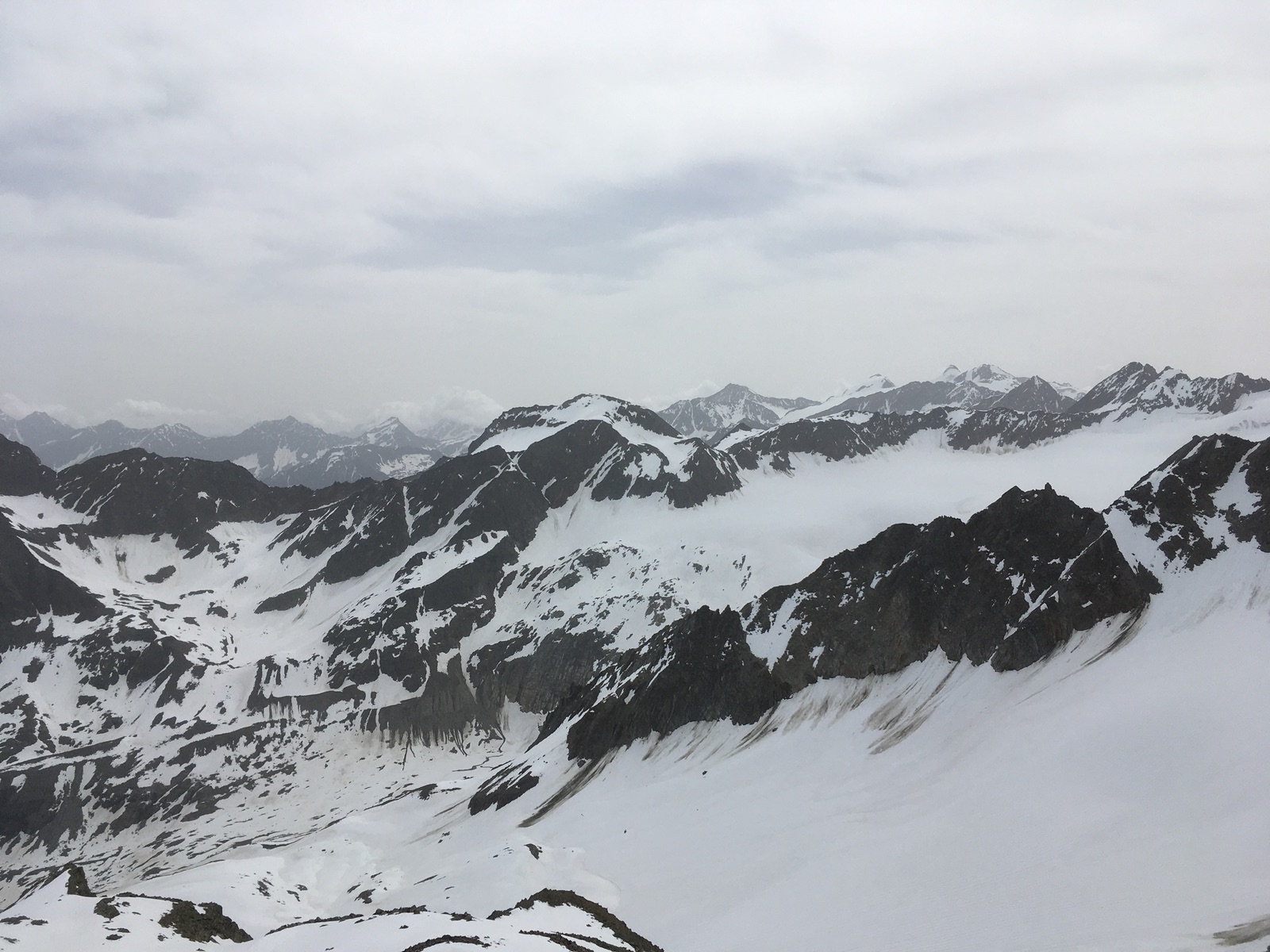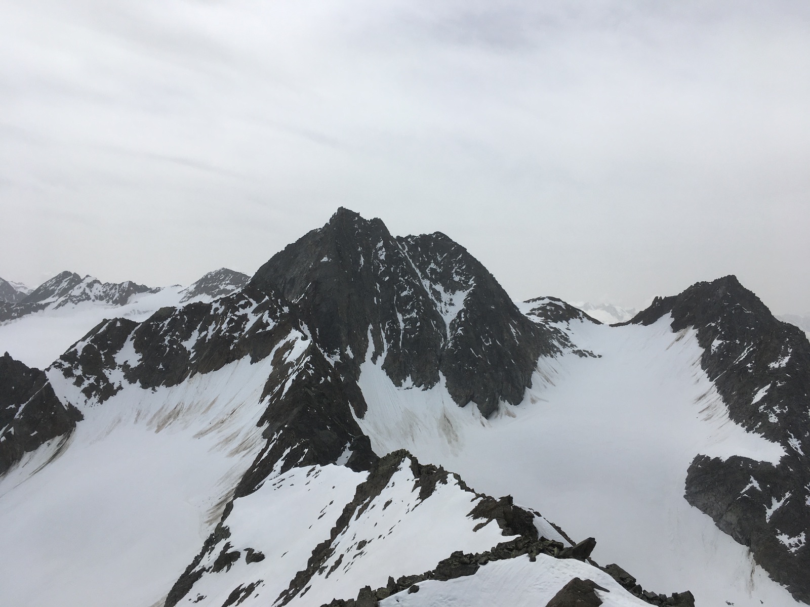 Da die Nacht bedeckt und warm gewesen war, war der Sommerschnee heute (anders als gestern) nicht gefroren. Also konnte alles ohne Harscheisen gegangen werden und auch für die letzten ca. 30 Hm zum Gipfel waren der mitgeschleppte Pickel und die Steigeisen nicht erforderlich. Leider auch heute recht diesig, aber für eine schöne Schau zu den umliegenden Gipfeln hat es gereicht.