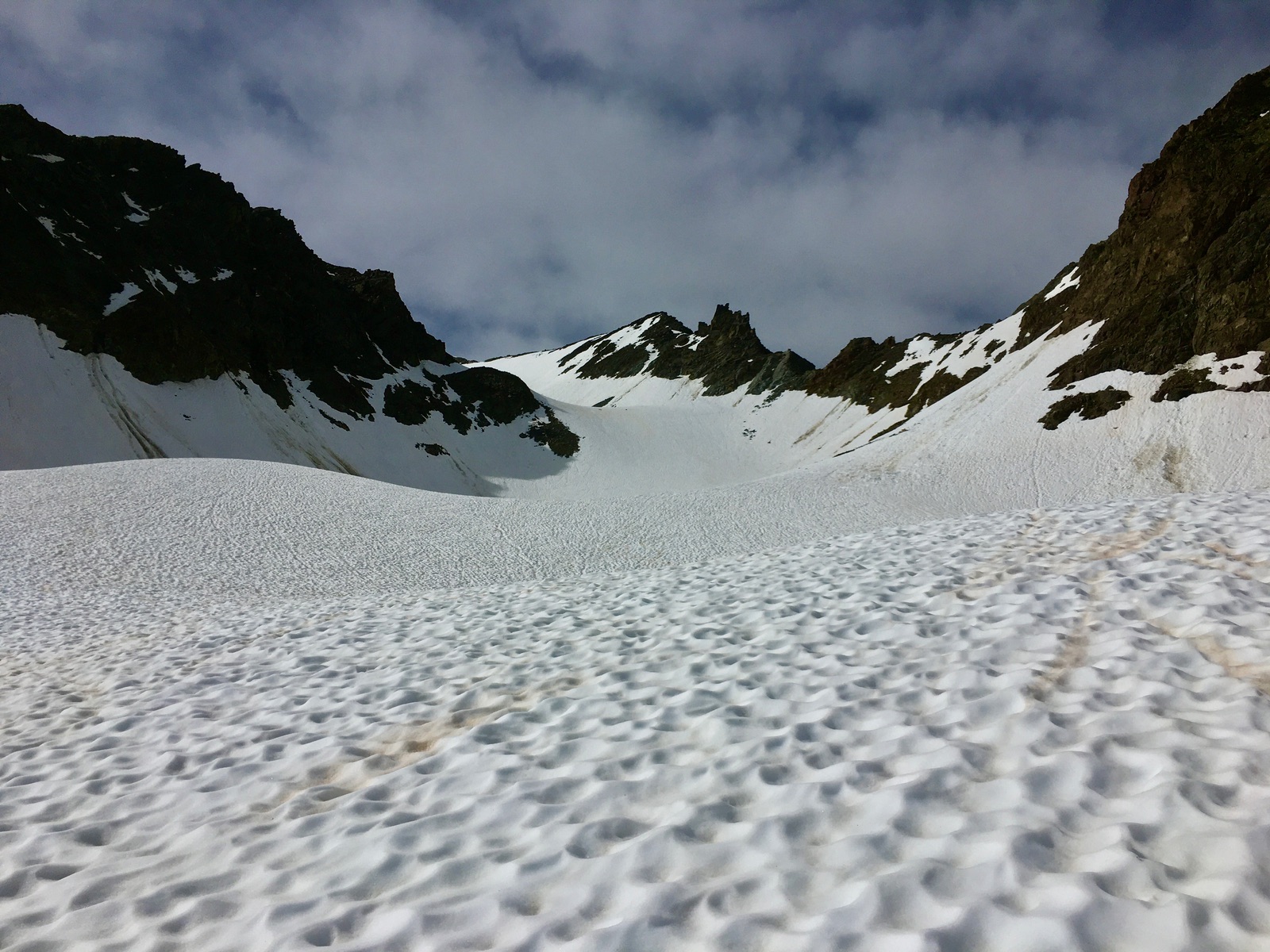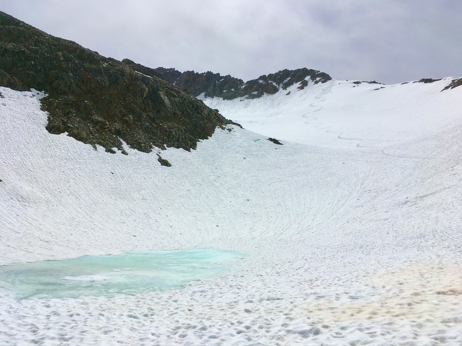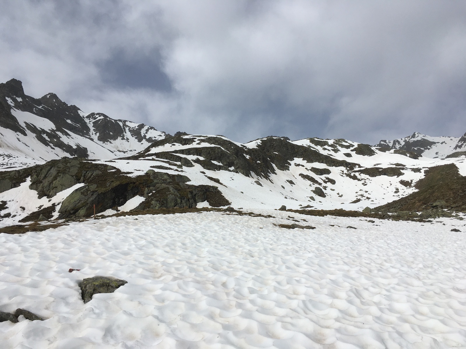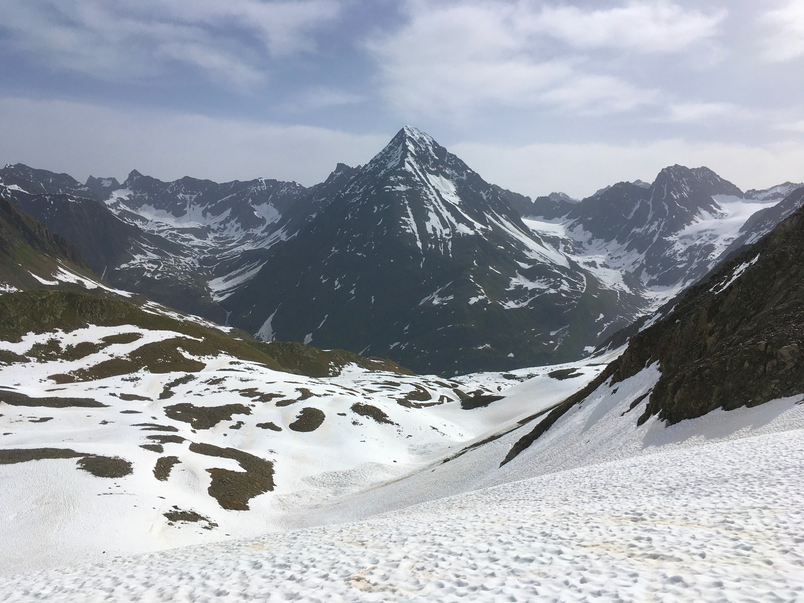 Da die Nacht bedeckt und warm gewesen war, war der Sommerschnee heute (anders als gestern) nicht gefroren. Also konnte alles ohne Harscheisen gegangen werden und auch für die letzten ca. 30 Hm zum Gipfel waren der mitgeschleppte Pickel und die Steigeisen nicht erforderlich. Leider auch heute recht diesig, aber für eine schöne Schau zu den umliegenden Gipfeln hat es gereicht.
