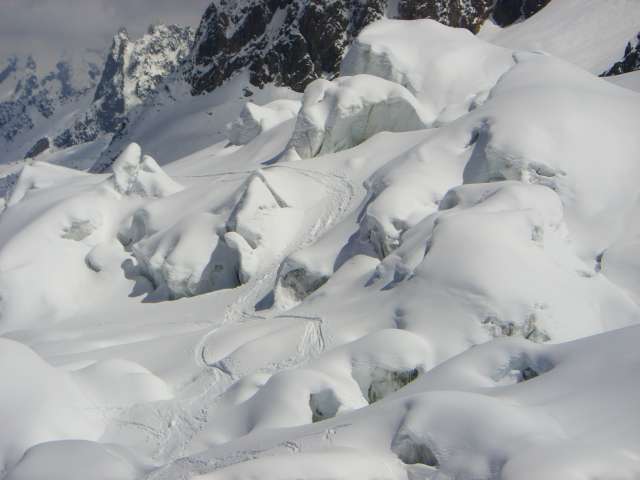 Tourenverhältnisse: am Do mit der Midi Bahn zur Mittelstation und in ca 3,5 Stunden zur Grand Mulet aufgestiegen: viel Neuschnee, der sehr weit runterreicht, Schnee tlw noch weich was die steilen Querungen erleichtert, eine harte Rinne kurz vor dem Gletscherbruch. diesen auf schmalen Spaltenbrücken überwunden und über eher weichen Schlussaufstieg zur Hütte. am Fr bei perfekten Verhältnissen und breiter Spur über Petit und Grand Plateau zum Vallot-Biwak wo mir der Föhn zu heftig wurde (hatte Angst dass es mich vom Bosses-Grat weht :-( )
