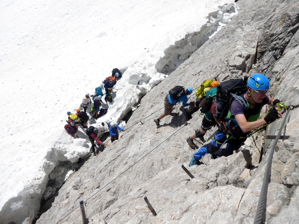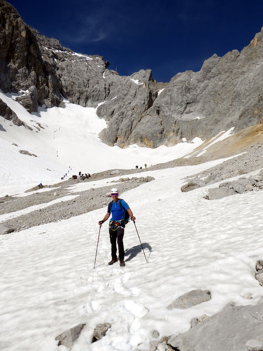 Und so gut wie heute (natürlich auch in den nächsten Tagen) sind die Verhältnisse nicht immer. Man kann sie getrost als optimal bezeichnen. Nach er erfrischenden Klamm um 7.45 Uhr ein Frühstücksradler (5,20 Euro) in der neuen Höllentalangerhütte, weiter zu Leiter un Brett (wo der Stau sich vor uns wie von Geisterhand aufgelöst hatte). Über den grünen Buckel zum Gletscher, der früh beginnt und eine gute, teils etwas steil angelete Stapfspur hat. Ich bin alles ohne Steigeisen/PIckel gegangen - wer sich unsicher fühlt, sollte nicht so spartanisch unterwegs sein. Die Randkluft: am oberen (linken) Einstieg perfekt einfach, die beiden Varianten rechts davon nicht erreichbar. 8 Minuten Stau an der Randkluft das war für solch einen Schönwettersamstag okay. Danach, im Klettersteig, gab es einige Bremser; u.a. einen Holländer, der zusätzlich zum Klettersteigset eine Steigklemme ins Drahtseil einhängte und eeeewig brauchte. Da half nur beherztes und ungesichertes Überholen - nach sechseinhalb Stunden Aufstieg war der Gipfel erreicht, ohne die Stockungen wäre es schneller gegangen.