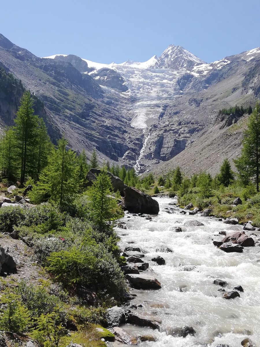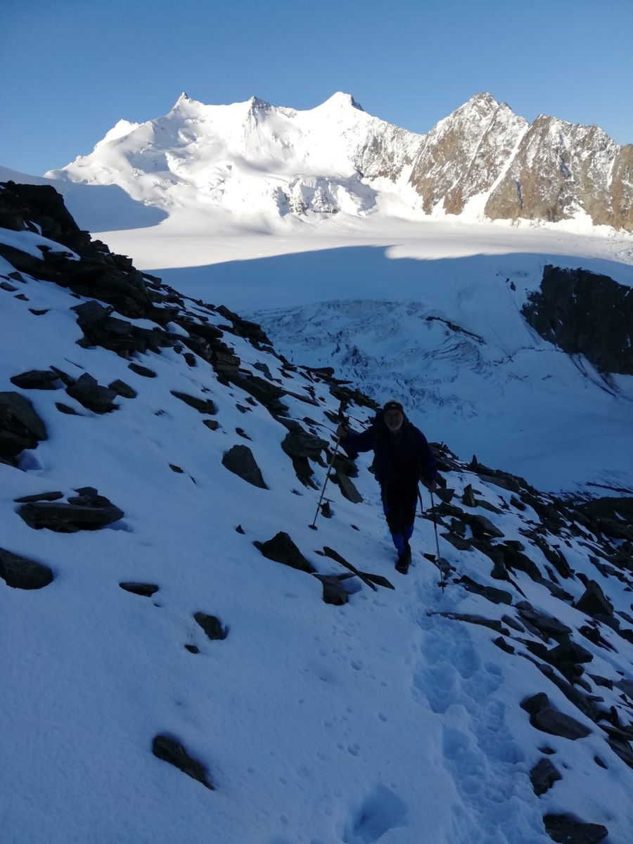 Von Gasenried zur Bordierhütte. Im unteren Teil schöner Steig durch Wald, später durch ein Tälchen neben der Moräne, dann auf der Moräne. Auf ca. 2700m flache Querung des Gletschers, halb geröllbedeckt, halb aper, streckenweise eisschlaggefährdet. Unangenehm zu gehen. Zum Schluss über Gletscherschliffplatten zur Hütte.