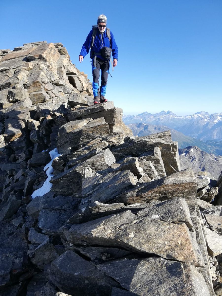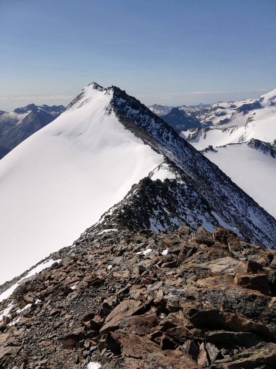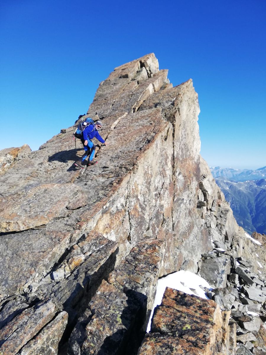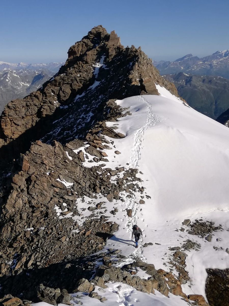 Frühstück für diese Tour um 4.00 Uhr. Bei Dunkelheit auf Steig durch Blockgelände auf einen Sattel und weiter auf Steig durch Geröll bis zum Groß Bigerhorn. Momentan noch leicht verschneit ab ca. 3300m, wird jetzt täglich weniger. Vom Bigerhorn zum Balfrin zunächst Turnerei am Felsgrat, max. I, später ein steiler Schnee-/Eisrücken zum Nordgipfel des Balfrin. Hier Steigeisen und Pickel notwendig. Übergang vom Nord- zum Hauptgipfel wieder teils leichte Kletterei, teils Schneestapferei.