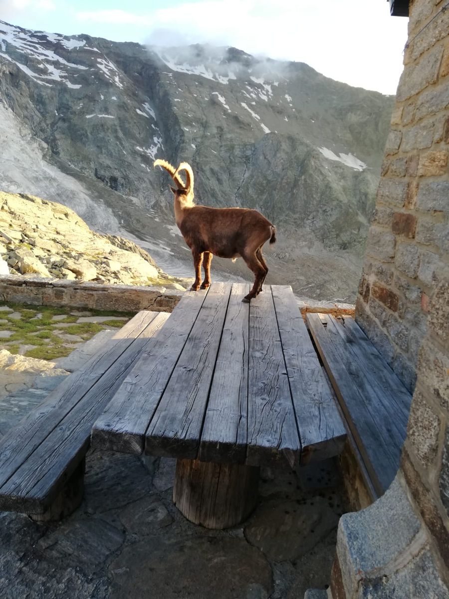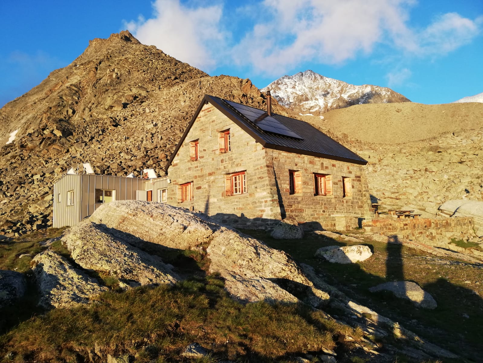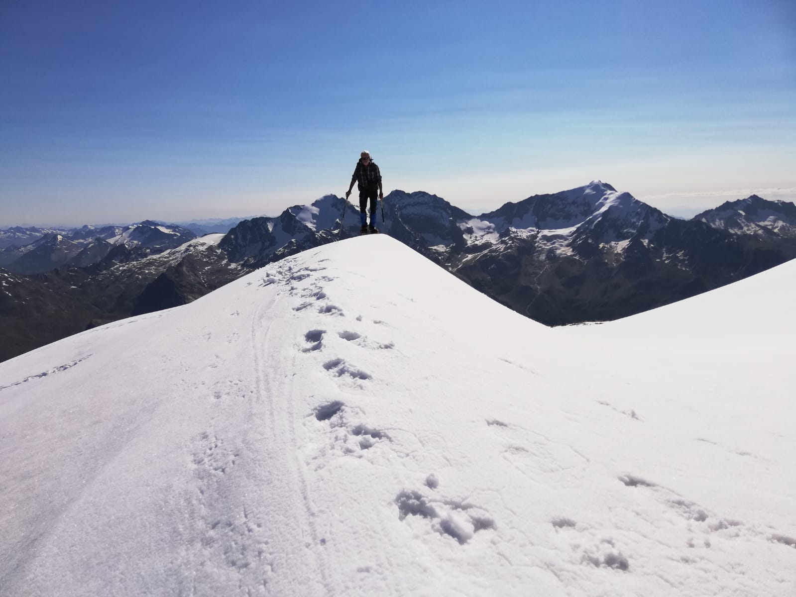 Frühstück für diese Tour um 4.00 Uhr. Bei Dunkelheit auf Steig durch Blockgelände auf einen Sattel und weiter auf Steig durch Geröll bis zum Groß Bigerhorn. Momentan noch leicht verschneit ab ca. 3300m, wird jetzt täglich weniger. Vom Bigerhorn zum Balfrin zunächst Turnerei am Felsgrat, max. I, später ein steiler Schnee-/Eisrücken zum Nordgipfel des Balfrin. Hier Steigeisen und Pickel notwendig. Übergang vom Nord- zum Hauptgipfel wieder teils leichte Kletterei, teils Schneestapferei.
