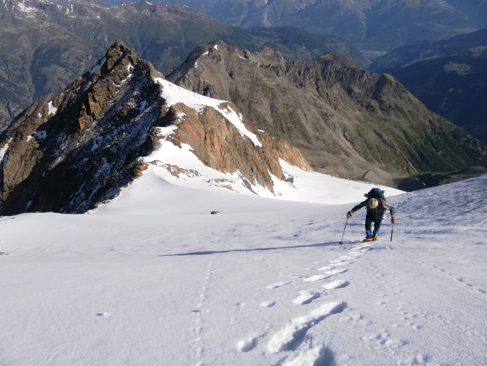 Wir sind den gleichen Weg zurück, man könnte auch über den Südgrat einfach zum Riedpass absteigen und über den Gletscher zurück, dann mit kompletter Gletscherausrüstung.
