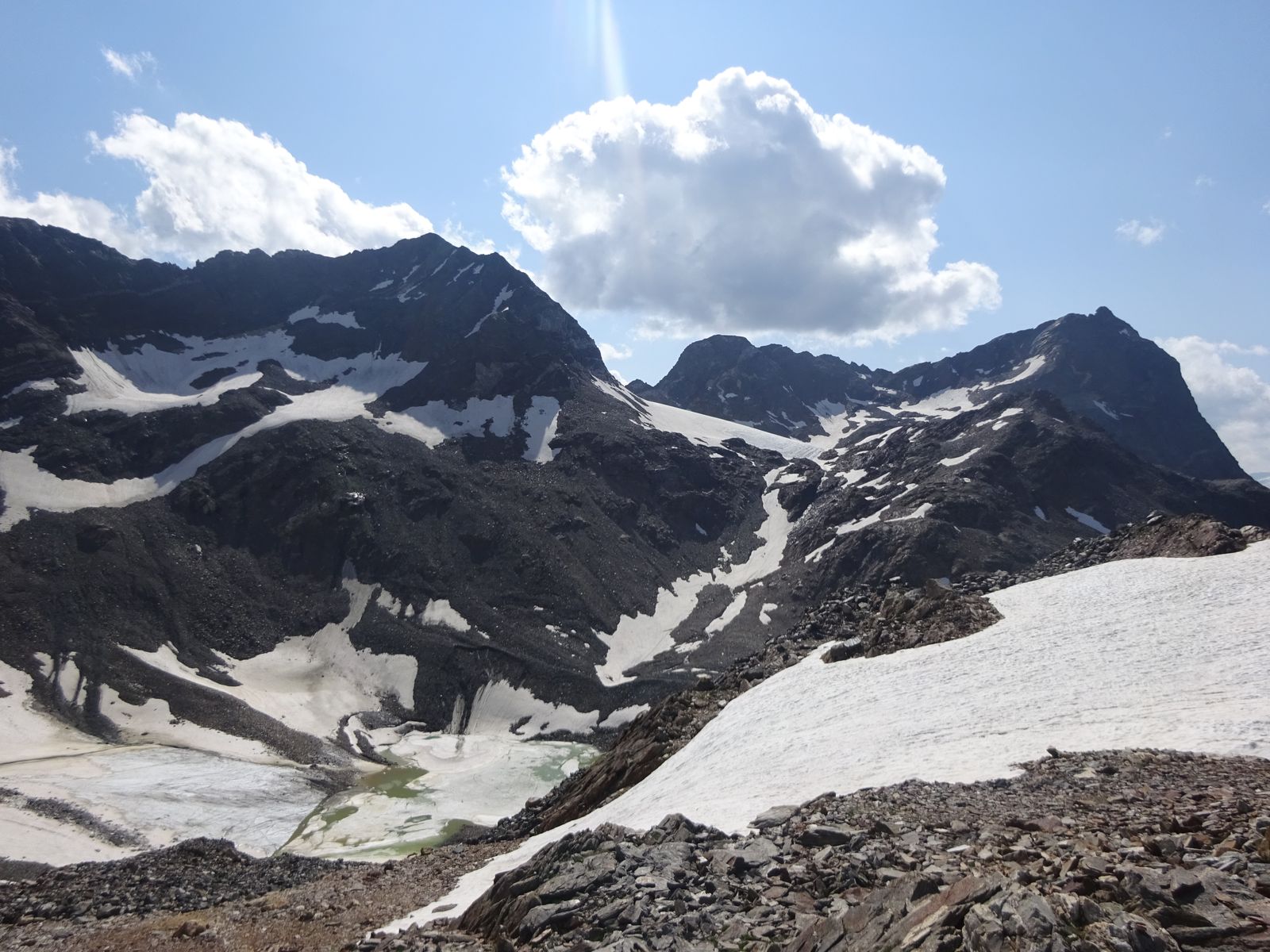 Am Samstag ging es auf einem wiederum schön angelegten Steig durch eine Steinwüste zunächst zum Fernerköpfl, wo sich ein gewaltiger Blick zum Rieserferner und den ihn umrahmenden Gipfeln bietet. Das Panorama ist auf der ganzen Tour eh einfach der Hammer, da die Rieserferner-Gruppe ja zwischen dem Alpenhauptkamm und den Dolomiten liegt und auch die Hohen Tauern nicht fern sind. Von dort haben wir über den Gletscher den kurzen Abstecher zum Magerstein gemacht, um anschließend wiederum auf dem Gletscher, das Fernerköpfl und die anschließenden felsigen Erhebungen umgehend, zur Scharte unter dem Schneebigen Nock zu queren. Ab hier im Fels bis zum Gipfel und auf der anderen Seite mit einigen Schneefeldern zur Hochgall-Hütte (auch Rifugio Roma bzw. Kasseler Hütte genannt), über den Artur-Hartdeggen-Weg nach Rein und schließlich zurück zum PP.