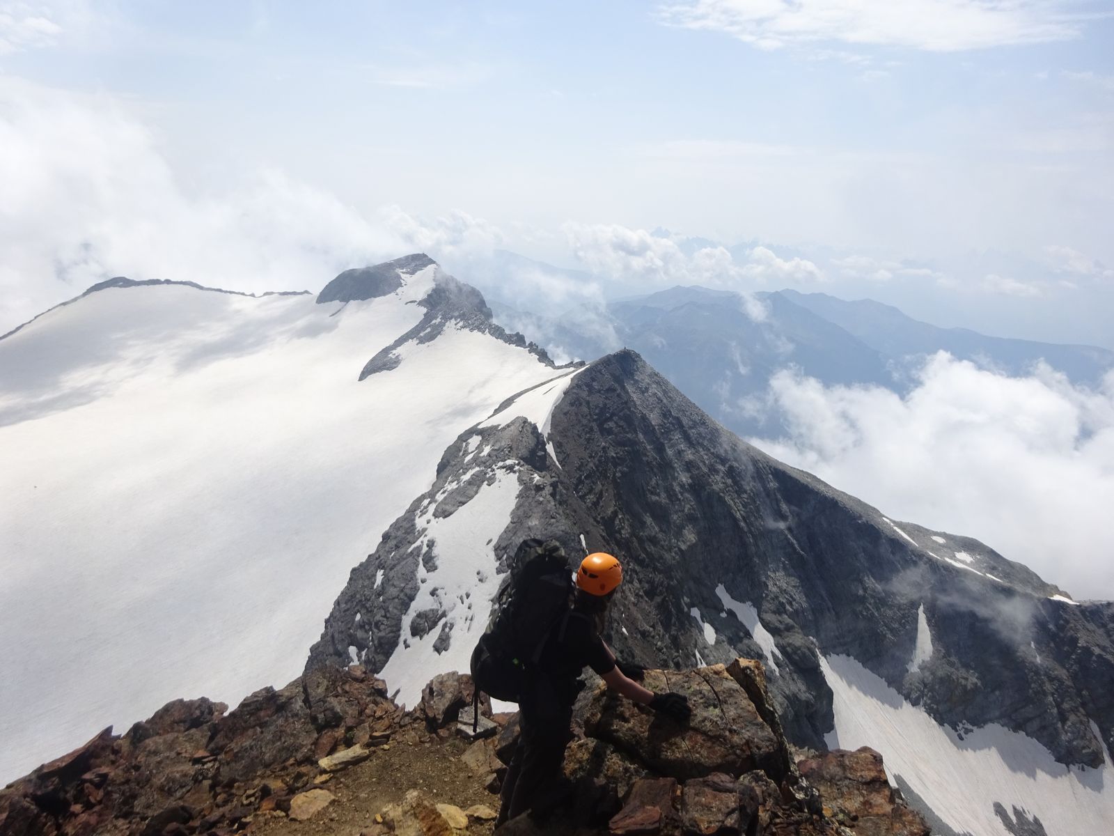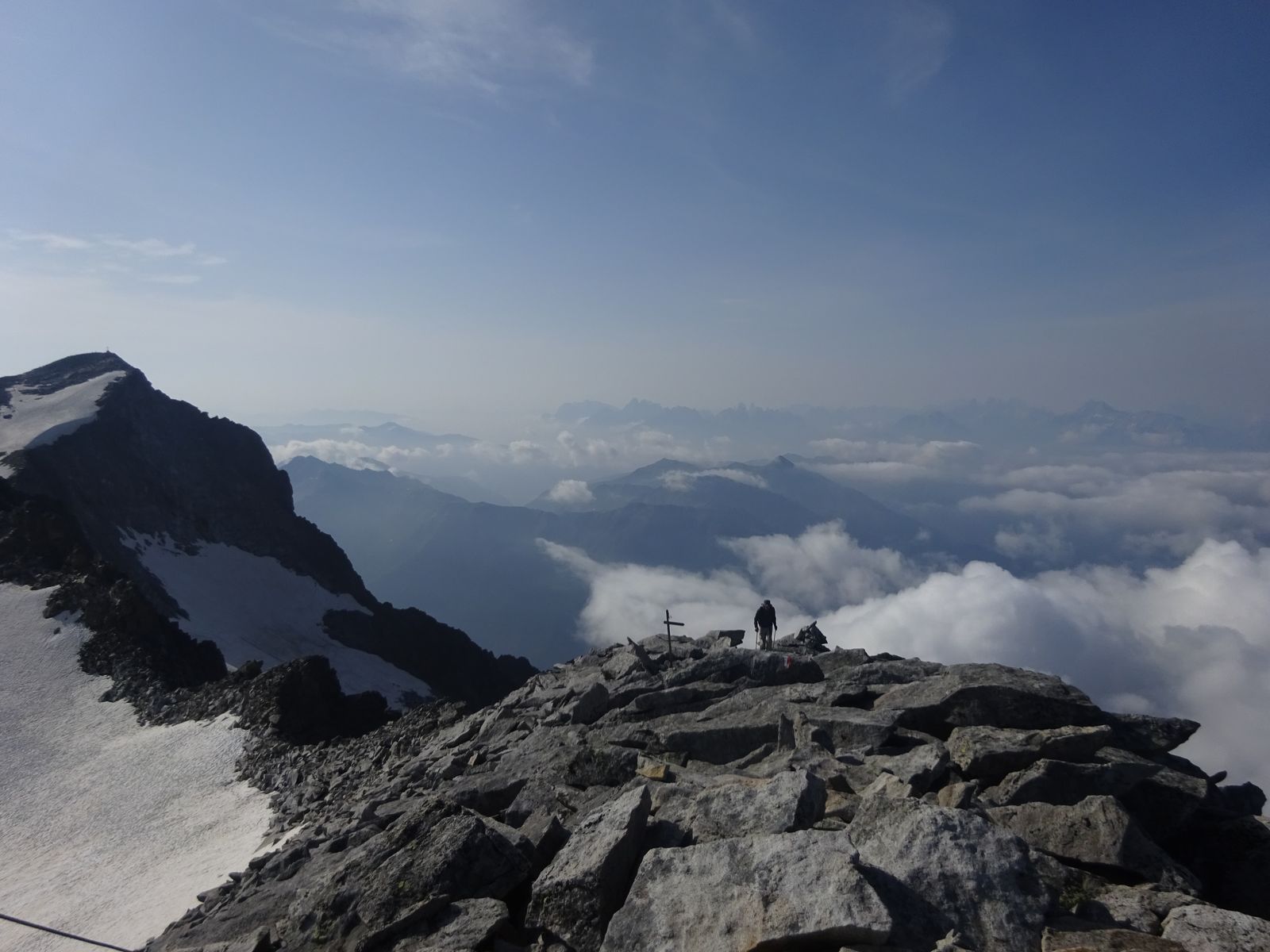 3) Schneebiger Nock: Der Anstieg ist ziemlich anspruchsvoll; es gibt mehrere ausgesetzte Kletterstellen in II. Grad in sehr unzuverlässigem Fels, dazu eine kurze, mit einer Kette gesicherte, überhängende Passage. Helm wichtig (T5+)! Der Abstieg zur Hochgall-Hütte ist zwar deutlich einfacher (T4), aber über fast 1000 Höhenmeter aufgrund des brüchigen Geländes, das verschwindende Gletscher eben gerne hinterlassen, unangenehem. Überwiegend ist der Abstieg (,der den "Normalweg" auf den Nock darstellt,) gut mit Steinmandln markiert, aber gerade oben am Grat ist das nicht der Fall: Vom Gipfel bis zum nächsten Steinmann (ca. 15 Minuten) ist nichts markiert, was gerade bei schlechter Sicht (ich spreche aus Erfahrung von einer Tour vor drei Jahren) sehr problematisch sein kann. Grundsätzlich bleibt man am Grat, nur einmal steigt man (im Abstiegssinn) rechts über eine erdige Rinne, die man aber vor ihrem Ende wieder nach links verlassen muss, um einen Felsblock herum. Es sind aber vom Grat aus immer wieder Trittspuren in die Flanken zu erkennen, die offensichtlich von Irrwegen anderer herstammen - oiso Obacht!