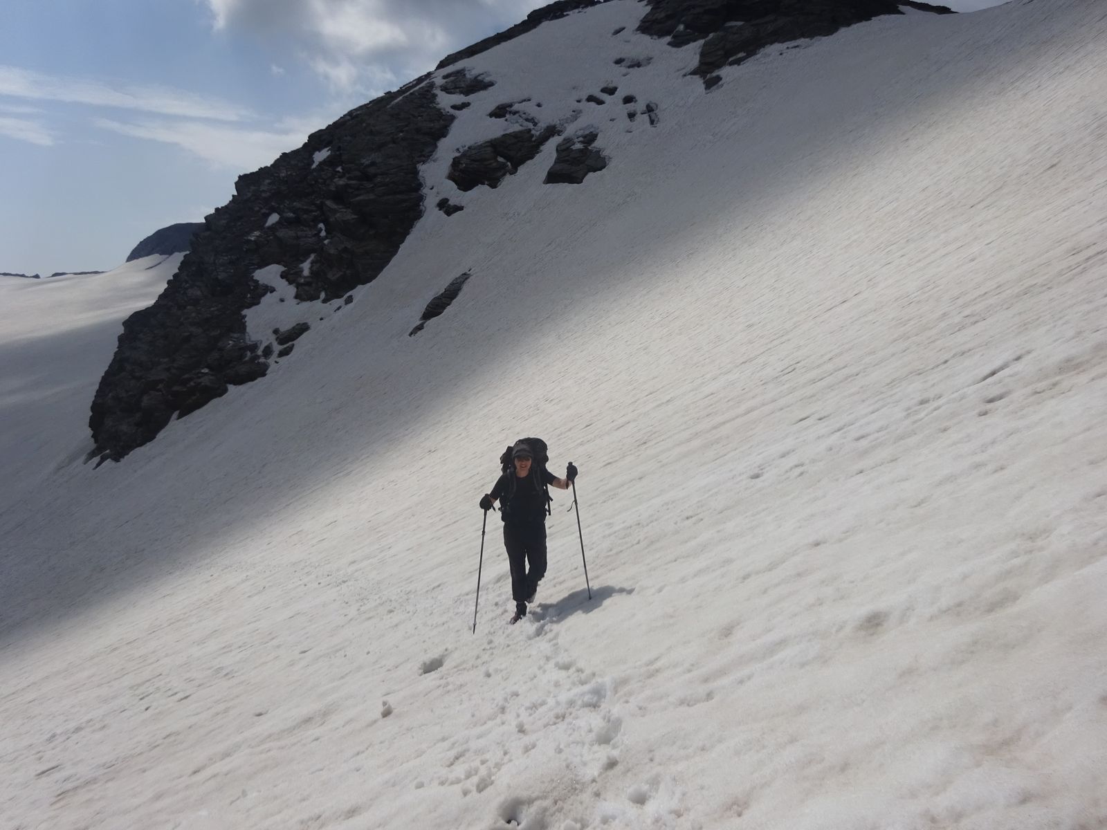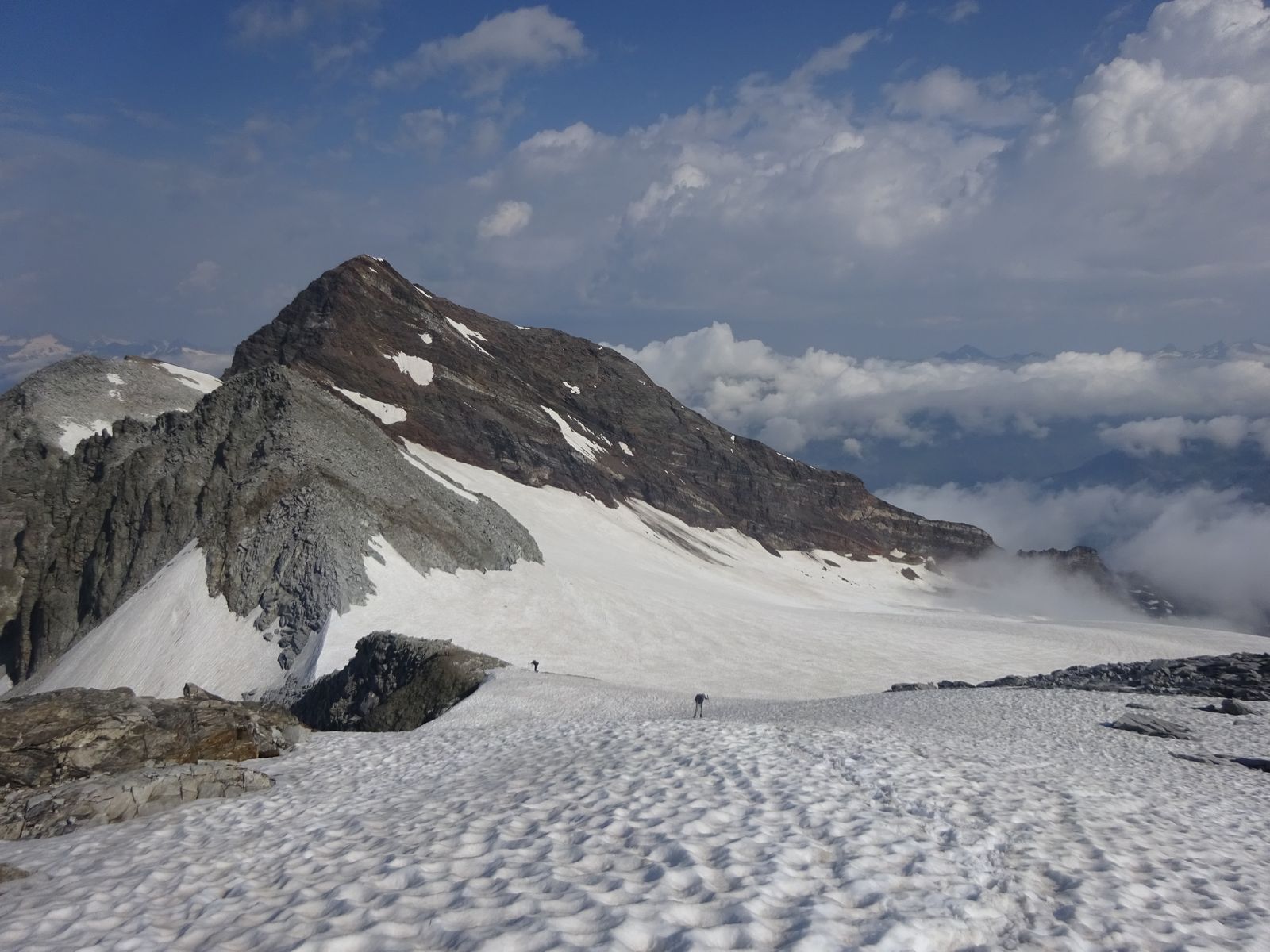 2) Gletscherpassagen total flach und einfach: In der Führerliteratur (z.B. Hans Paul Menara, dessen Bücher ich sehr schätze) wird beim Magerstein bzw. zum Rieserferner-Gletscher gerne geschrieben "komplette Hochtourenausrüstung erforderlich". Das ist meines Erachtens nicht der Fall! Für den Gletscher braucht es allenfalls Grödel, wenn der Schnee gefroren ist. Ich war schon öfters hier und (fast) niemand nutzt da ein Seil, auch nicht, wenn man im Abstieg über den ganzen Gletscher zur Antholzer Scharte hinunter geht... Der Rieserferner in seinem heutigen Erscheinungsbild ist halt (leider) nichts anderes als ein flacher Plateau-Gletscher ohne Zunge und nennenswerte Spaltenzonen.